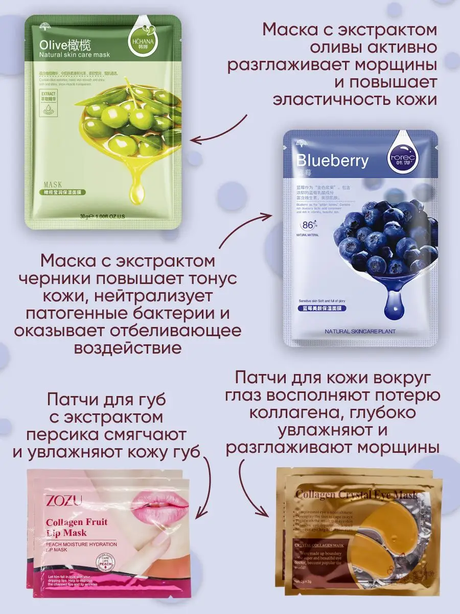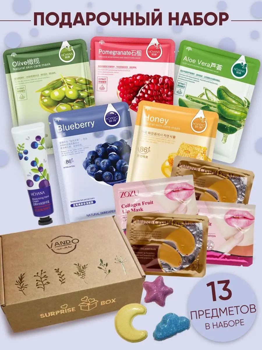 Комплектация Тканевые маски для лица-5шт; Гидрогелевые патчи для губ-2шт; Гидрогелевые патчи для глаз-2шт; крем для рук-1шт; Бомбочки для ванн-3шт
