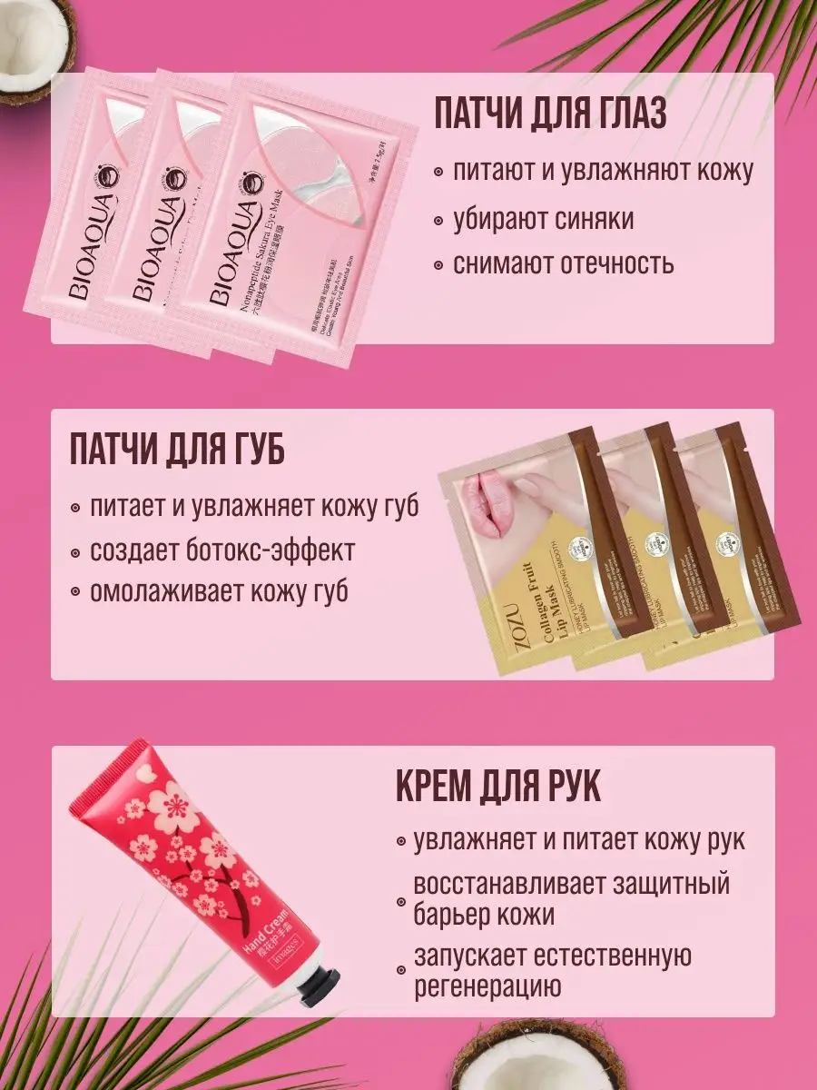 Комплектация маски для лица; пилинг-скатка; Патчи для глаз и губ; крем для рук; Повязка для волос