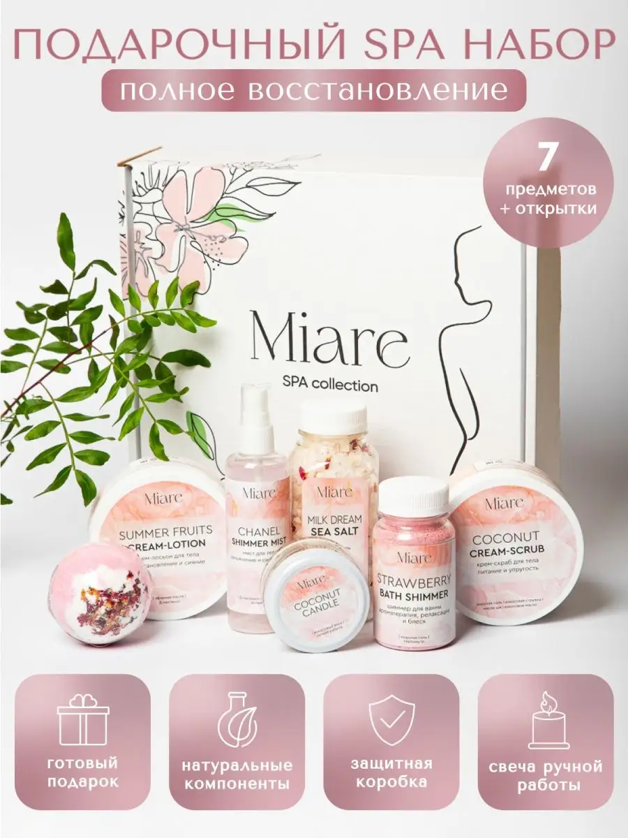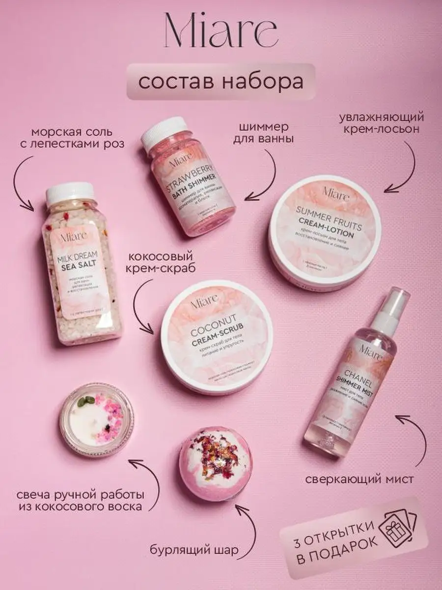 Комплектация скраб, крем-лосьон, соль для ванн, бурлящий шар для ванн, шиммер, мист, свеча, открытки