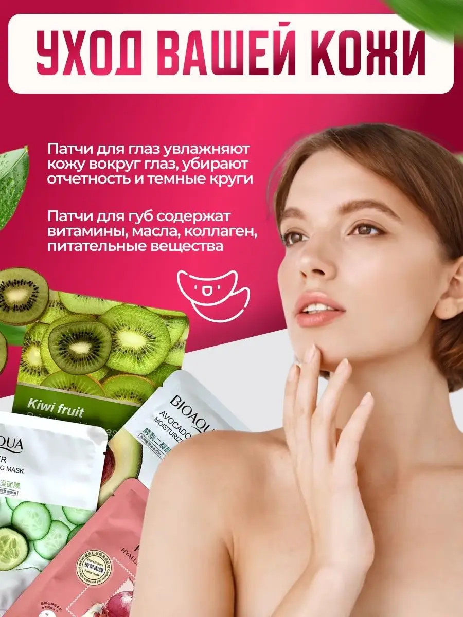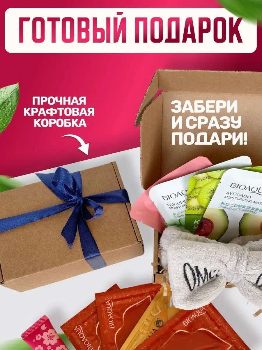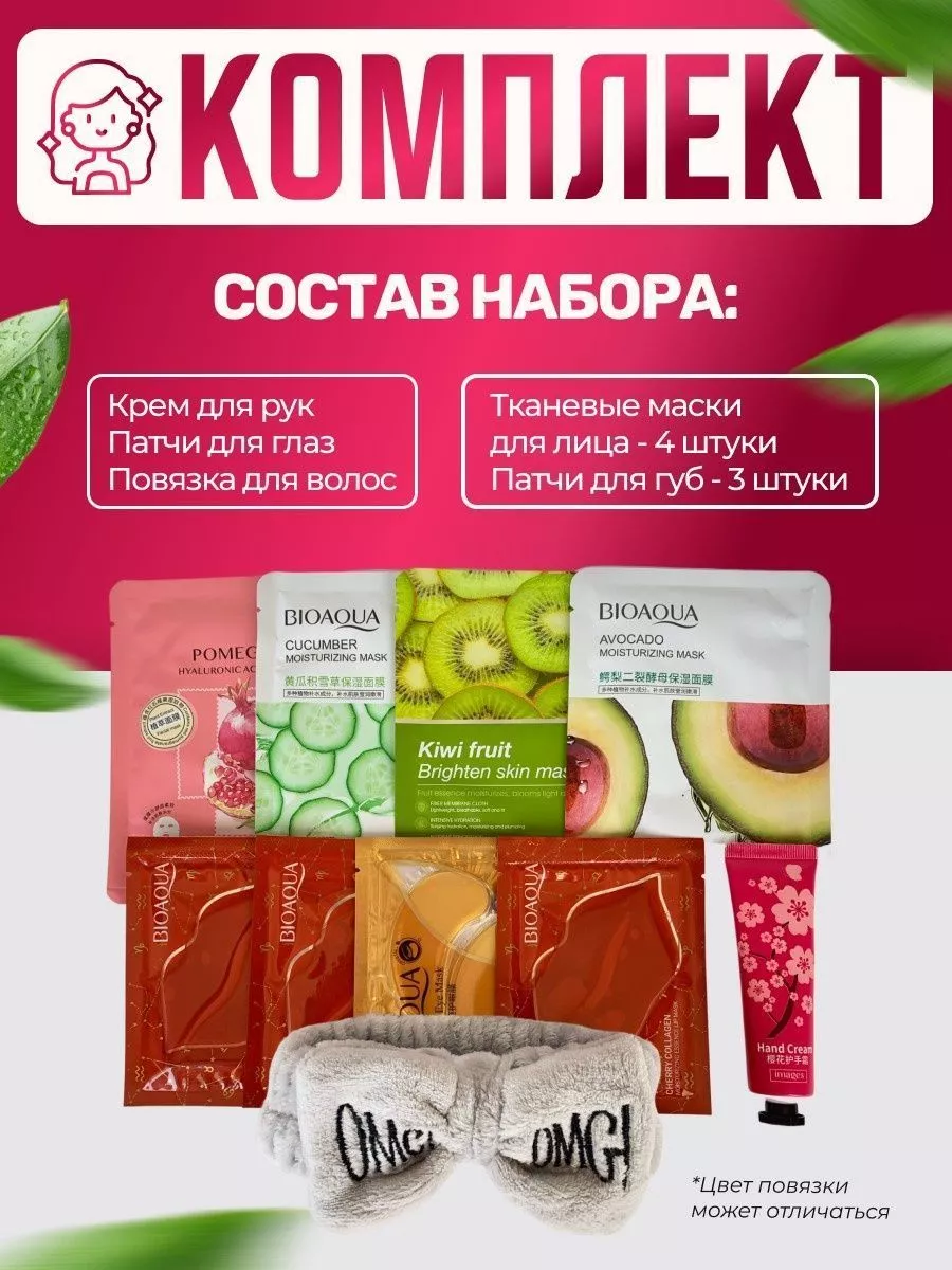 Комплектация тканевые маски для лица 4шт; патчи для губ 3шт; крем для рук; патчи для глаз; Повязка для волос