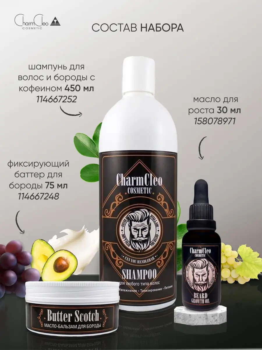 Комплектация Масло для роста бороды и усов 30 мл - 1 шт; Бальзам для бороды и усов 75 мл - 1 шт; Шампунь мужской 450 мл - 1 шт