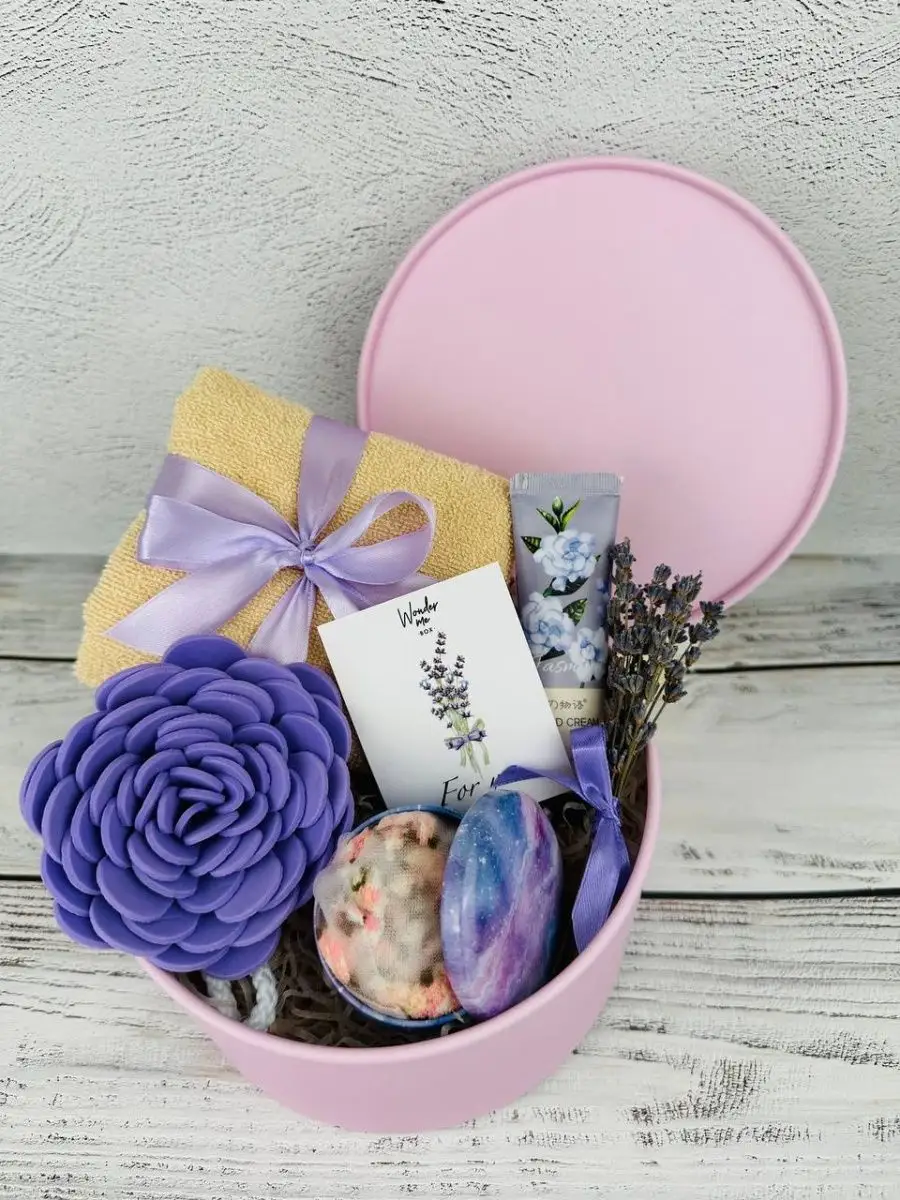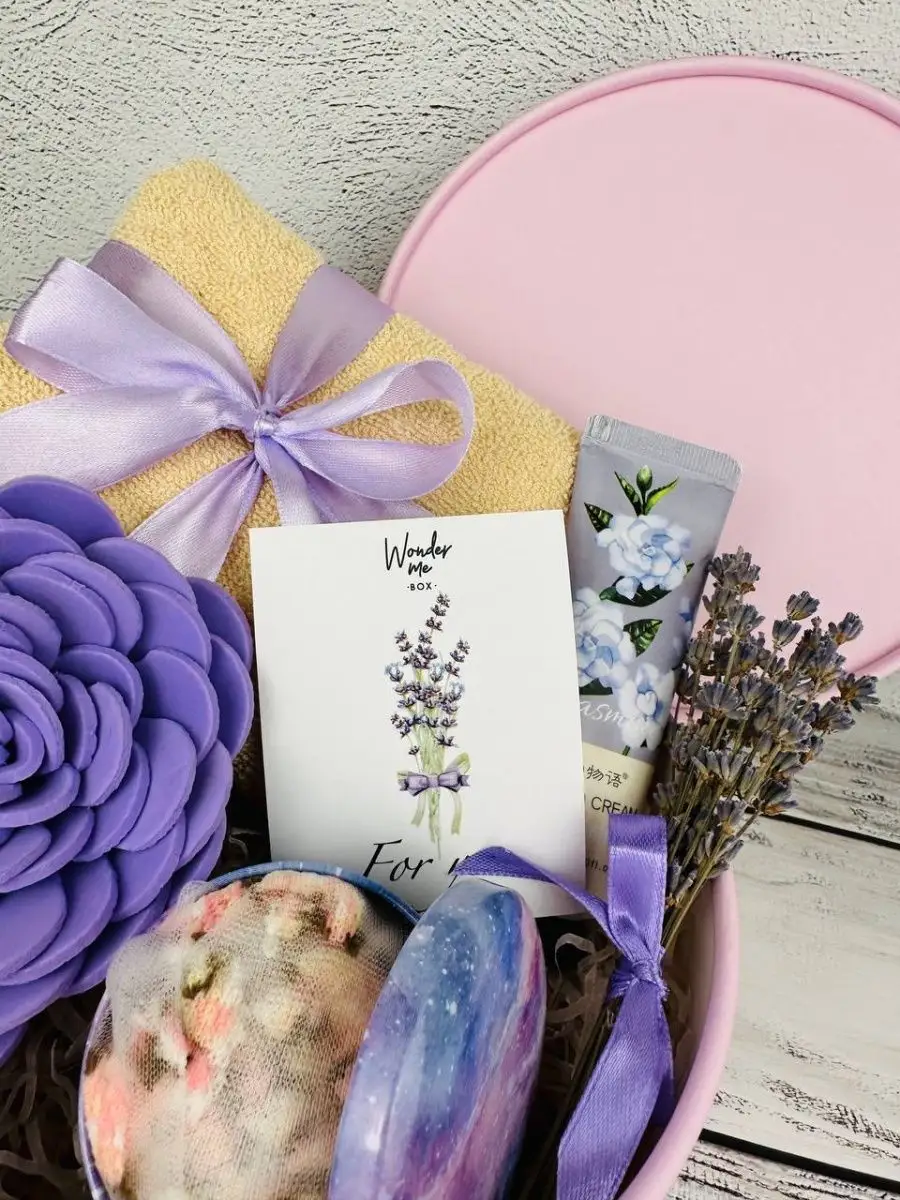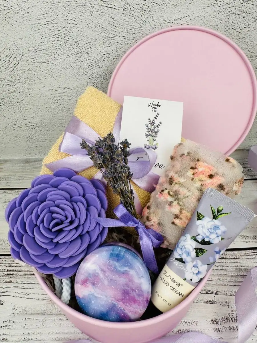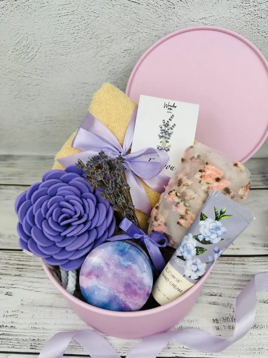Комплектация полотенце; крем для рук; шкатулка; букетик лаванды, мини-открытка, носки, губка для тела