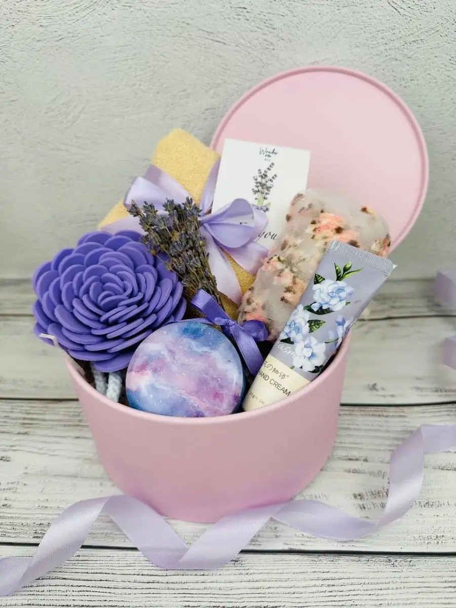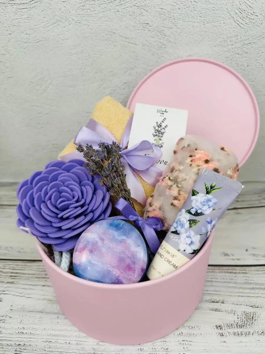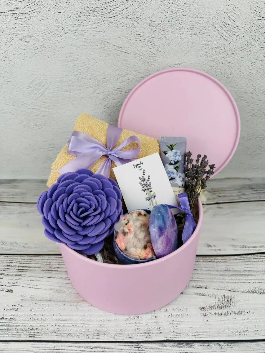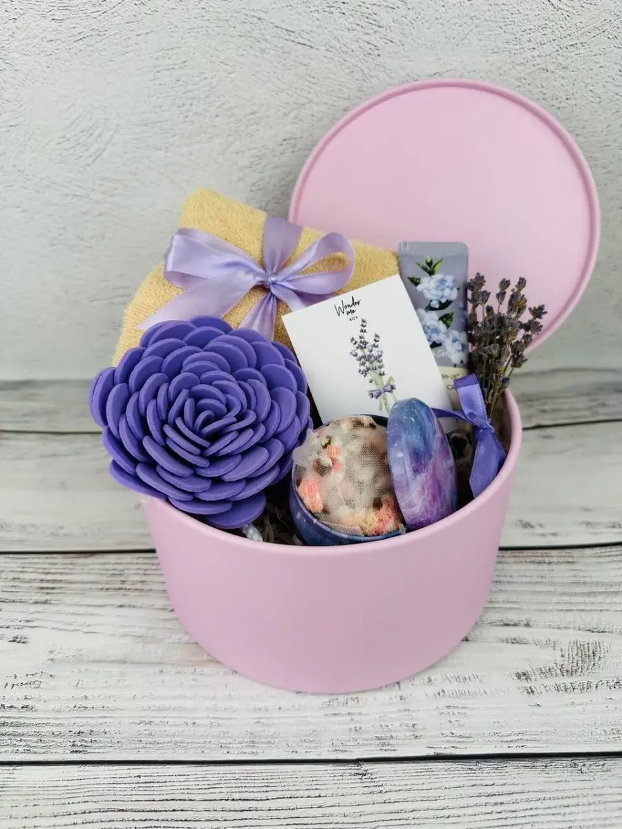 Комплектация полотенце; крем для рук; шкатулка; букетик лаванды, мини-открытка, носки, губка для тела