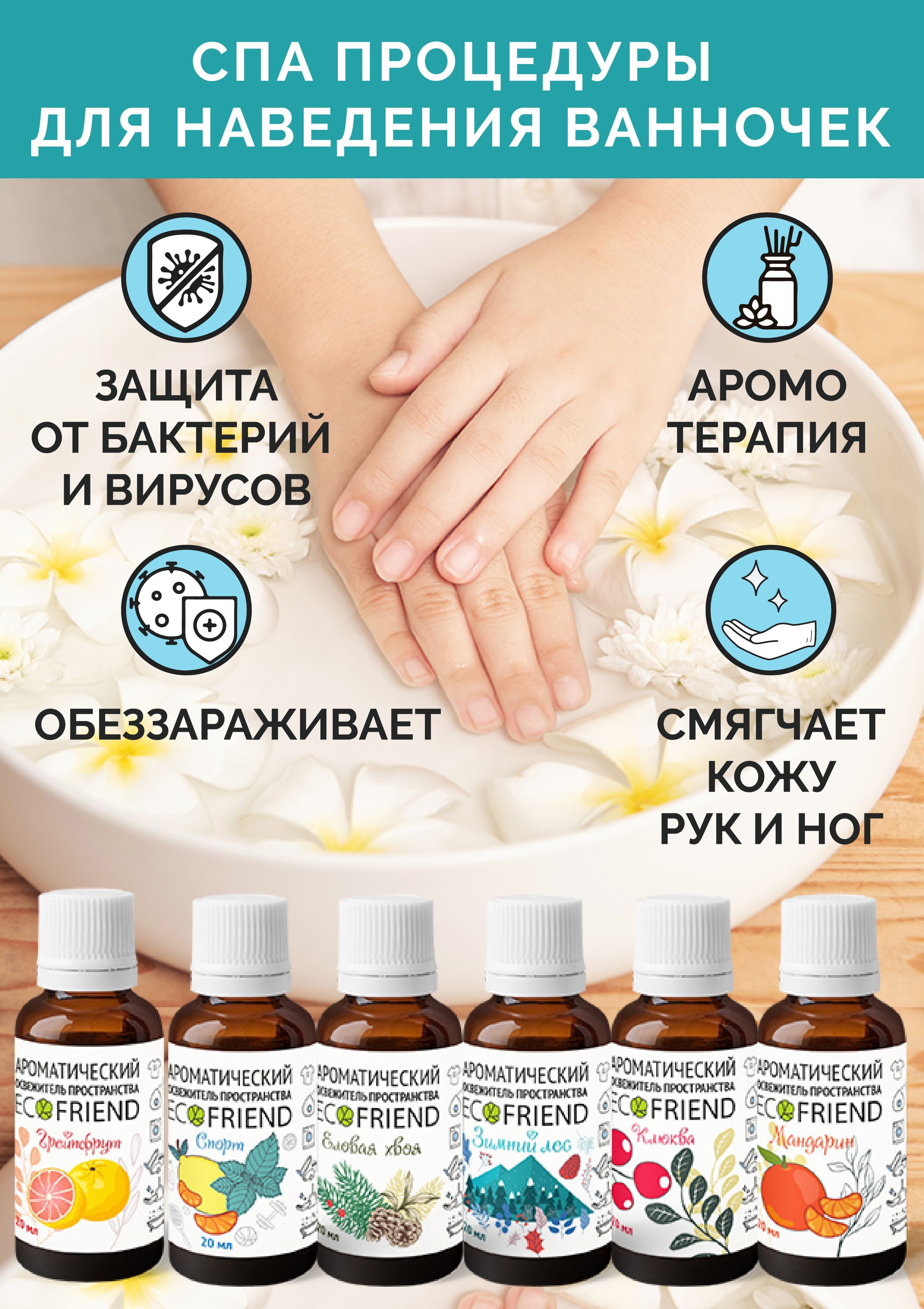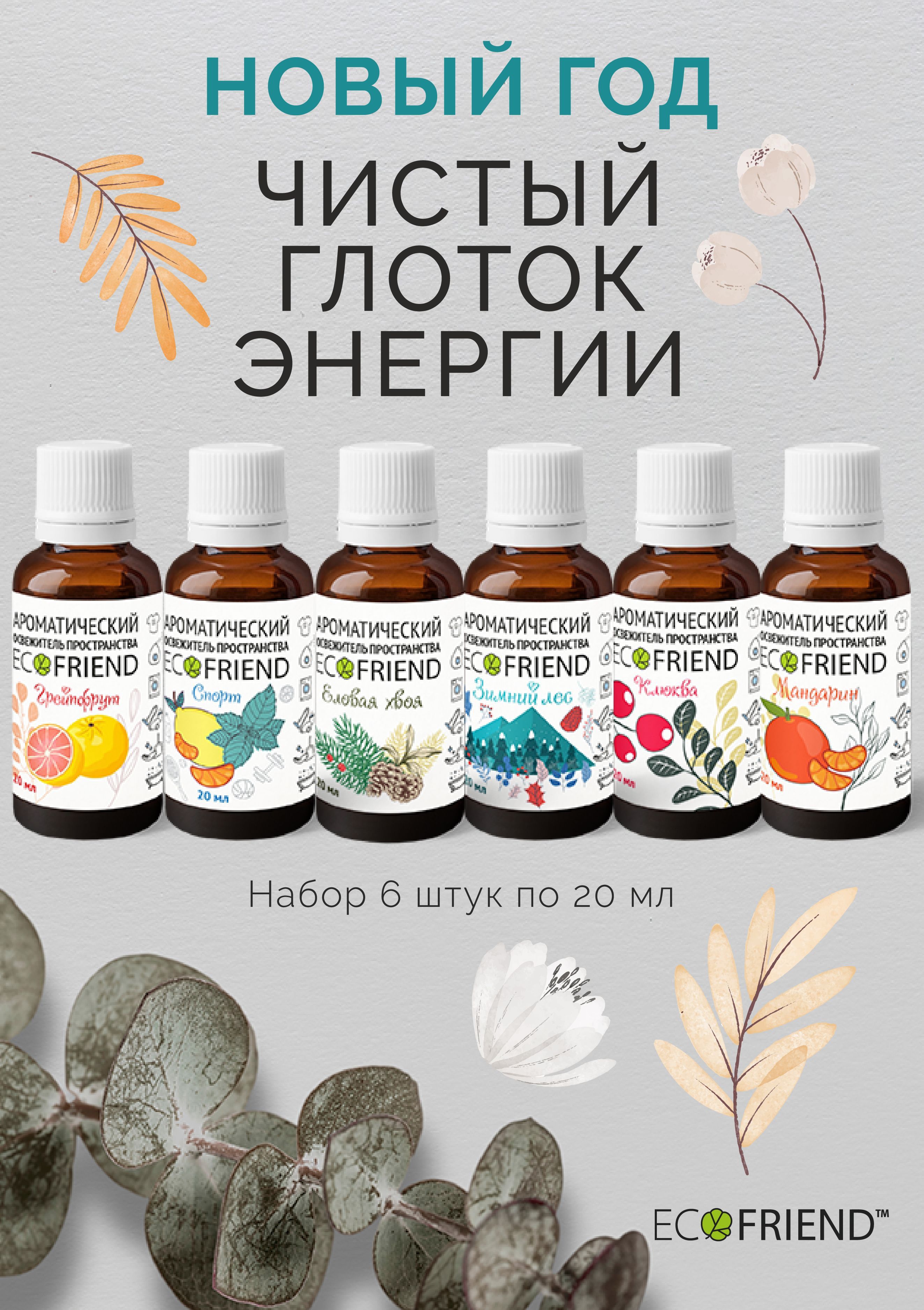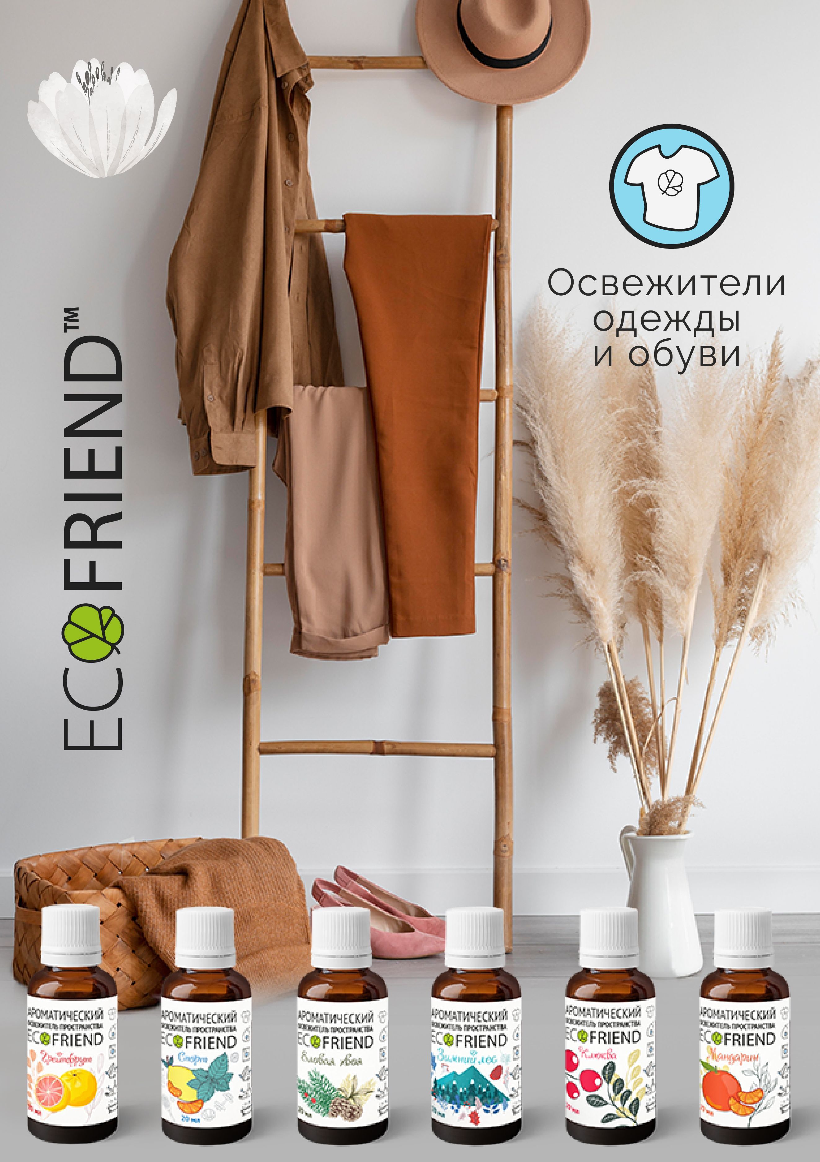 В наборе: ЛУЧШИЕ ОСВЕЖИТЕЛИ ПРОСТРАНСТВА т м "ECOFRIEND": Зимний Лес, Клюква, Грейпфрут, Мандарин, Спорт, Еловая хвоя