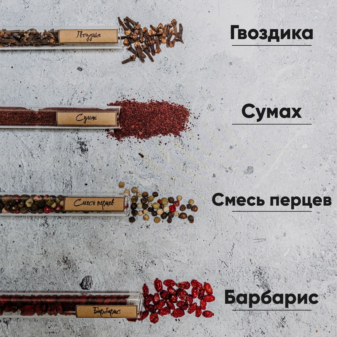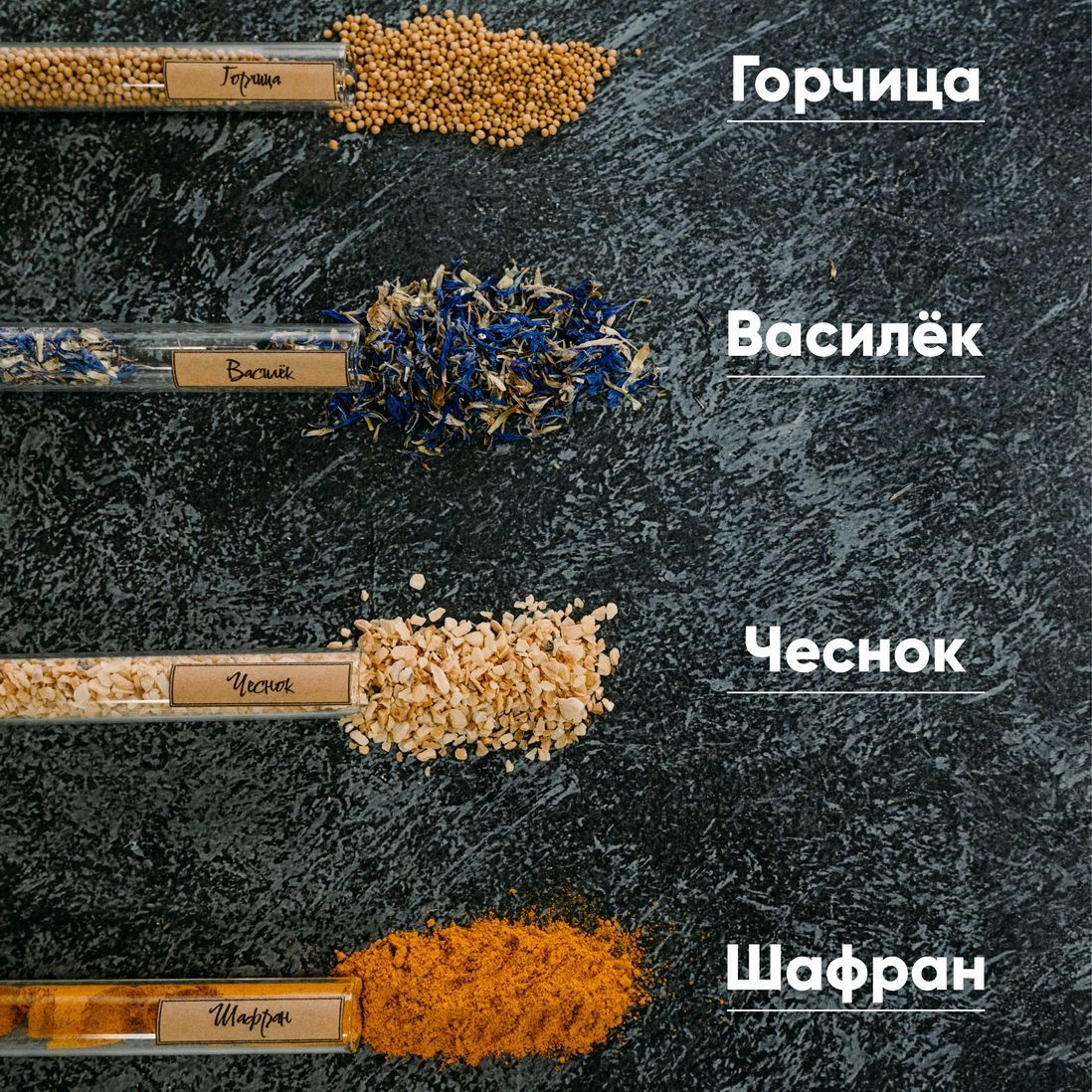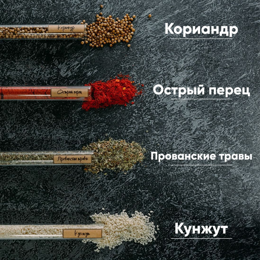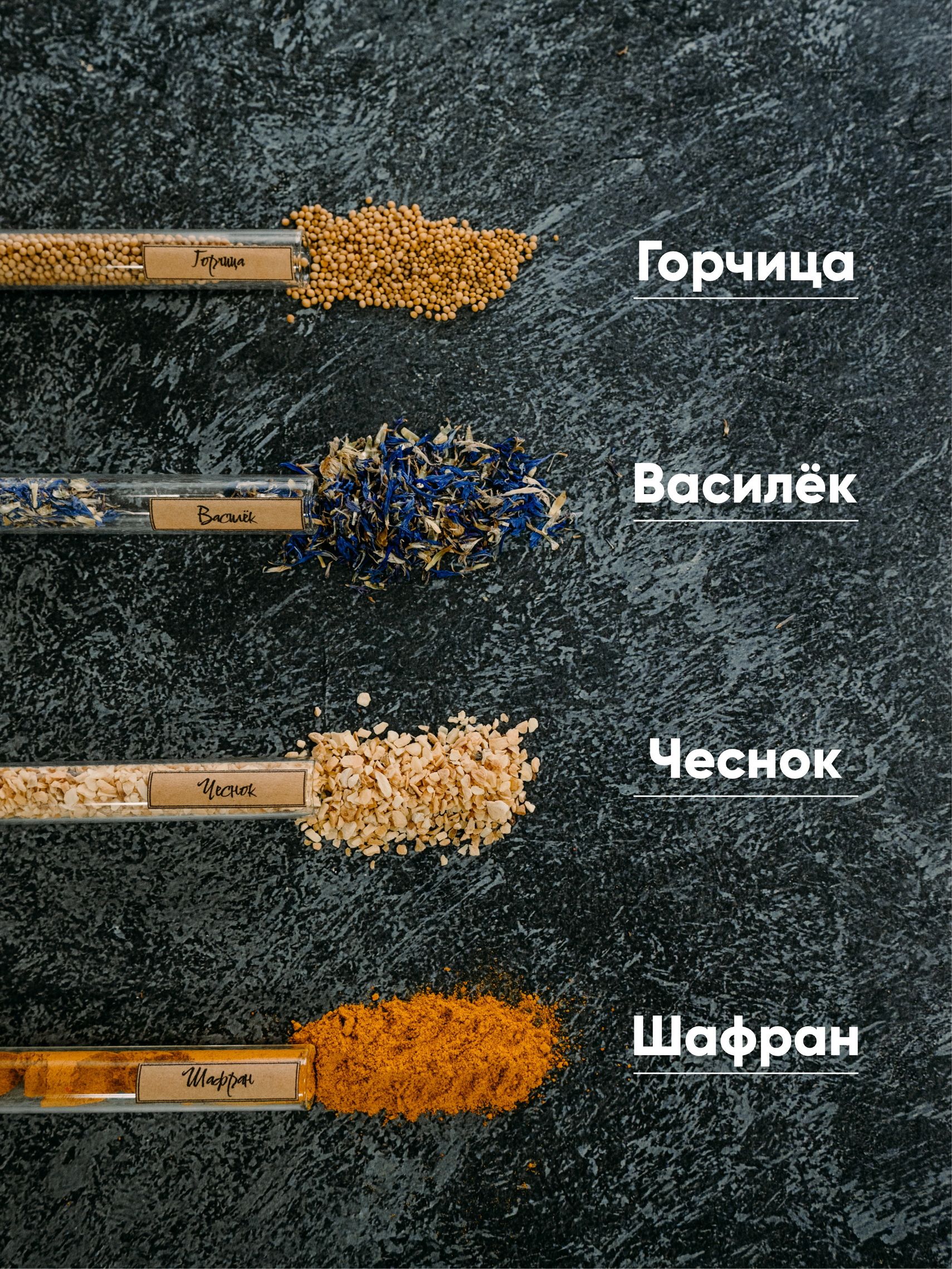 Аджика (перец острый), барбарис, василёк, горчица семя, гвоздика, кориандр семя, кунжут, прованские травы, смесь 5 перцев, сумах, шафран, чеснок.