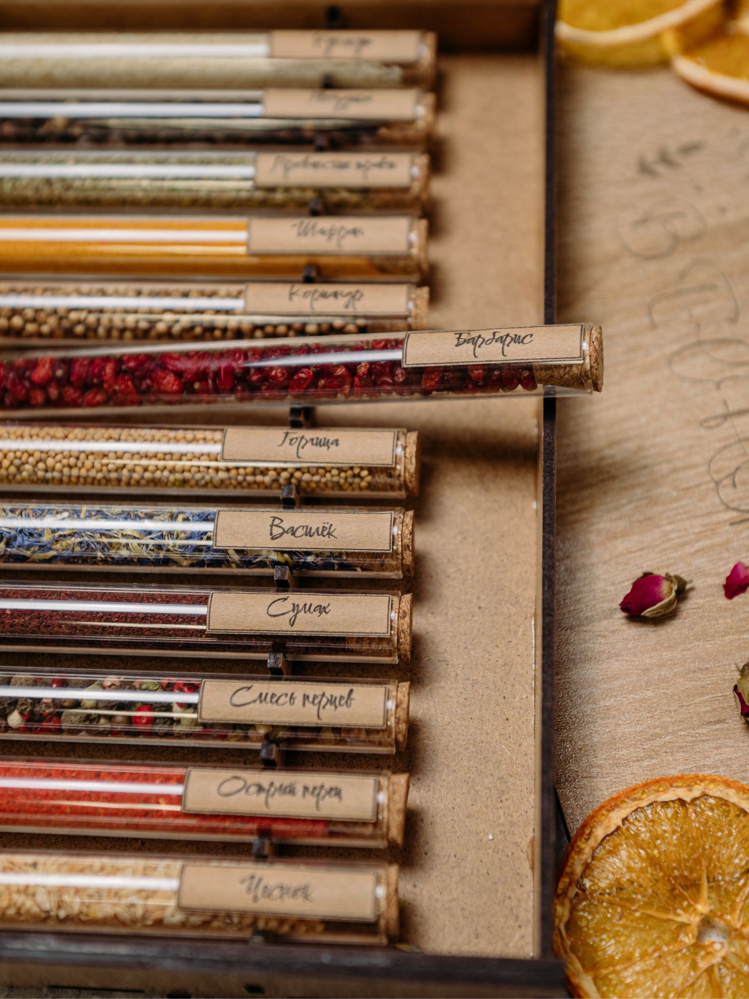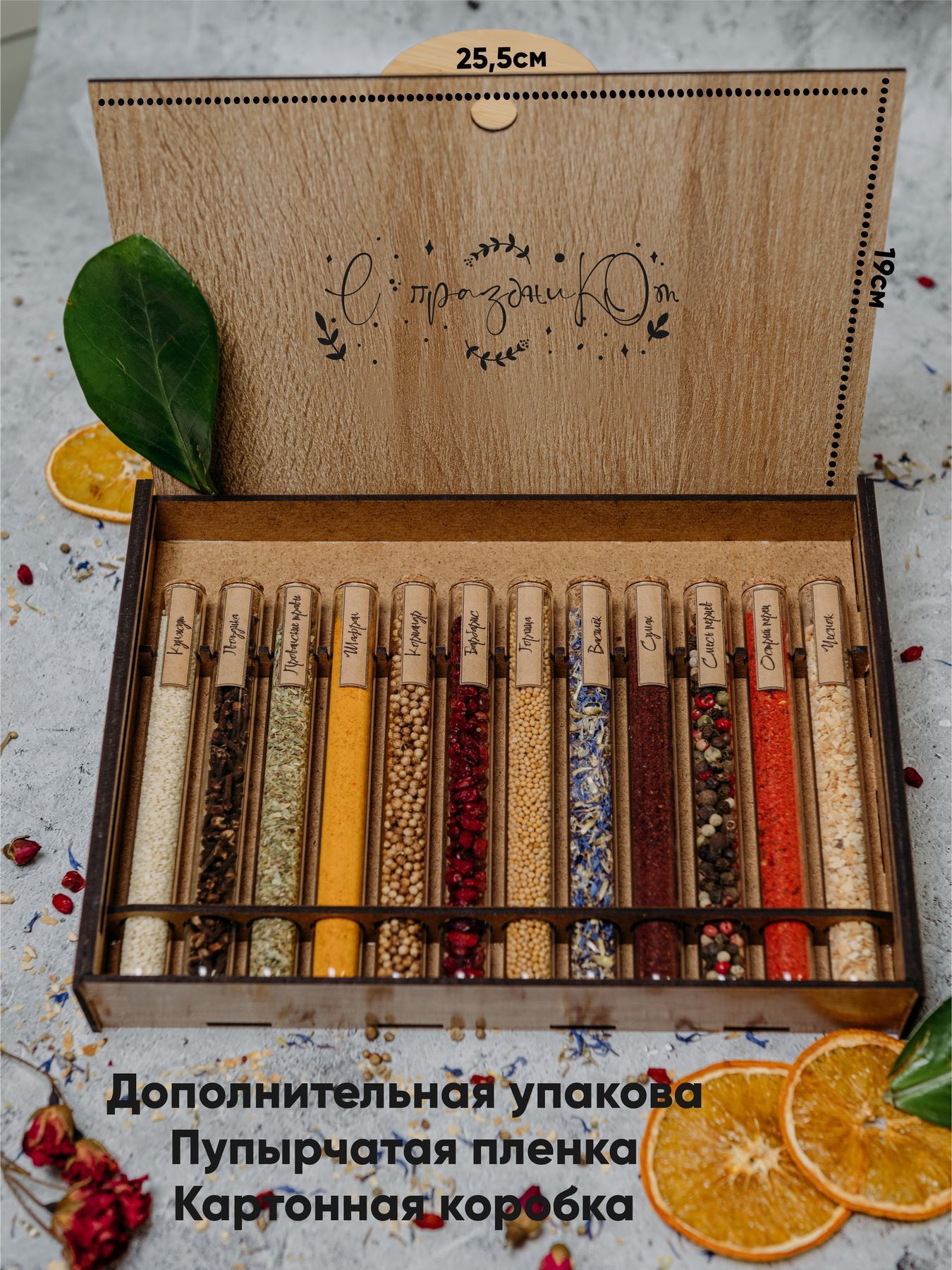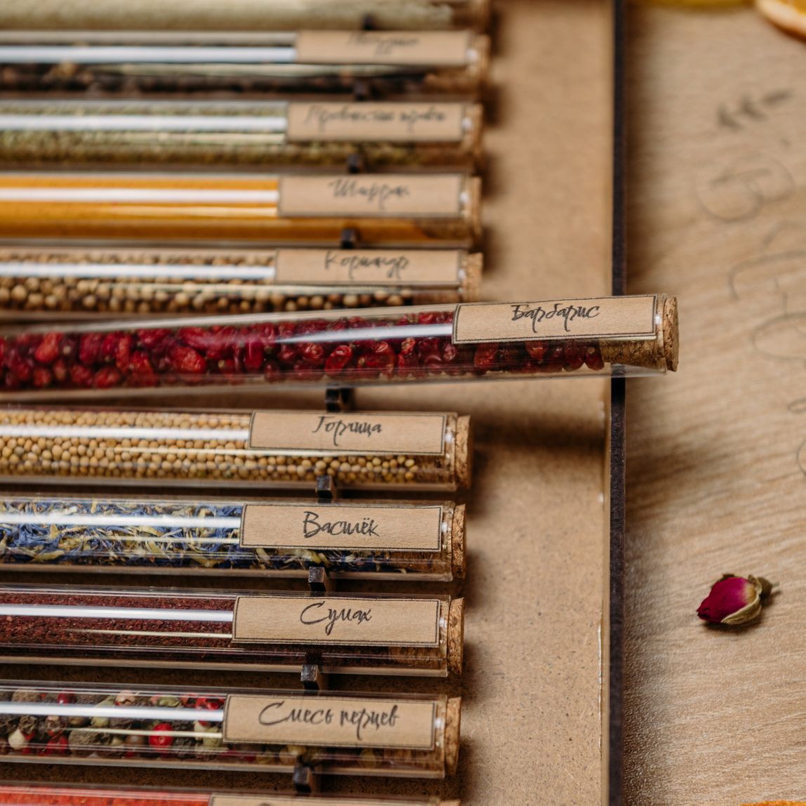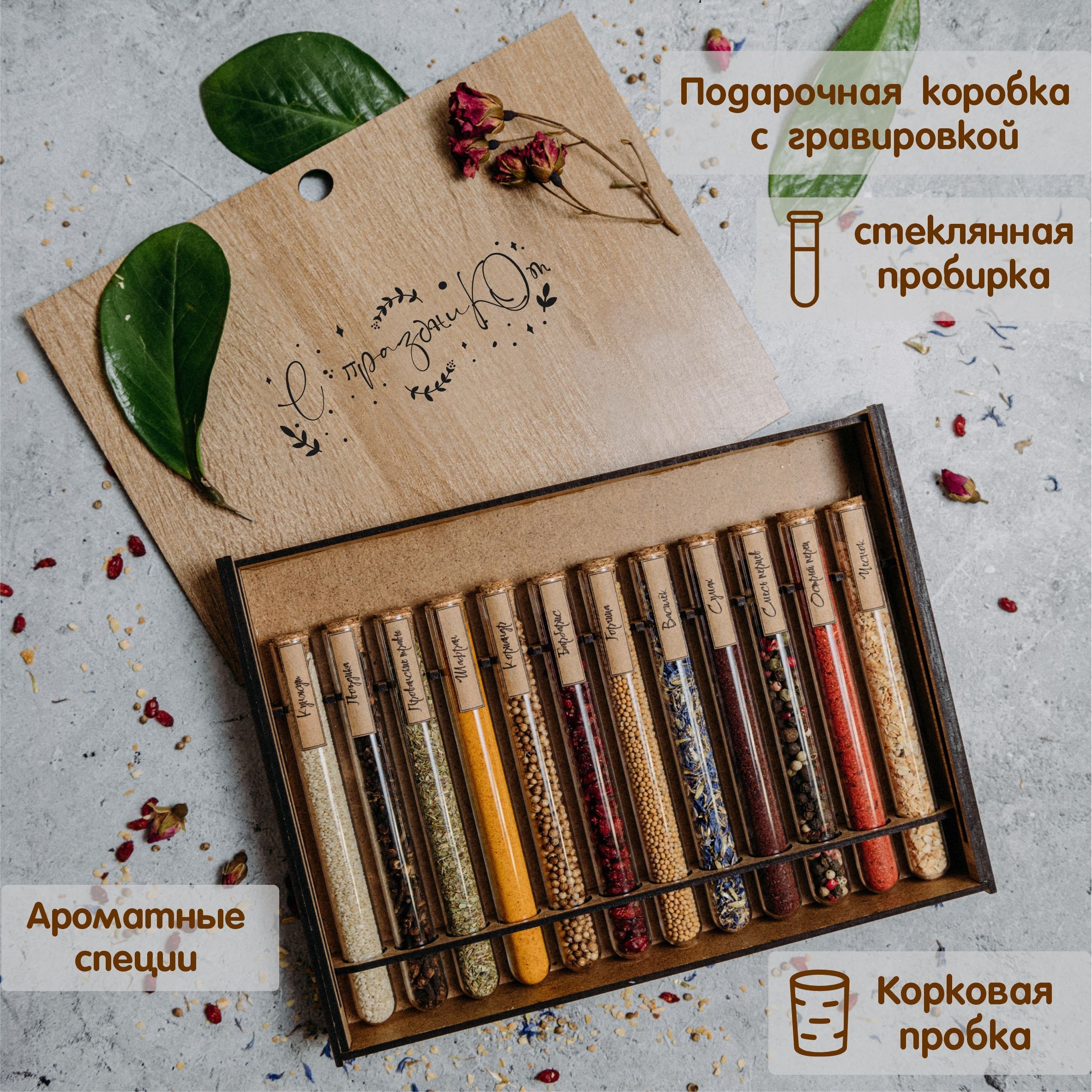 Описание: Набор приправ и специй в пробиркахПодарочный набор приправ и специй "Дорогой Друг" - это феерия ароматов! В состав набора входят отборные специи и пряности, которые сделают каждое приготовленное вами блюдо особенным и неповторимым.Стильно и элегантноСтеклянные пробирки с корковыми пробками упакованы в коробочку с гравировкой, которая имитирует древесину. Набор со стеклянными колбами смотрится аккуратно и солидно. Он станет украшением интерьера любой кухни, а еще будет беспроигрышным решением при поиске подарка.