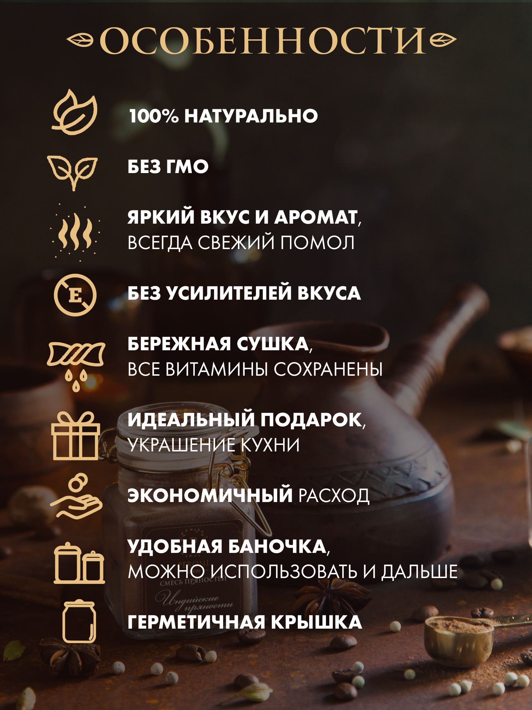 Зачем нужны специи для кофе? Они обогащают вкус, добавляют яркие, терпкие и экзотические ноты, раскрывают в нем новые грани. Микс смеси включает в себя молотую корицу и кардамон, имбирь и перец белый, гвоздику и мускатный орех. Буквально одна щепотка наполнит ваш дом атмосферой загадочного Востока и манящей Азии. Почувствуйте себя путешественником, открывающим неведомые страны.