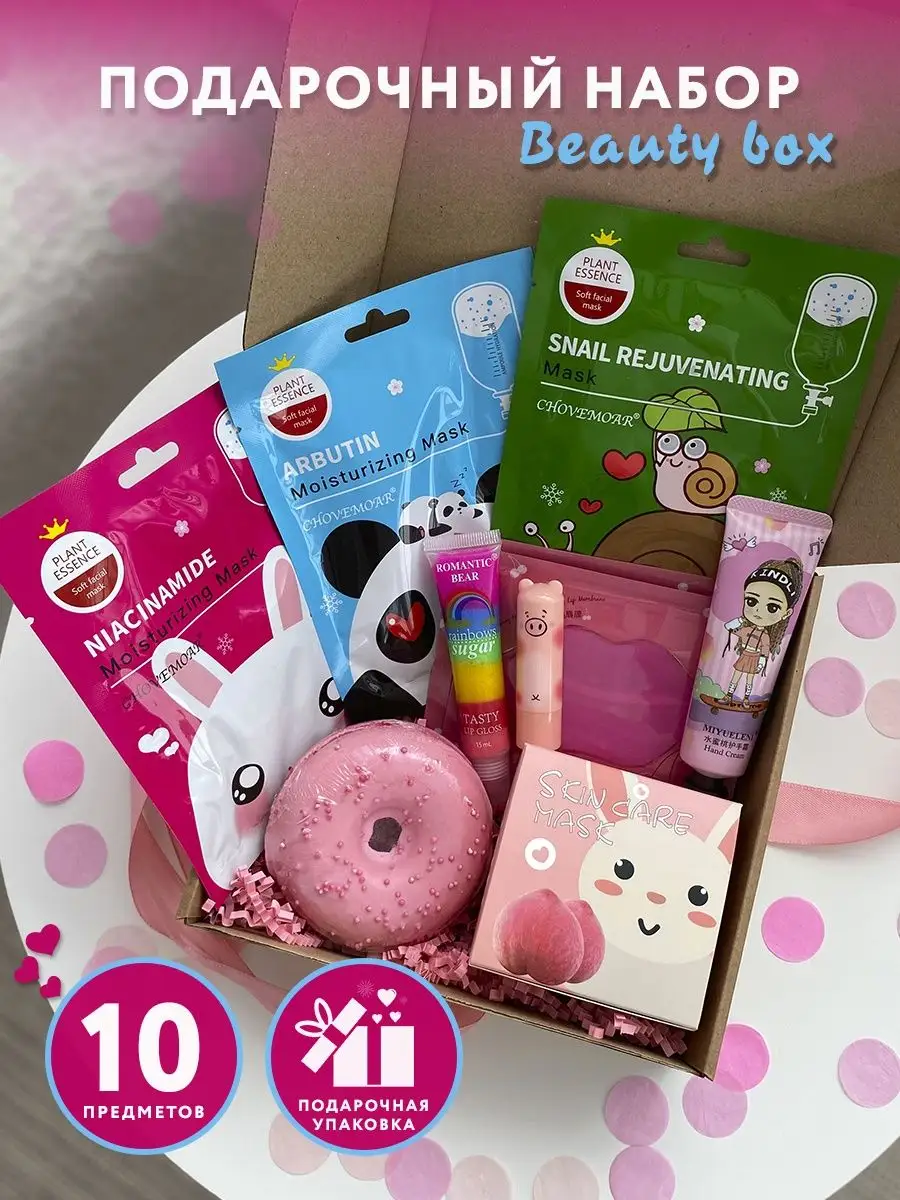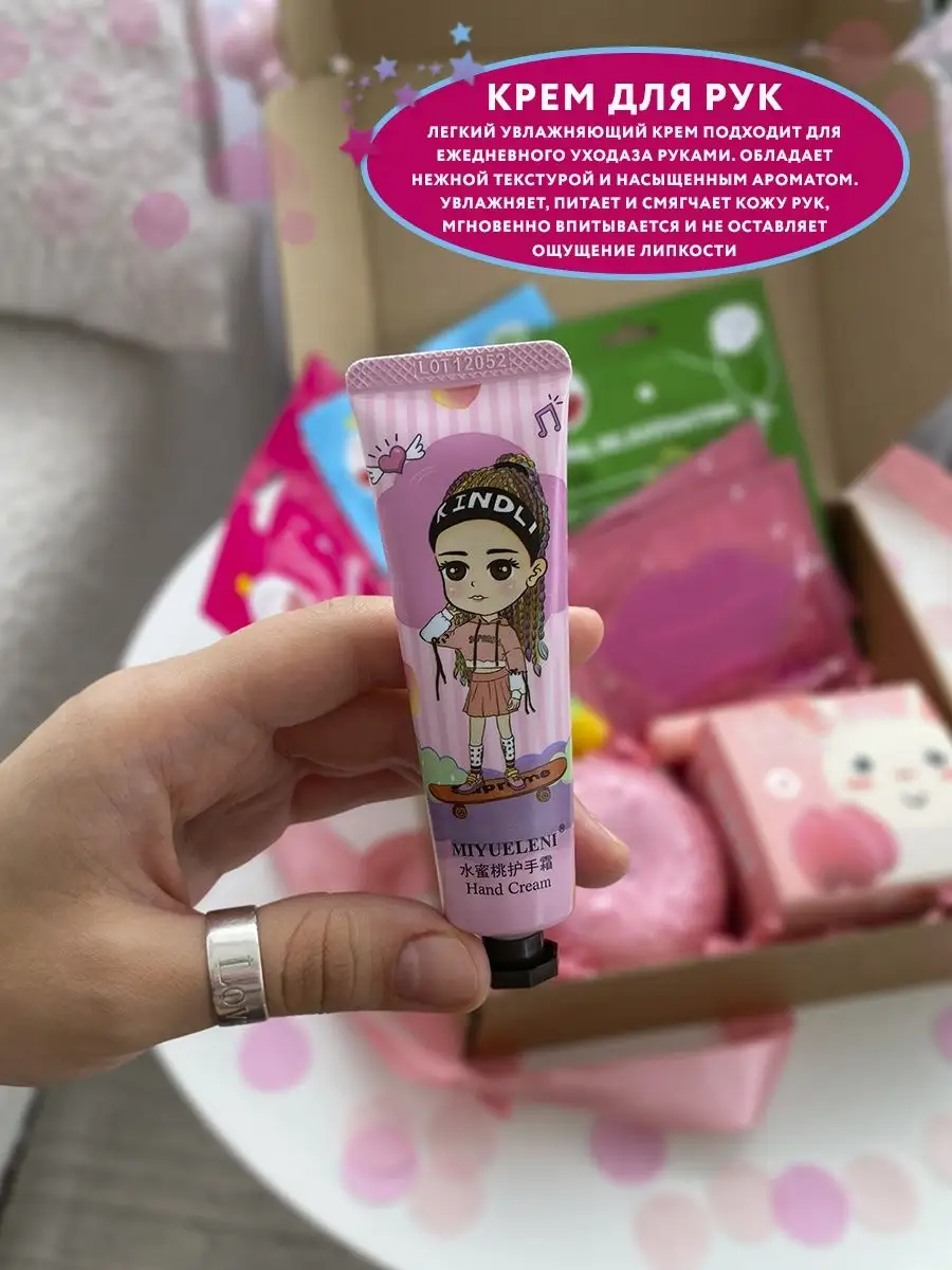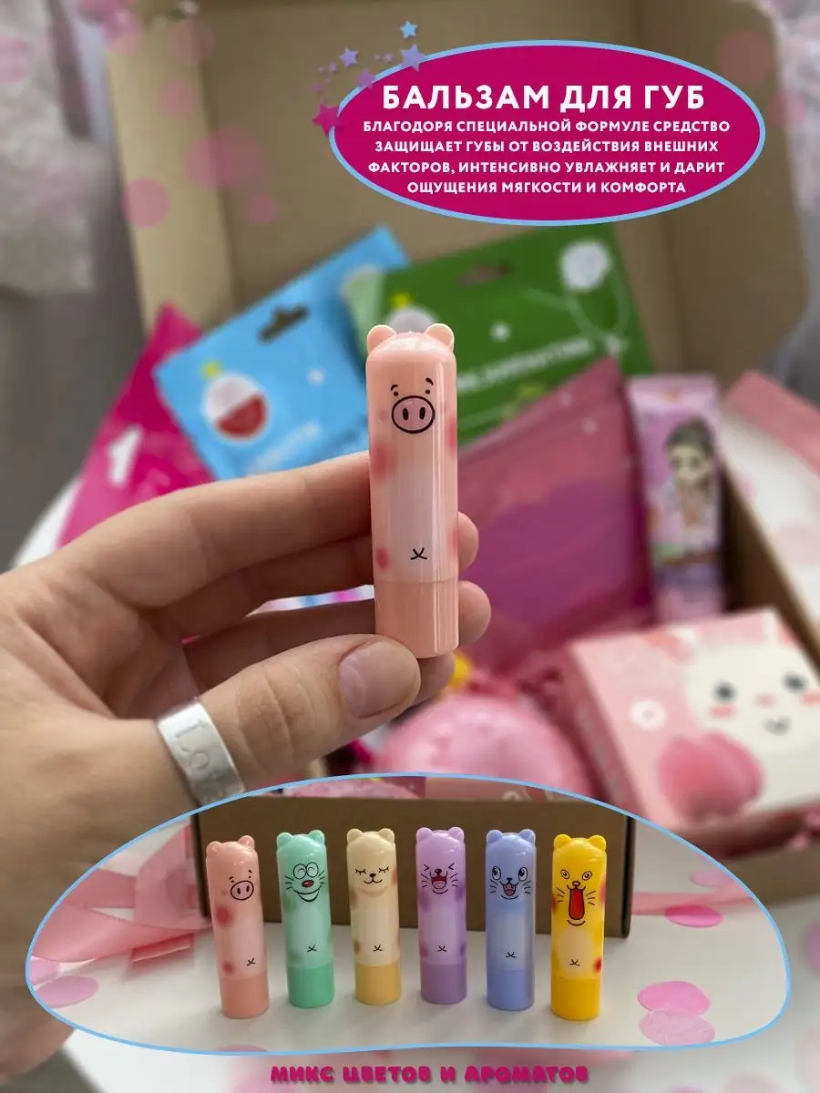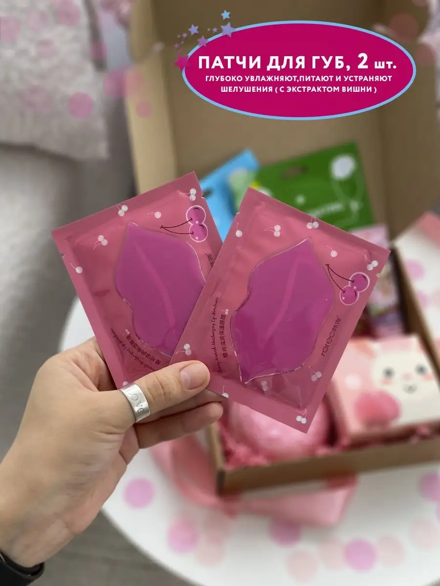 Комплектация Патчи для губ; Патчи для глаз; Бомбочка для ванны; Блеск для губ; Маски для лица; Крем для рук; Бальзам для губ; Бокс
