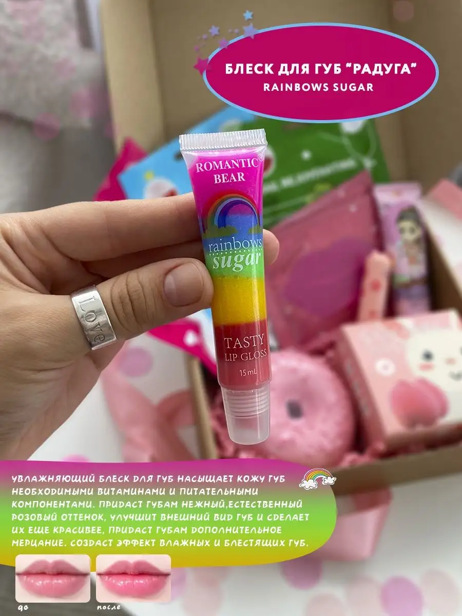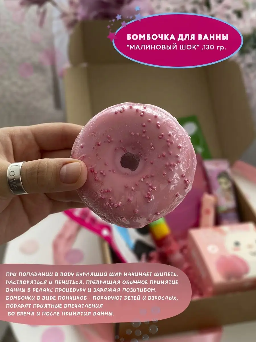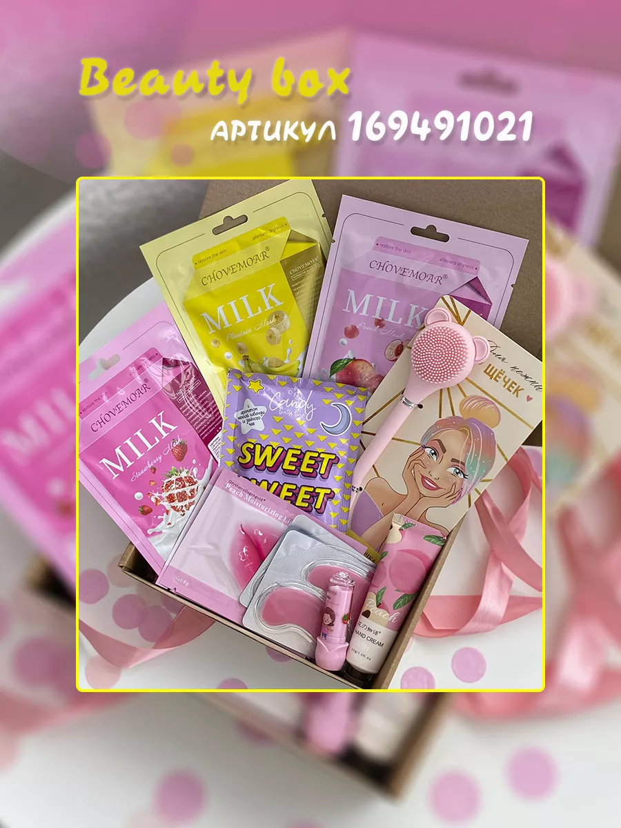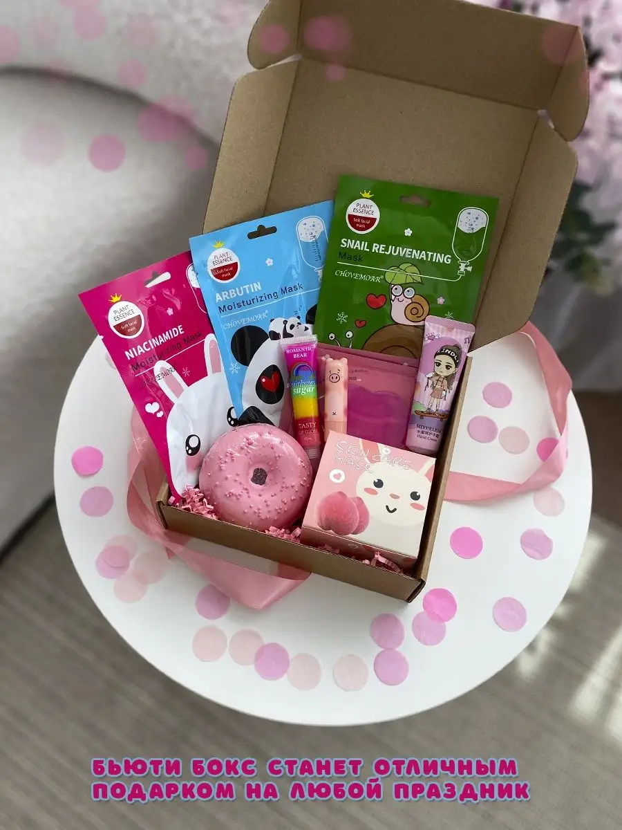 Комплектация Патчи для губ; Патчи для глаз; Бомбочка для ванны; Блеск для губ; Маски для лица; Крем для рук; Бальзам для губ; Бокс