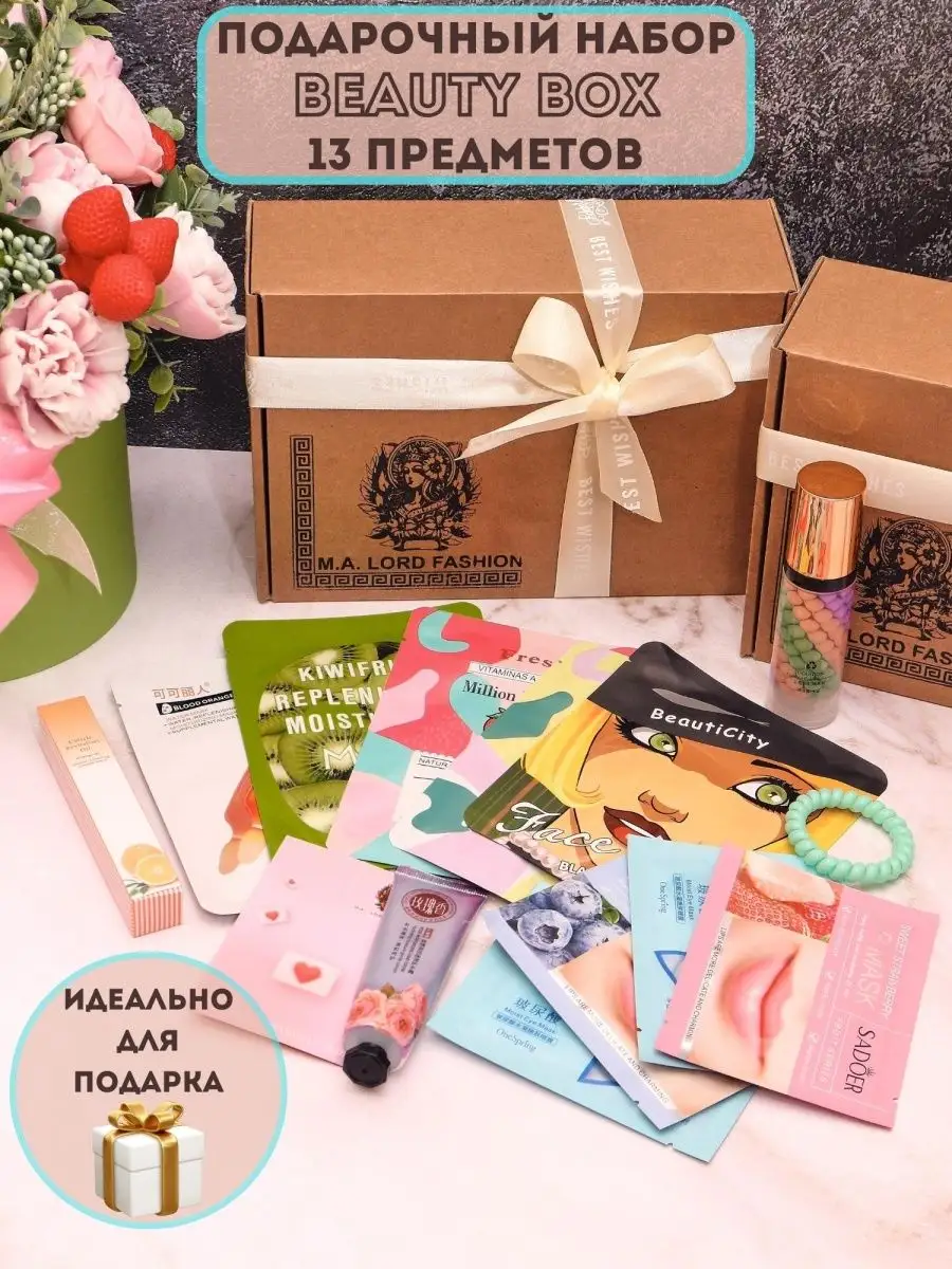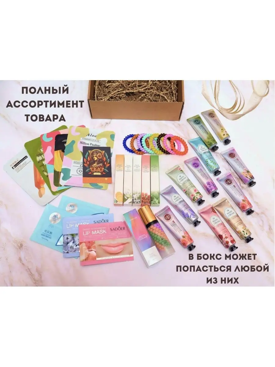 Артикул 153299610 Состав 100% косметическая, природная основа; коллаген; вода; тканевые маски для лица; гидрогелевые патчи для глаз; патчи для губ; крем для рук; Масло для кутикулы; Основа под макияж; резинка для волос; подарочная атласная лента; декоративный наполнитель; открытка; описание по применению масок