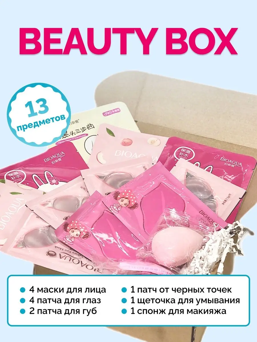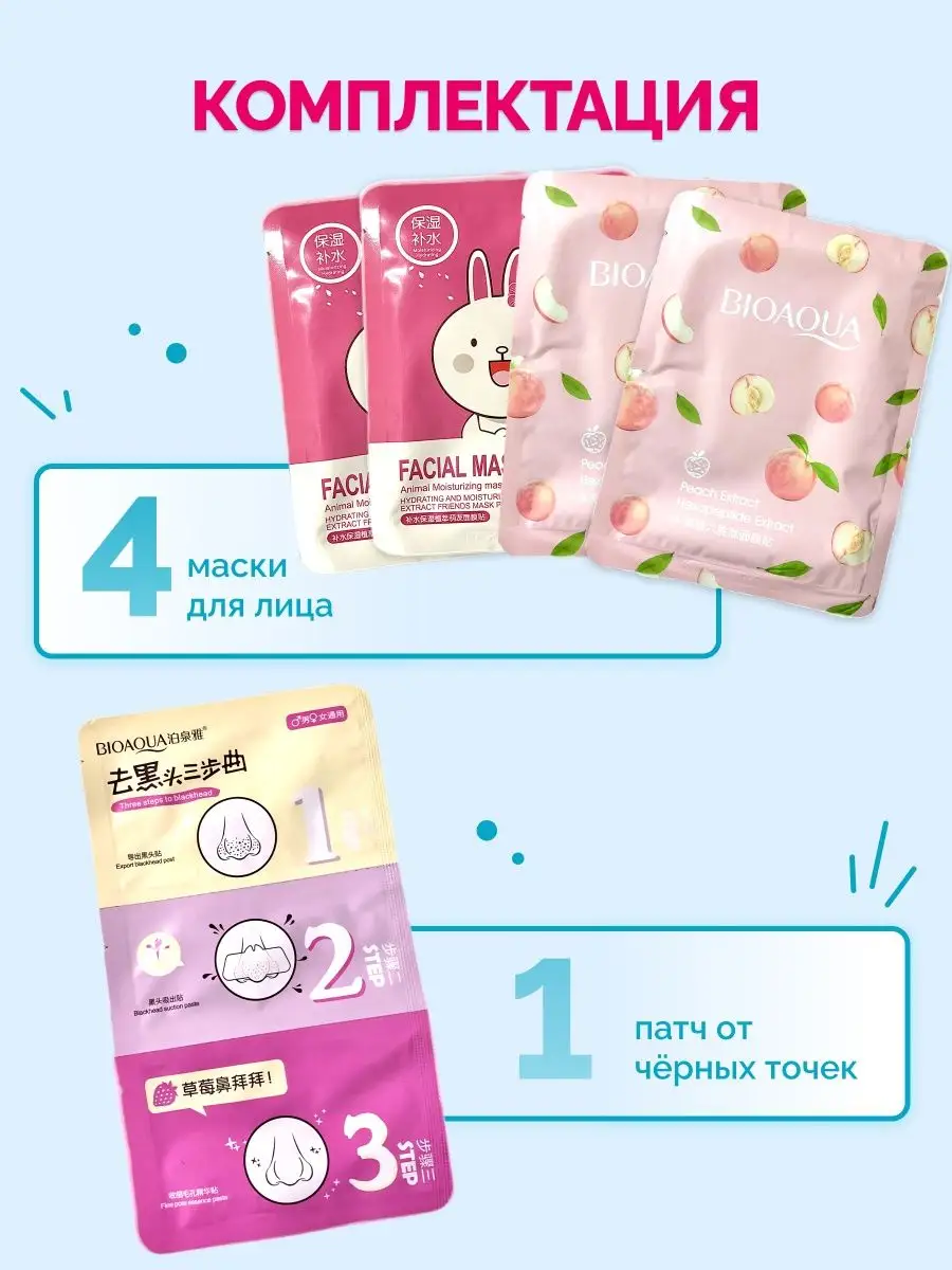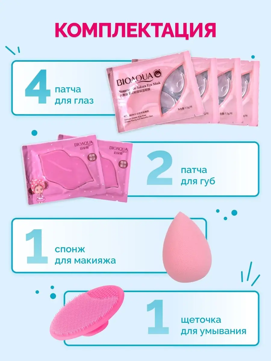 Комплектация 4 маски для лица; 4 патча для глаз; 2 патча для губ; спонж; щеточка для умывания; патч от черных точек