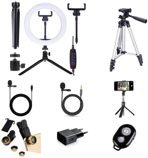 Кольцевая Лампа 26 см, настольный штатив, металический держатель для лампы, держатель для телефона, петличный микрофон 3.5 Jack, переходник для микрофона с 3.5 jack на Lighting iPhone, пульт ДУ bluetooth, линзы 3в1, сзу, профессиональный штатив, монопод-трипод bluetooth.