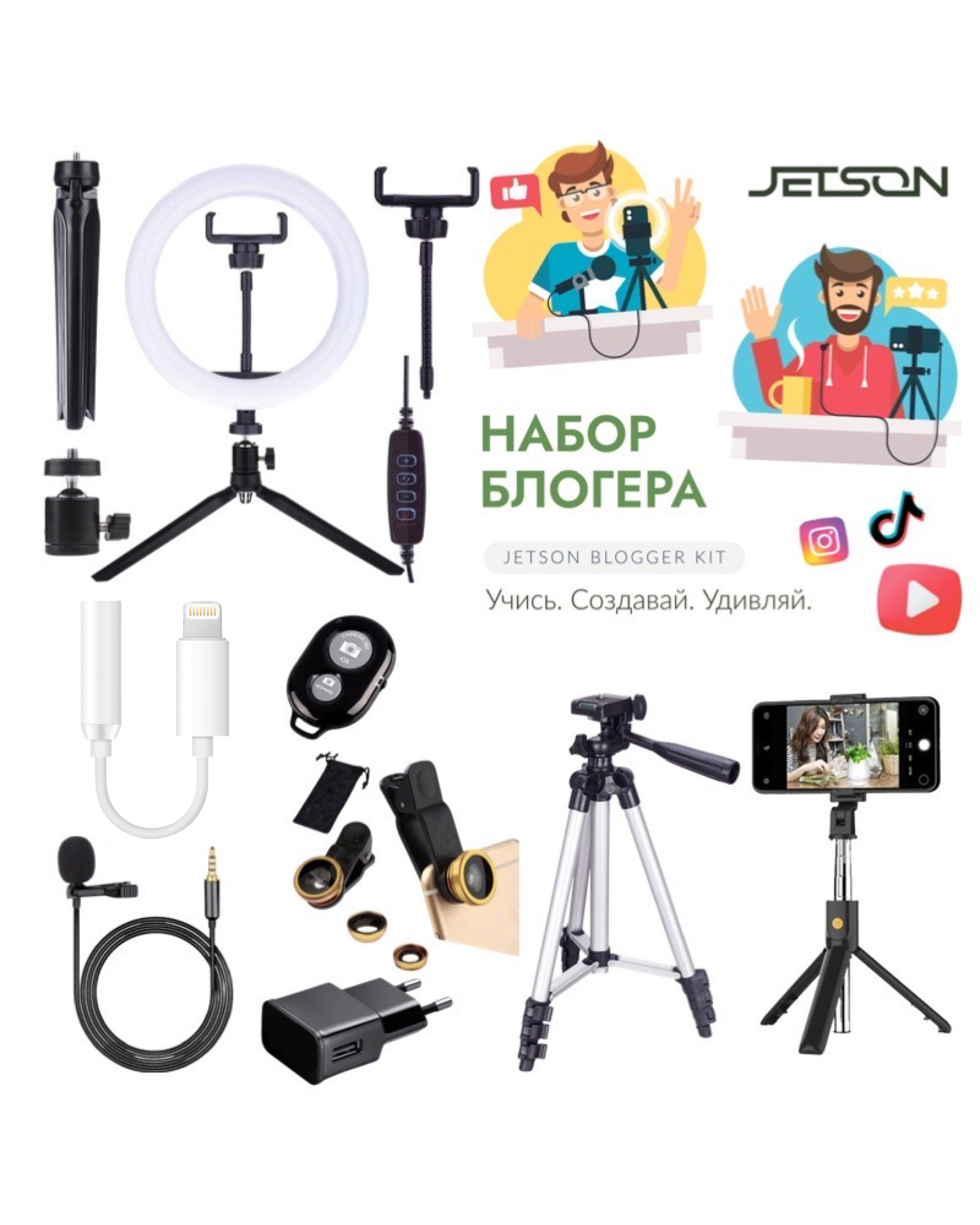 Описание: Все предметы, находящиеся в этом наборе, помогут тебе раскрыть свой потенциал на все 100%. Набор начинающего блогера поможет тебе добиться максимальной эффективности в твоих стараниях. Ведь секрет хорошего контента не только в таланте человека, а еще и в применении устройств, которые помогают делать этот контент качественным.