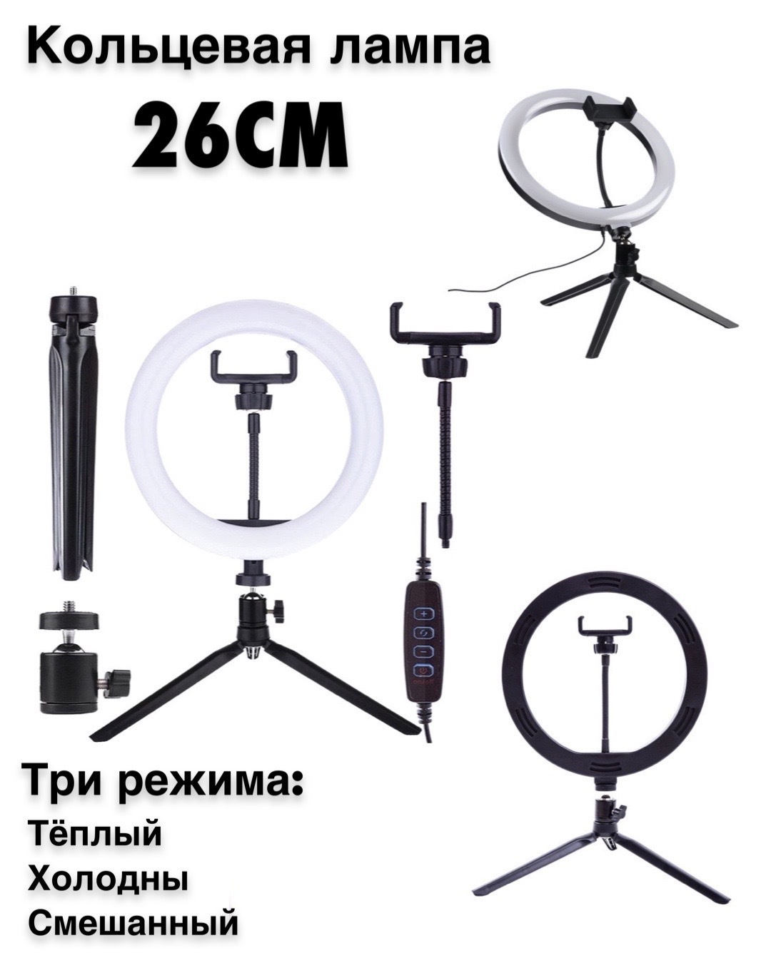 Светодиодная кольцевая лампа 26см отлично подходит для видео и фотосъемки, как портретной, так и предметной. Кольцевая лампа состоит из трех элементов: