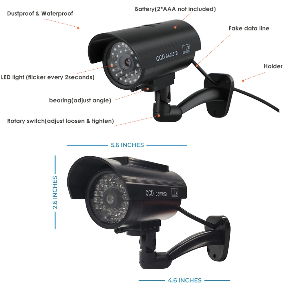 The flashing red LED on the simulation camera makes it more like a real camera. It is difficult for a thief to tell if it is a fake camera, enough to prevent him from entering your private space.