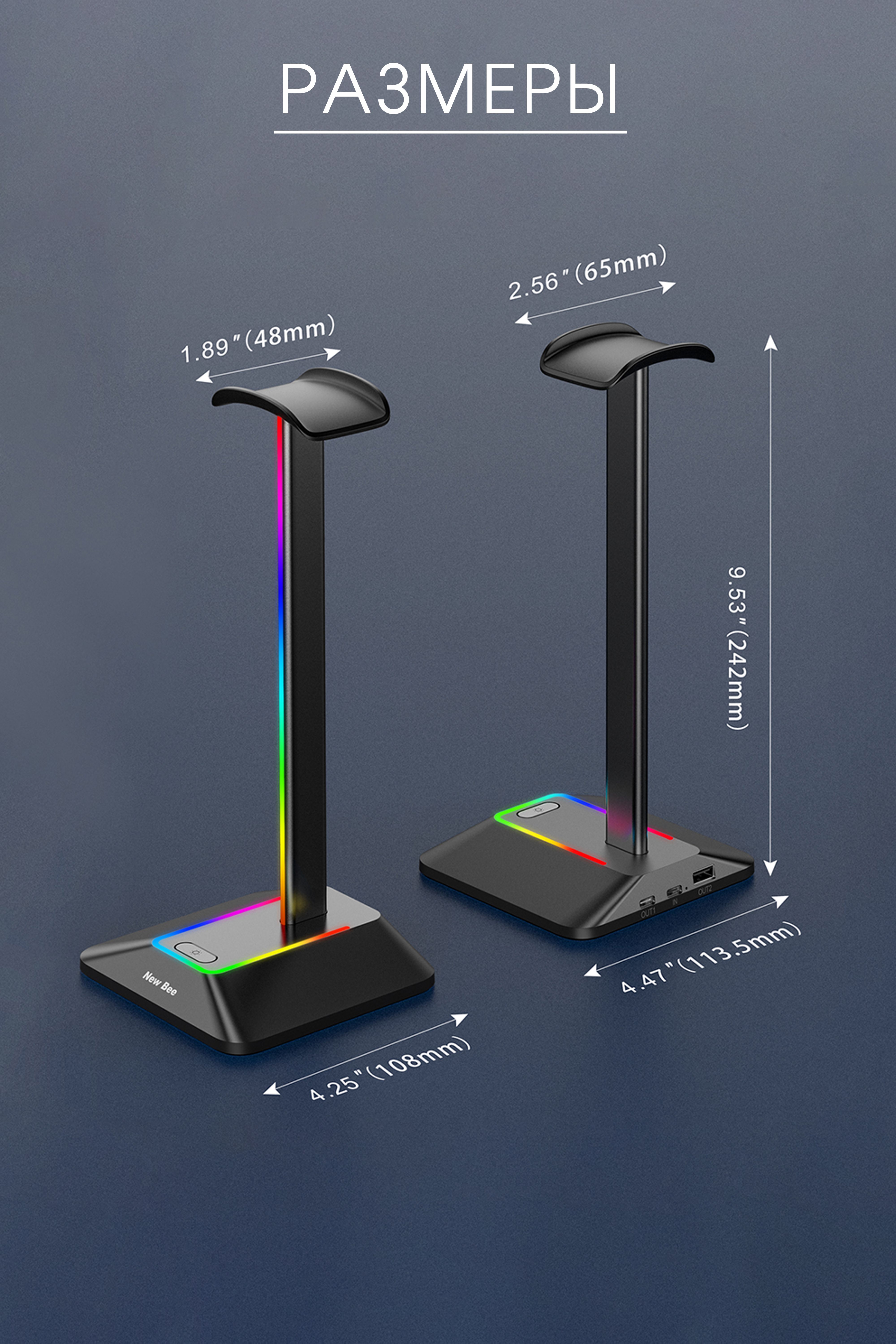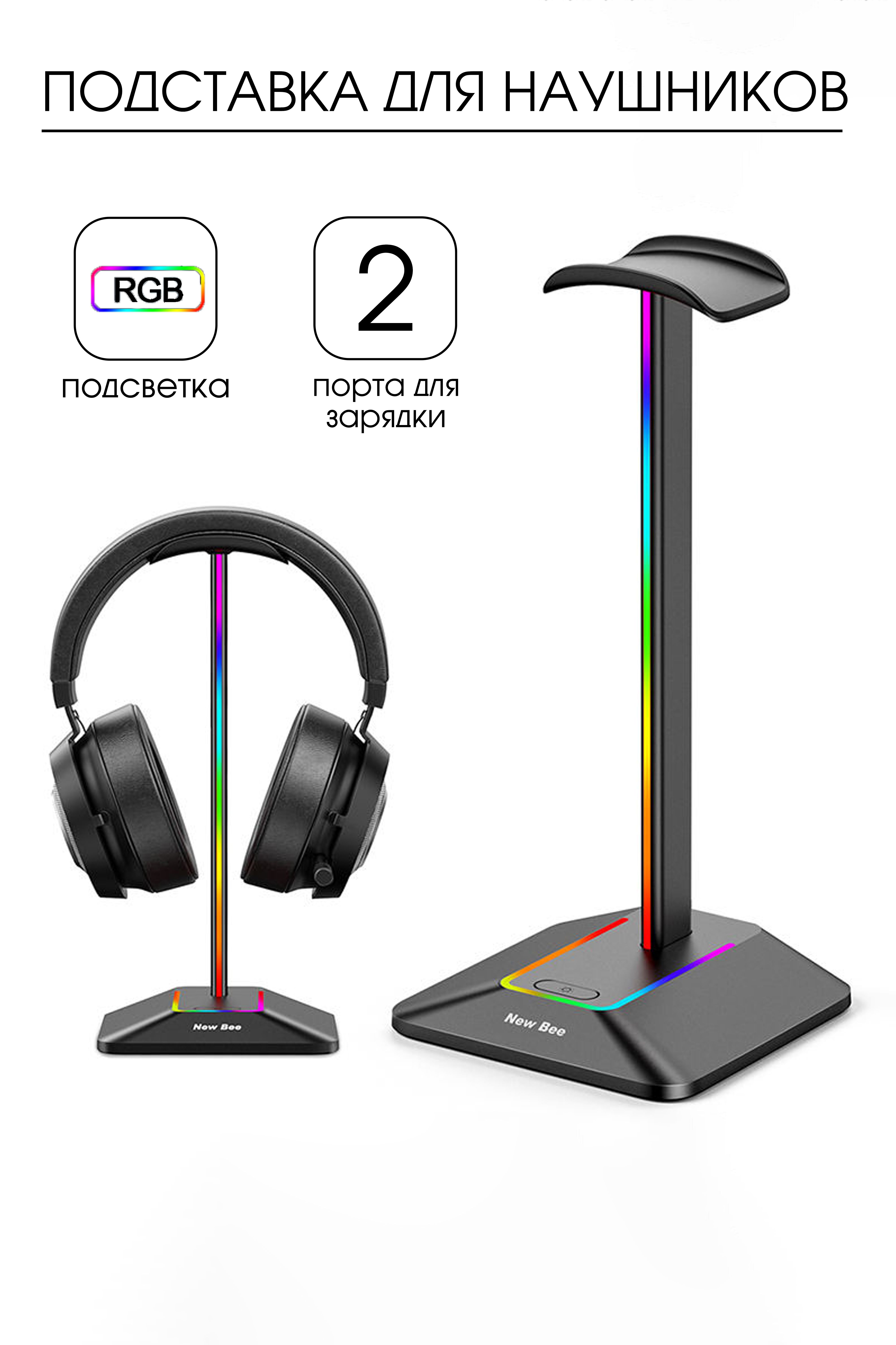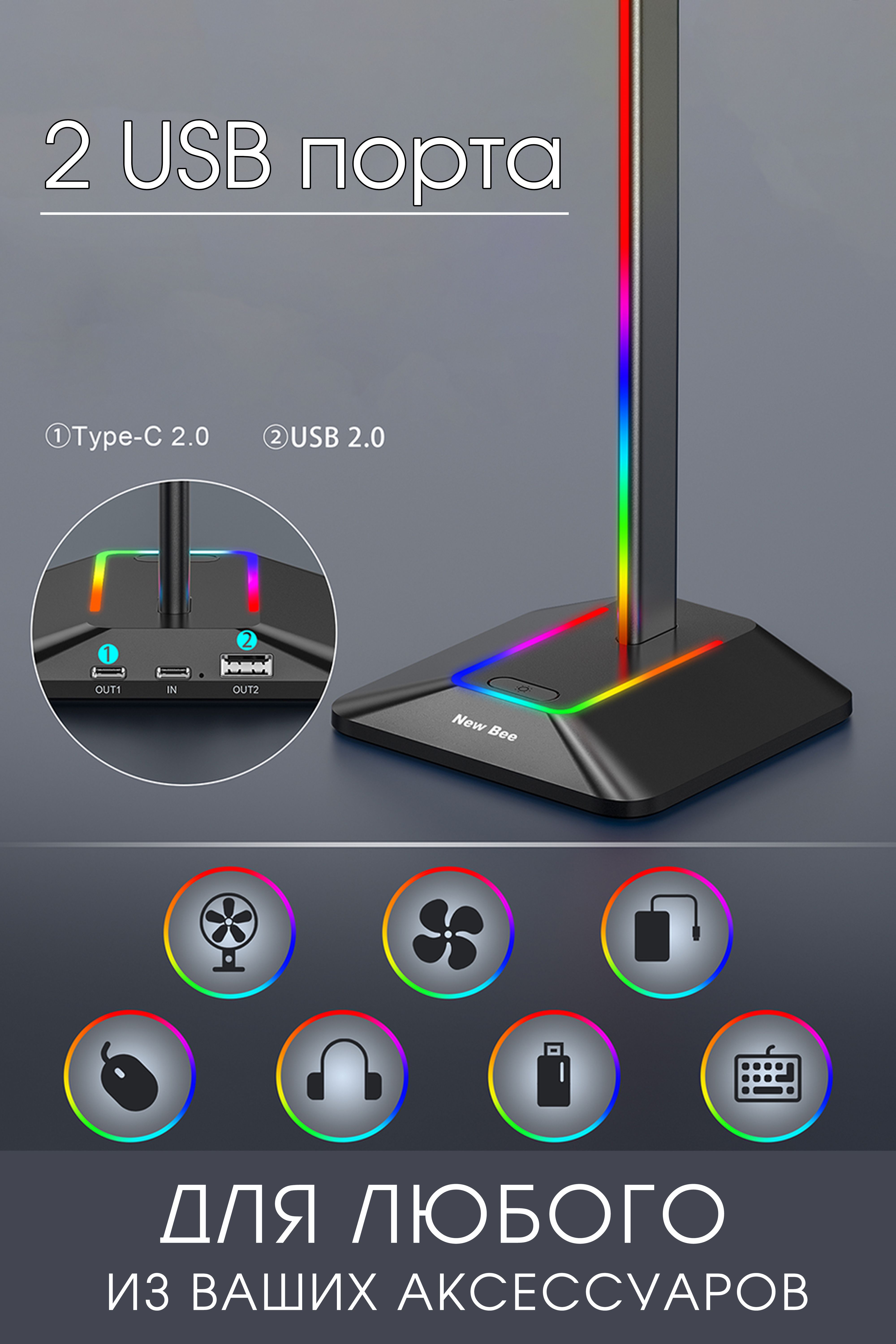 Описание: Подставка для наушниковПодставка для наушников New Bee Z8Полезный аксессуар для каждого, кто пользуется полноразмерным наушниками. С ней Ваши наушники всегда будут на своем месте без риска поцарапаться или упасть, а лаконичный дизайн и RGB подсветка украсят Ваше рабочее пространство!Подставка для наушниковRGB подсветкаДержатель для наушников поддерживает цветную RGB подсветку с несколькими режимами работы. Выбирайте режим "волна", "дыхание" или любой другой и задавайте настроение!Подставка для наушниковПорты USBДержатель для наушников в минималистичном дизайне – еще и настоящий органайзер Вашего рабочего места! У подставки для наушников предусмотрено два порта: стандартный USB и современный Type-c. Это дает возможность передавать данные с одного устройства на другое за несколько минут! К тому же, благодаря наличию разных портов стенд для наушников становится настоящей зарядной станцией для устройств!Подставка для наушниковНадежная конструкцияПодставка подходит для любых типов наушников за счет гибкой и надежной платформы, а анти-скользящее покрытие и крепкое алюминиевое крепление не дадут наушникам упасть, даже если Вы их случайно заденете.