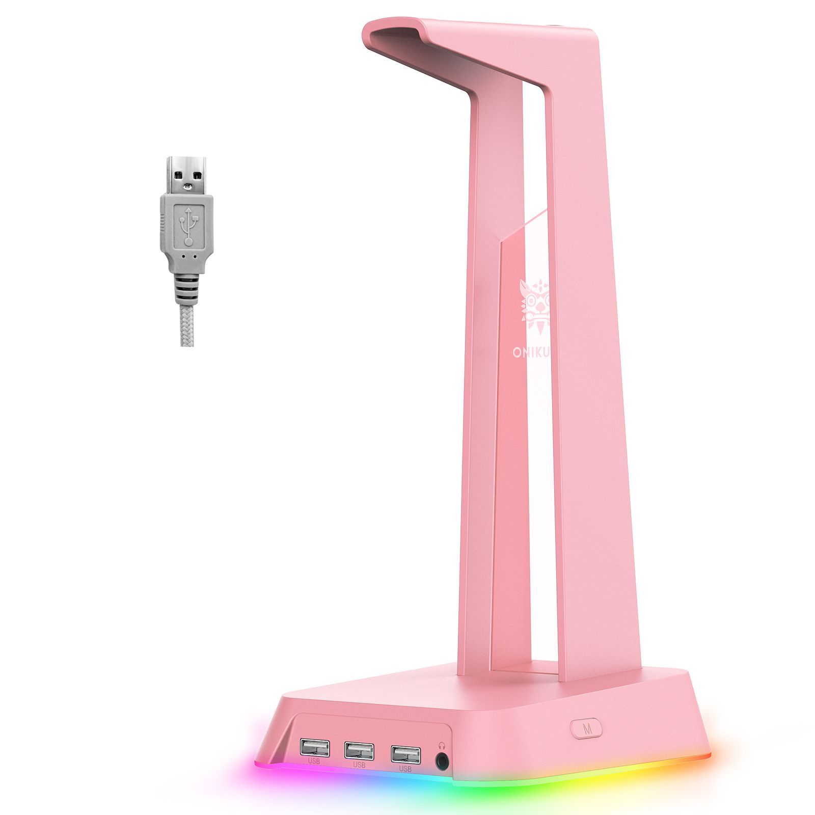 На панели расположены три USB-порта для зарядки гаджетов и передачи данных с различных устройств, а также порт 3.5 mm для подключения гарнитуры.Устойчивая конструкцияВ основании розовой подставки для наушников ONIKUMA лежит металлический блок, создающий центр тяжести и устойчивое хранение аксессуара. Нижняя часть отделана резиновым ковриком для плотного прилегания подставки к поверхности.