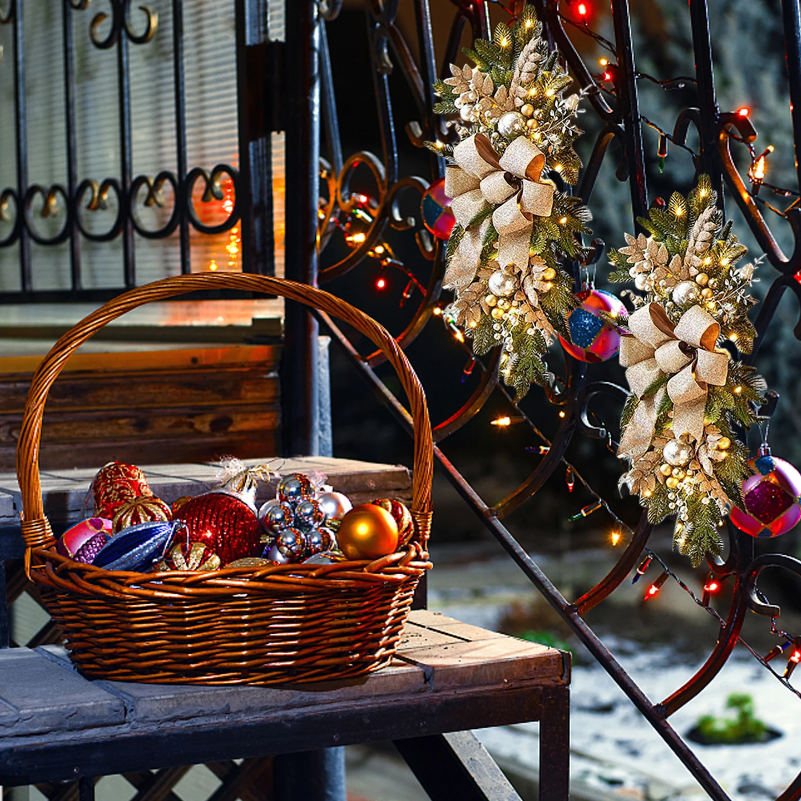 2. Размер гирлянды:50x25 см/19,68x9,84 дюйма. Украшенная традиционными высококачественными пластиковыми шарами и цветами, лестничная гирлянда, несомненно, станет зрелищем. Световая нить продукта питается от батарейного отсека и требует 2 батарейки АА. (Товар не содержит батареек, покупатель должен принести свои)