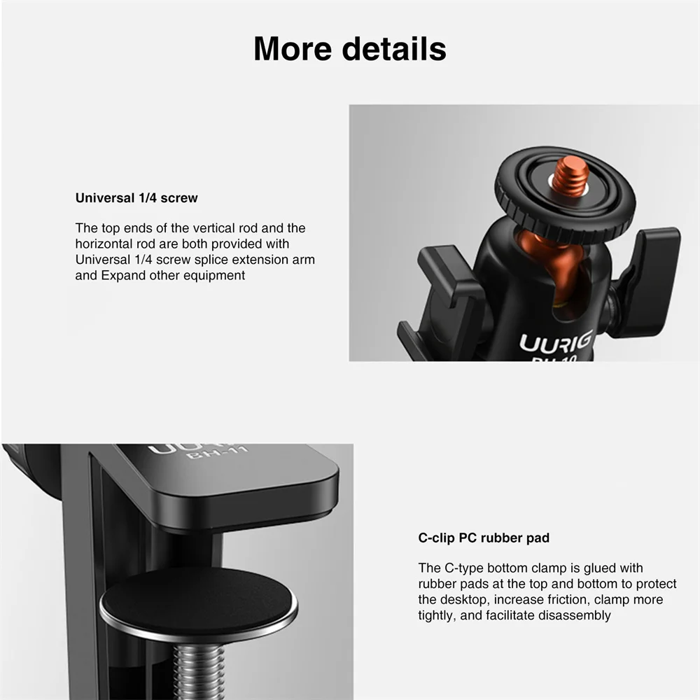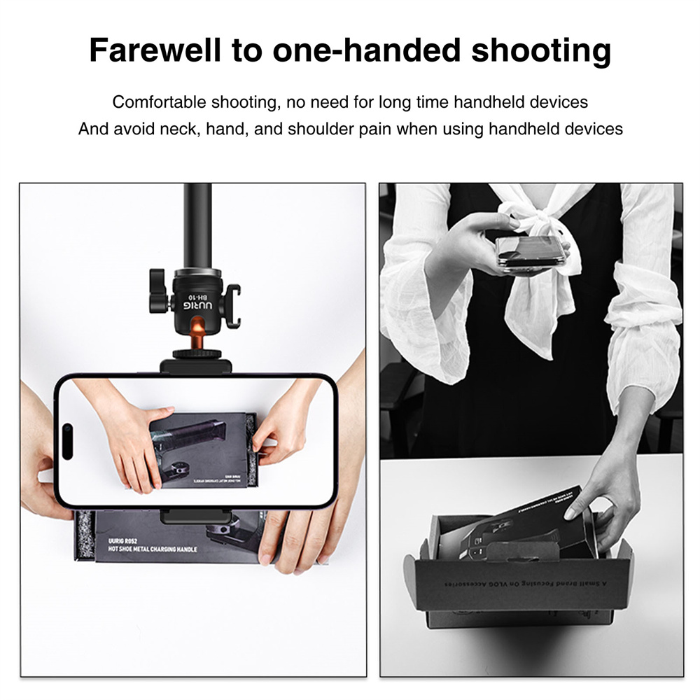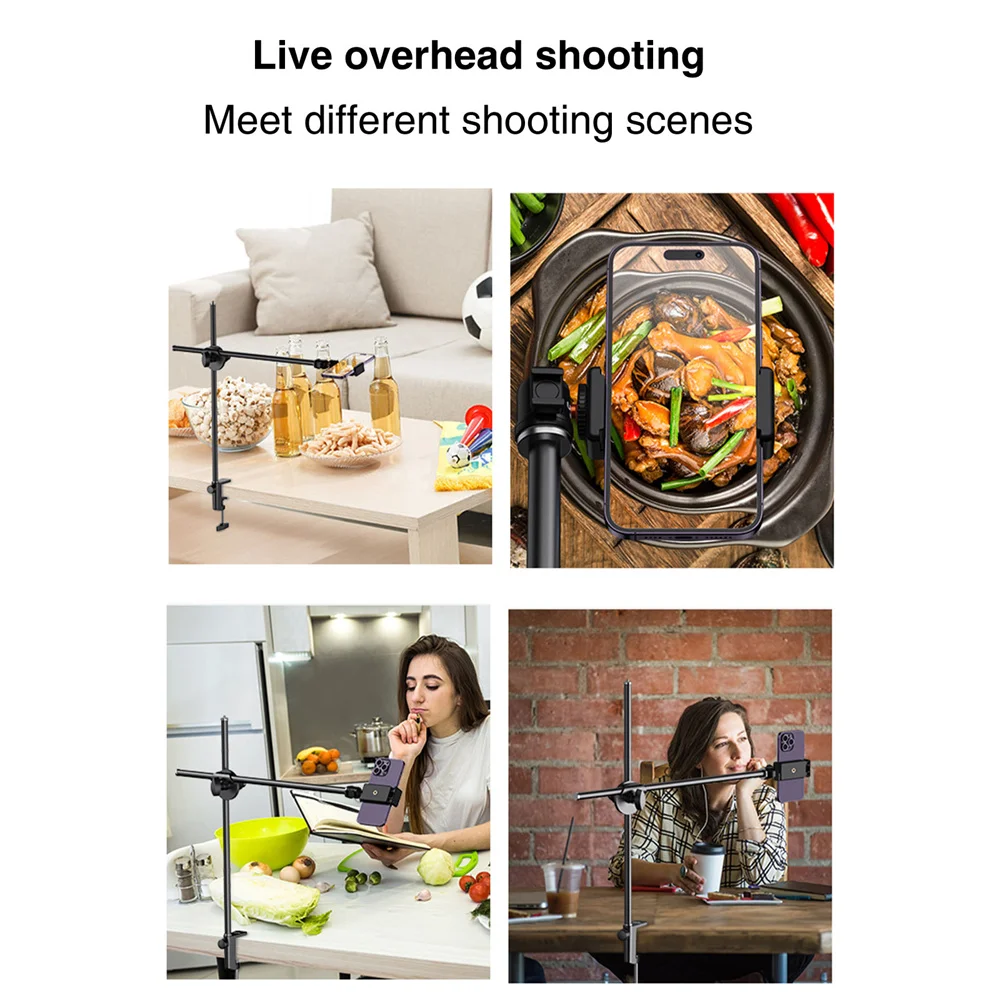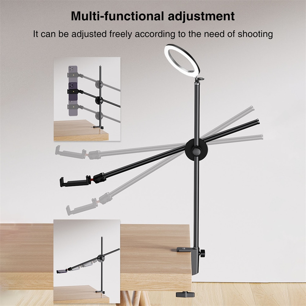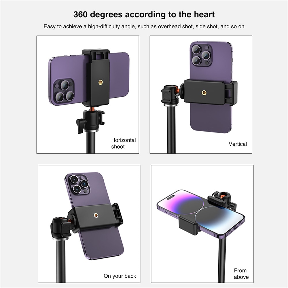 Гибкий угол регулировки: самый инновационный дизайн подставки веб-камеры заключается в том, что съемное удерживающее устройство может быть гибко отрегулировано на 360 °, поворачивается на любой угол и положение, которое вам нужно. Шарнирная шариковая головка и держатель телефона подходят для телефонов, светильник весовых камер и т. д. Монтажное кольцо светильник на верхней части полюса, а телефон на руке сделает вашу фотографию более совершенной.
