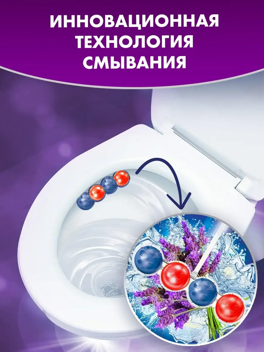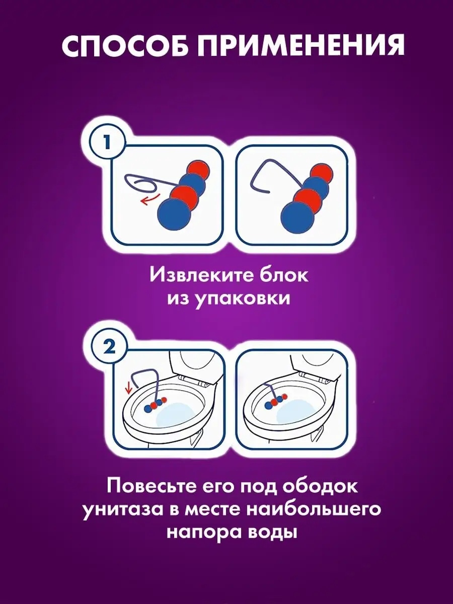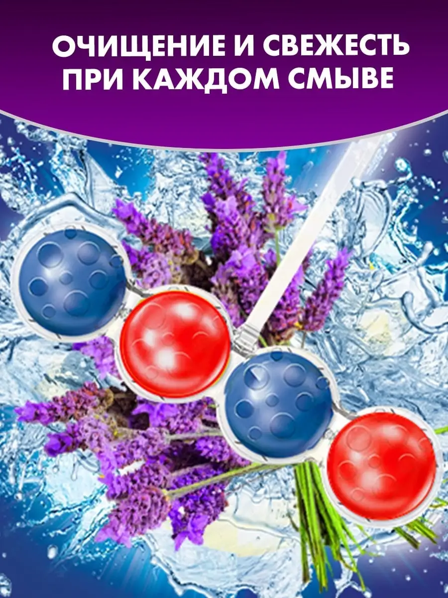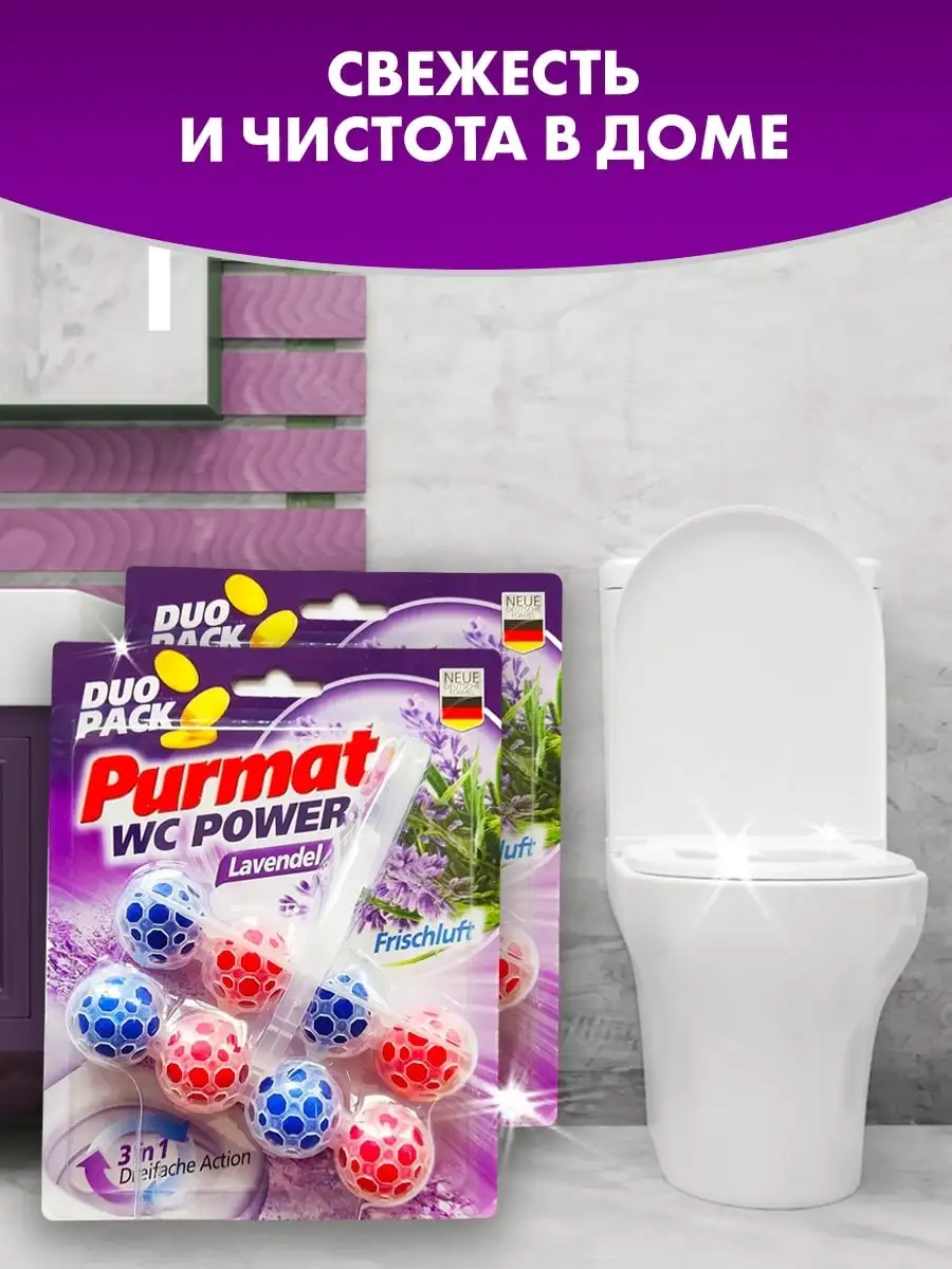 Описание: Средство для чистки унитаза Purmat таблетки (шарики для унитаза с запахом) в сменных блоках - освежитель подвесной в туалет от налета. Туалетный блок ПУРМАТ Лаванда - это подвесной блок для унитаза с формулой 3 в 1: чистота и сияющий блеск, свежесть и защита + активная пена. Средство для унитаза ПУРМАТ действует в четырех направлениях. Современная формула шариков содержит поверхностно-активные вещества и неорганические соли, благодаря чему обеспечивает гигиеническую чистоту, защиту от бактерий, а значит здоровье и безопасность для всей семьи. Эффективные растворяющиеся антибактериальные компоненты в составе шариков для унитаза защищают от известкового налета и от болезнетворных микроорганизмов. Использование блока убережет вашу сантехнику от известковых и солевых отложений, ржавчины и надолго продлит эксплуатацию. Чистящее содержит блоки шариков в формате растворимого геля с ароматом Лаванды. При каждом смывании воздух наполняется приятным ароматом, благодаря двойной силе шариков для унитаза. Поэтому нет необходимости пользоваться дополнительными освежителями воздуха в туалете. Очиститель таблетки шарики подвесной блок для унитаза дезинфицирующее средство для очищения туалета PURMAT красного (лавандового) цвета. Удобство и простота в использовании: снимите защитную пленку, повесьте блок под ободок унитаза в месте наибольшего потока воды. Меньше времени на уборку туалета: гель для унитаза подвесной эффективно удаляет любые загрязнения и поддерживает унитаз в чистоте длительное время. Наслаждайтесь свежестью и чистым ароматом с каждым смыванием. Сохраняйте белизну унитаза в первозданном виде!
