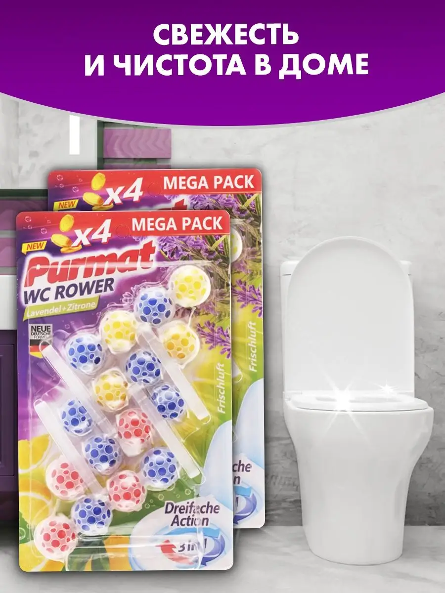 Описание: Средство для чистки унитаза Purmat таблетки (шарики для унитаза с запахом) в сменных блоках - освежитель подвесной в туалет от налета. Туалетный блок ПУРМАТ Лимонная Свежесть и Лаванда - это подвесной блок для унитаза с формулой 3 в 1: чистота и сияющий блеск, свежесть и защита + активная пена. Средство для унитаза ПУРМАТ действует в четырех направлениях. Современная формула шариков содержит поверхностно-активные вещества и неорганические соли, благодаря чему обеспечивает гигиеническую чистоту, защиту от бактерий, а значит здоровье и безопасность для всей семьи. Эффективные растворяющиеся антибактериальные компоненты в составе шариков для унитаза защищают от известкового налета и от болезнетворных микроорганизмов. Использование блока убережет вашу сантехнику от известковых и солевых отложений, ржавчины и надолго продлит эксплуатацию. Чистящее содержит блоки шариков в формате растворимого геля с ароматом Цитруса и Лаванды. При каждом смывании воздух наполняется приятным ароматом, благодаря двойной силе шариков для унитаза. Поэтому нет необходимости пользоваться дополнительными освежителями воздуха в туалете. Очиститель таблетки шарики подвесной блок для унитаза дезинфицирующее средство для очищения туалета PURMAT желтого (лимонного), и красного (лавандового) цвета. Удобство и простота в использовании: снимите защитную пленку, повесьте блок под ободок унитаза в месте наибольшего потока воды. Меньше времени на уборку туалета: гель для унитаза подвесной эффективно удаляет любые загрязнения и поддерживает унитаз в чистоте длительное время. Наслаждайтесь свежестью и чистым ароматом с каждым смыванием. Сохраняйте белизну унитаза в первозданном виде!