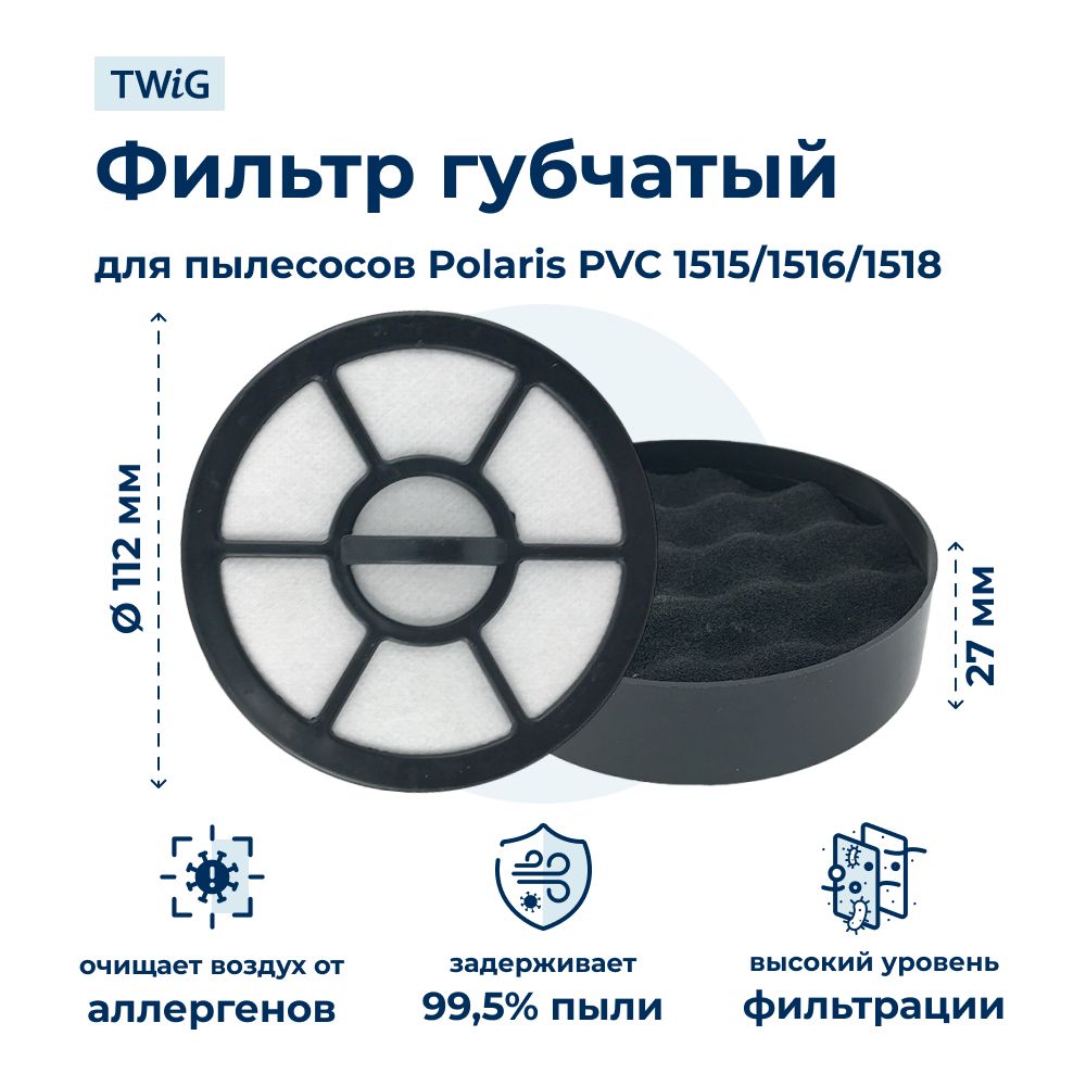 Описание: Фильтр для пылесоса Polaris 011894Фильтр губчатый для пылесоса Polaris служит для очистки воздуха от пыли и мусора, собранного пылесосом. Состоит из губчатого материала, который легко пропускает воздух и задерживает мелкие частицы. Фильтр имеет форму круга с диаметром 112 мм и высотой 27 мм. Закреплен в пластиковом корпусе черного цвета, который защищает его от повреждений и облегчает установку и замену. Фильтр подходит для пылесосов Polaris PVC 1515\u002F1516\u002F1518.Характеристики