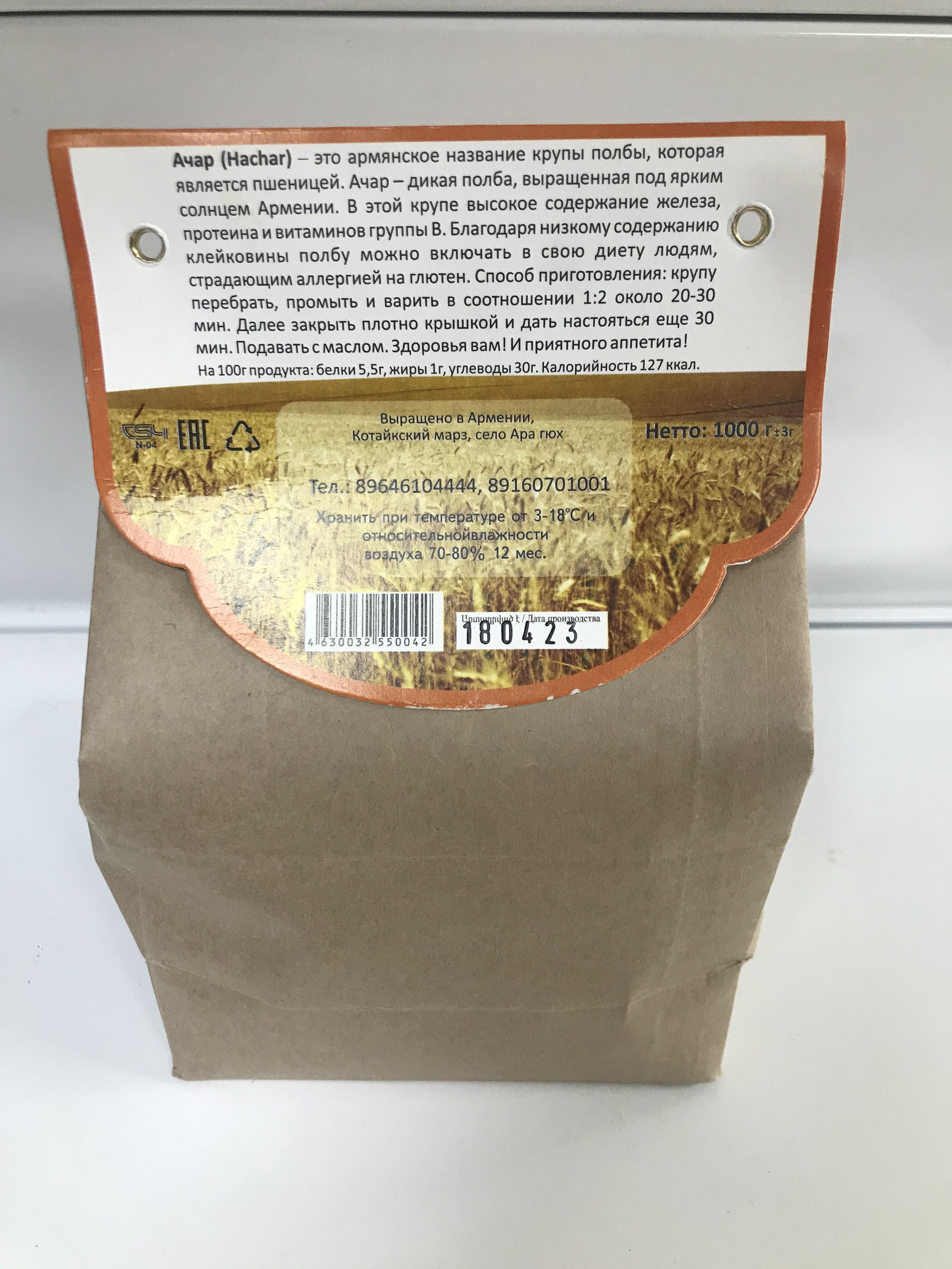 Описание: Ачар- это армянское название крупы полбы, которая является пшеницей.Ачар - дикая полба,выращенная под ярким солнцем Армении. В этой крупе высокое содержание железа, протеина и витаминов группы В. Благодаря низкому содержанию клейковины полбу можно включать в диету людям,страдающим аллергией на глютен. Способ приготовления: Крупу перебрать, промыть и варить в соотношении 1:2 около 20-30 минут. Далее закрыть крышкой и дать настояться еще 30 мин. Подавать с маслом. Здоровья вам! И приятного аппетита!