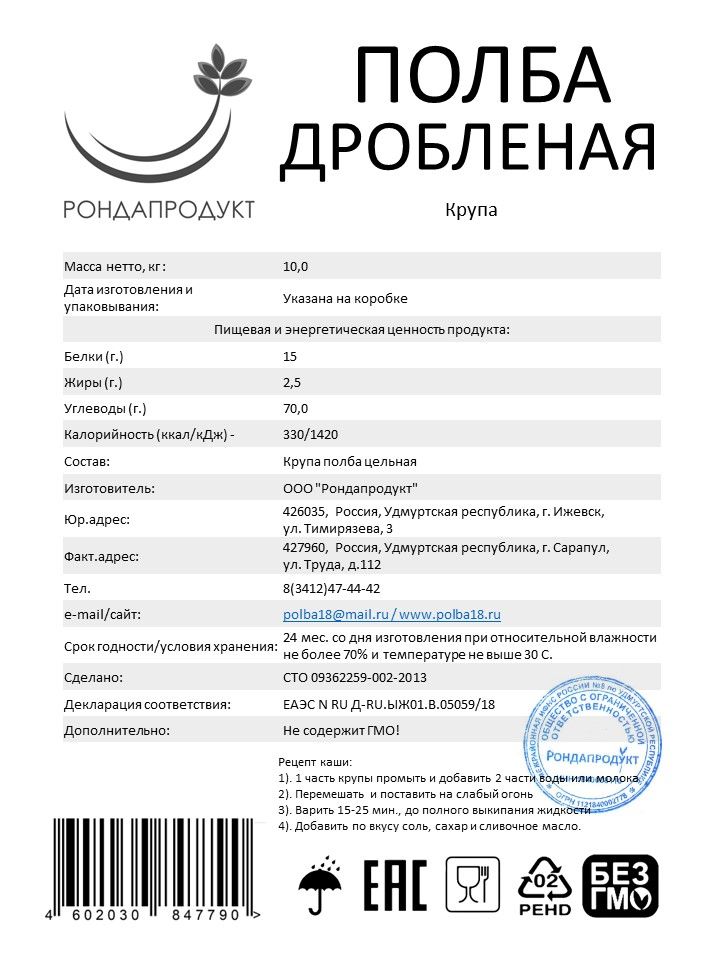 Производитель Рондапродукт: Полба дробленая выпускается компанией Рондапродукт, которая известна своим качеством и надежностью. Продукт прошел строгий контроль, чтобы обеспечить вам только лучшее.