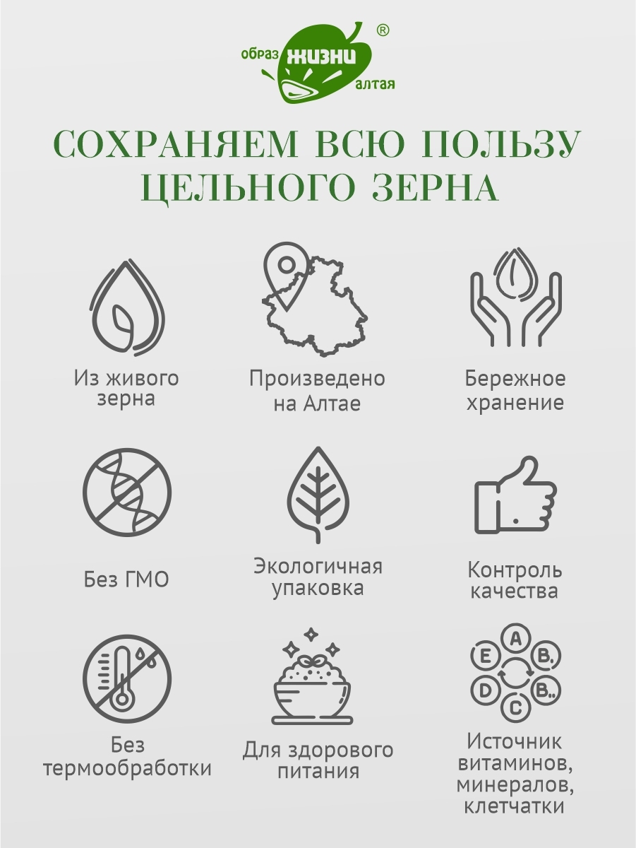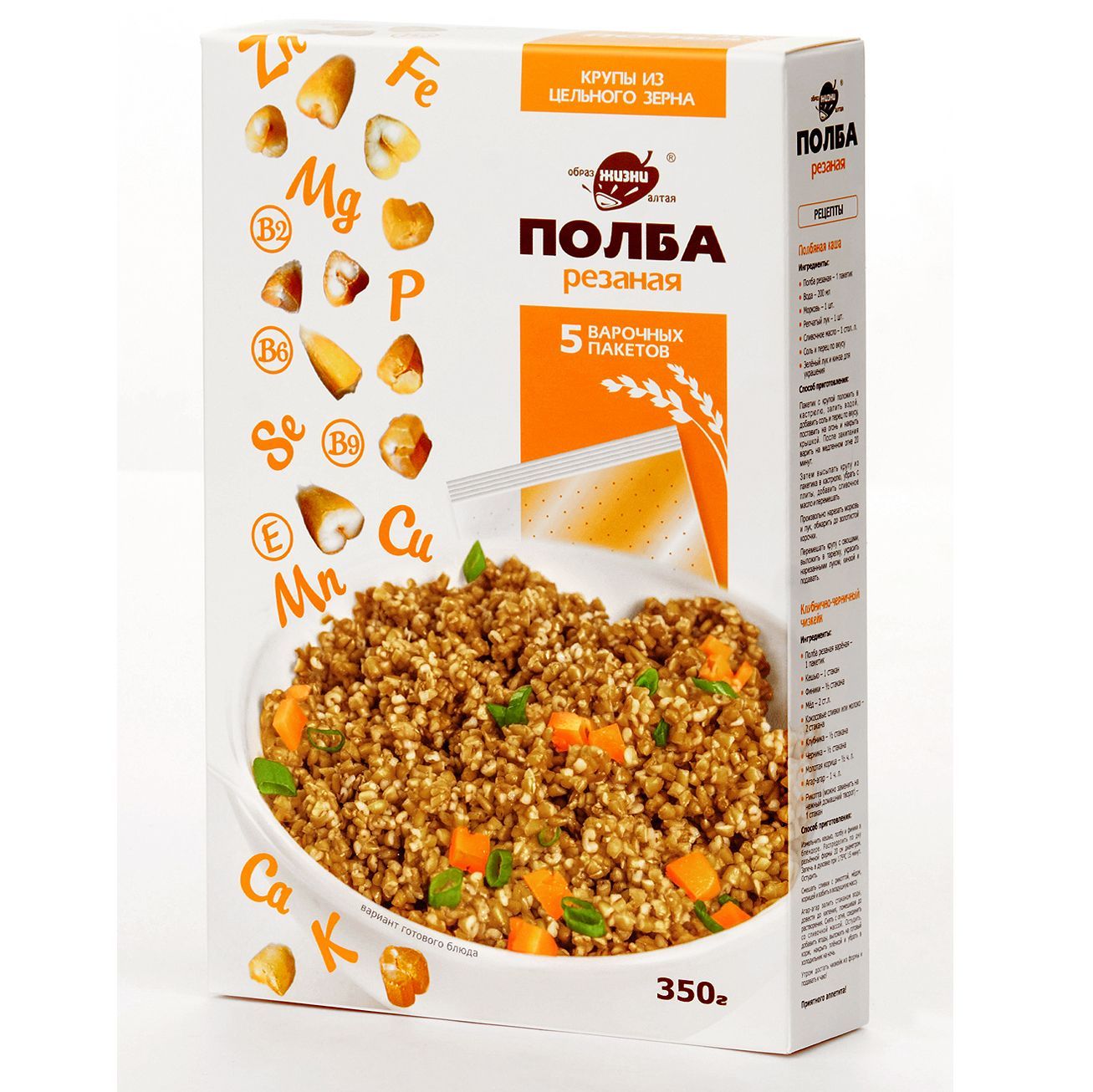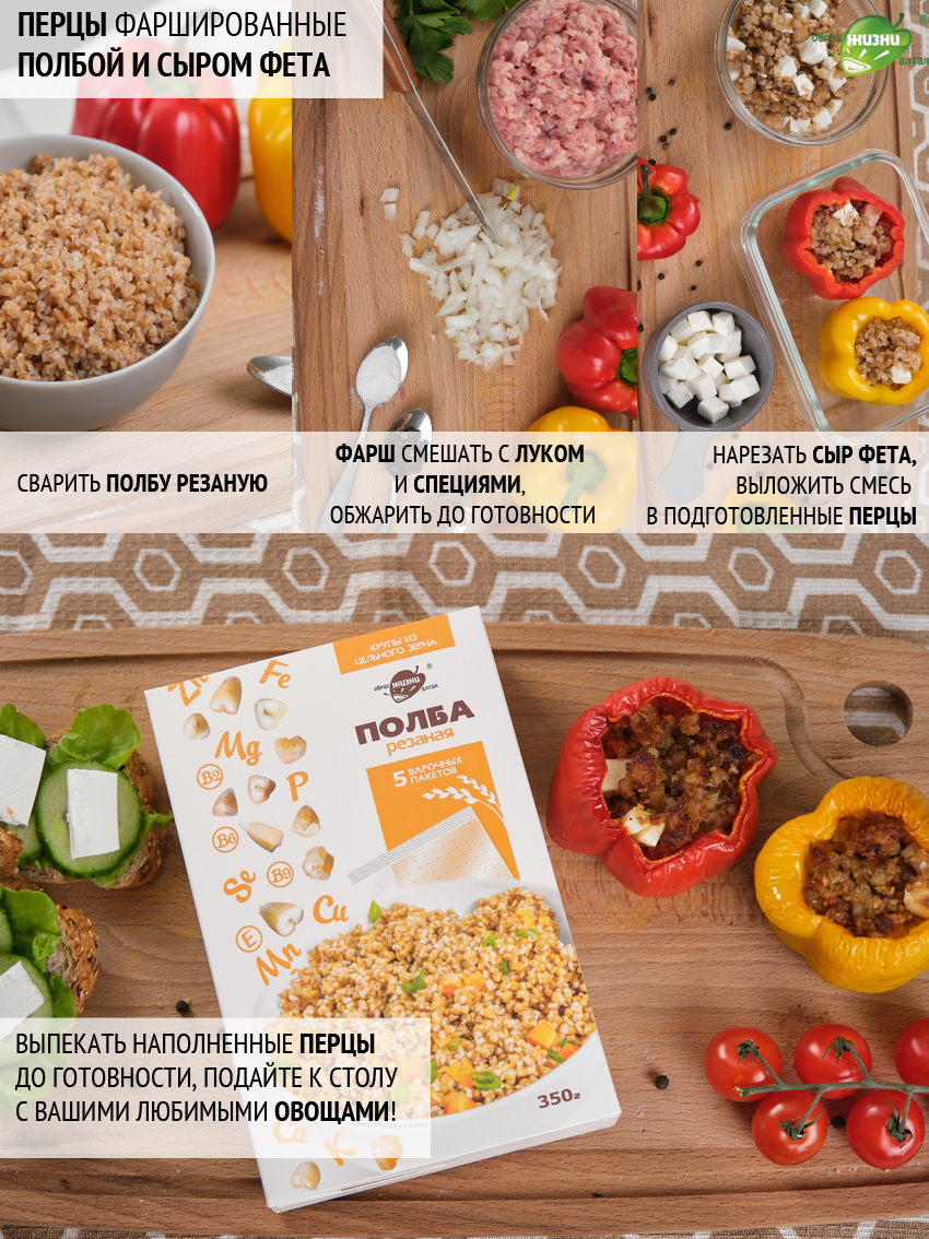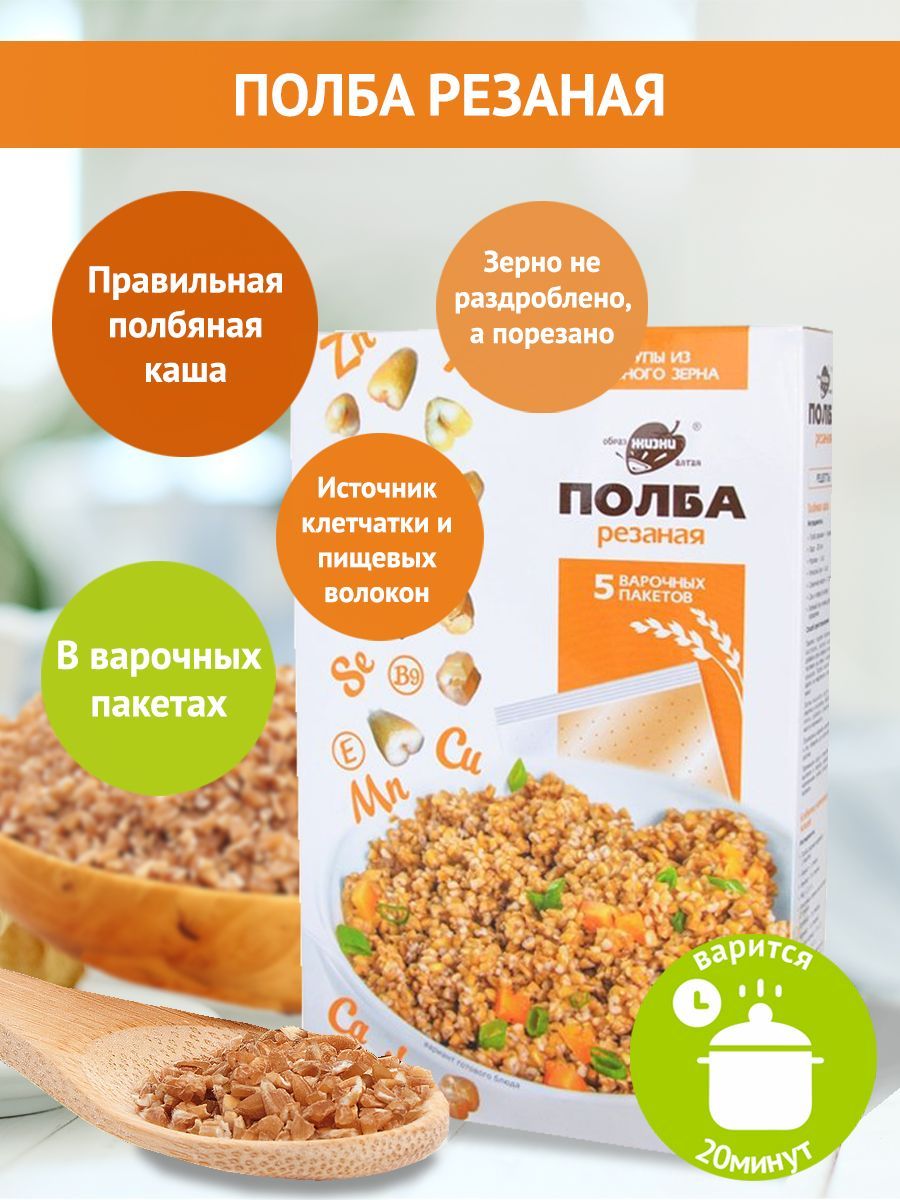 Описание: Полбяная цельнозерновая каша известного бренда "Образ жизни Алтая" - теперь напрямую от производителя! Крупа в варочных пакетах - это удобно, каша в пакетиках не прилипает к кастрюле, не нужно отмерять воду. ПолбаПолба - это прародительница современной пшеницы ( пшеница двузернянка ). Исконно почитаемый нашими предками злак, который содержит огромное количество микроэлементов и все необходимые аминокислоты. Польза цельного зернаПолба содержит магний, калий, цинк и витамины группы В, Е и РР. Мы изготавливаем крупы только из живого зерна, которое сохранило возможность прорастать. Все содержащиеся в зерне полезные элементы находятся в идеально сбалансированном для человека виде. Полезные каши и выпечкаВключив резаное зерно полбы в свой повседневный рацион, вы способствуете нормализации уровня сахара, укрепите иммунитет, улучшите работу пищеварительной, нервной и эндокринной систем. Также вы значительно снизите риск заболеваний сердца. Крупа в варочных пакетахТеперь любимая крупа в новом формате - крупа в пакетах для варки. Вкусно и полезноБлагодаря равномерной структуре, резаная полба просто и быстро готовится.Зародыш и оболочка зернаВажно отметить, что зерно было бережно порезано. Так оно варится быстро - за 20 минут, но содержит в себе всю пользу цельного зерна, которое варится в разы дольше. Полбяная каша приятной консистенцииКрупинки равномерно впитывают влагу и быстро развариваются без предварительного замачивания. Готовые блюда имеют приятную текстуру и насыщенный аромат. Продукция напрямую от производителяВсегда свежая крупа от производителя. С полбой готовят полезные каши и гарниры, добавляют её в супы, выпечку, хлеб. Постный продукт, подходит для постных рецептов.В одной упаковке - 5 пакетиков для варки. Пакеты для варки изготовлены из специального пищевого пластика и не несут никакого вреда. Полба содержит глютен, а также может содержать следы кунжута и сои. Крупы в варочных пакетиках - это просто. Не нужно предварительно промывать крупы, варится 15-20 минут - еда на каждый день! Множество вариантов использованияМножество рецептов, в которых можно использовать полбу вместо обычных круп, привычные гречка и рис можно заменить - полба с грибами, полба с овощами, полбяная каша с мясом. Вкусный ужин с полбой резанойЦельнозерновая каша полезнее, чем хлопья. Рецепт фаршированных перцев Продукт подойдет для похудения и диеты, так как благодаря медленному всасыванию углеводов, снижает ощущение голода.