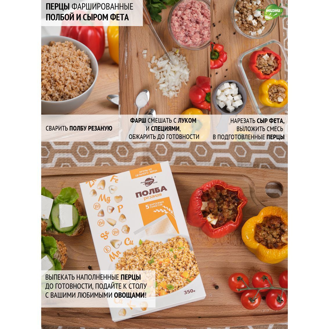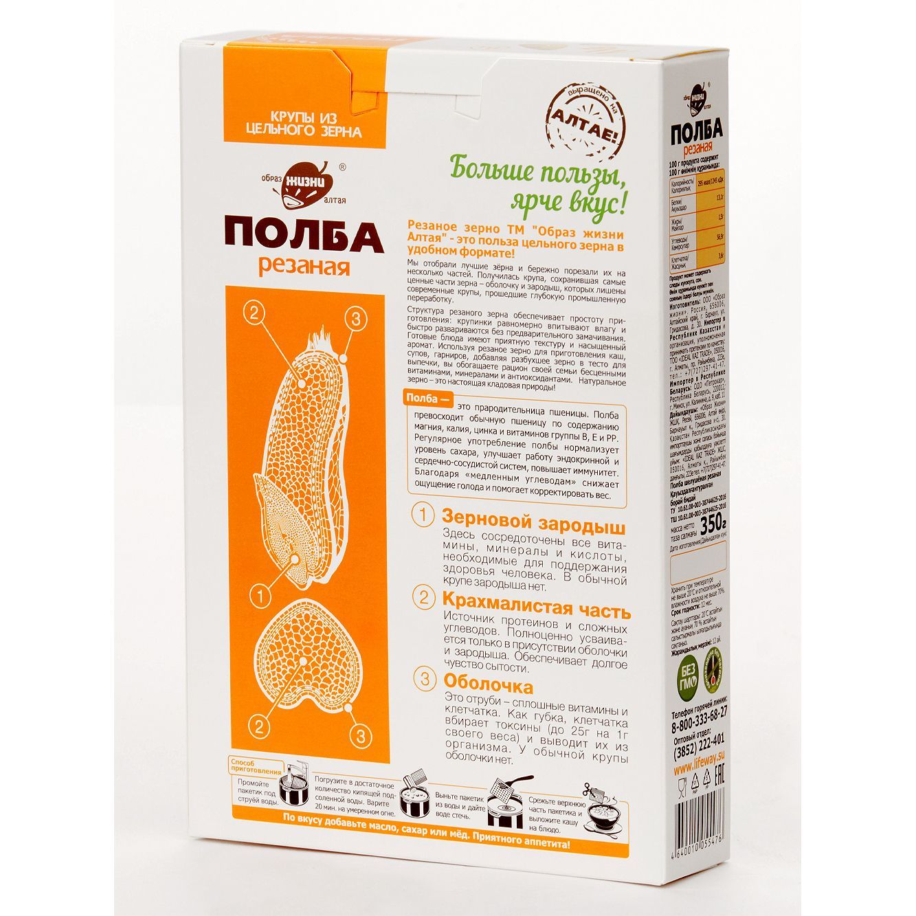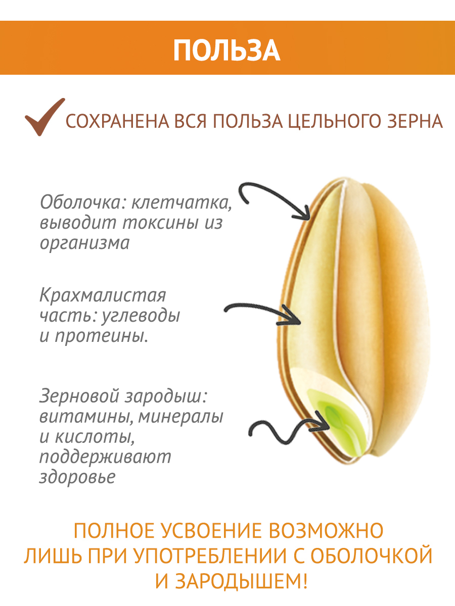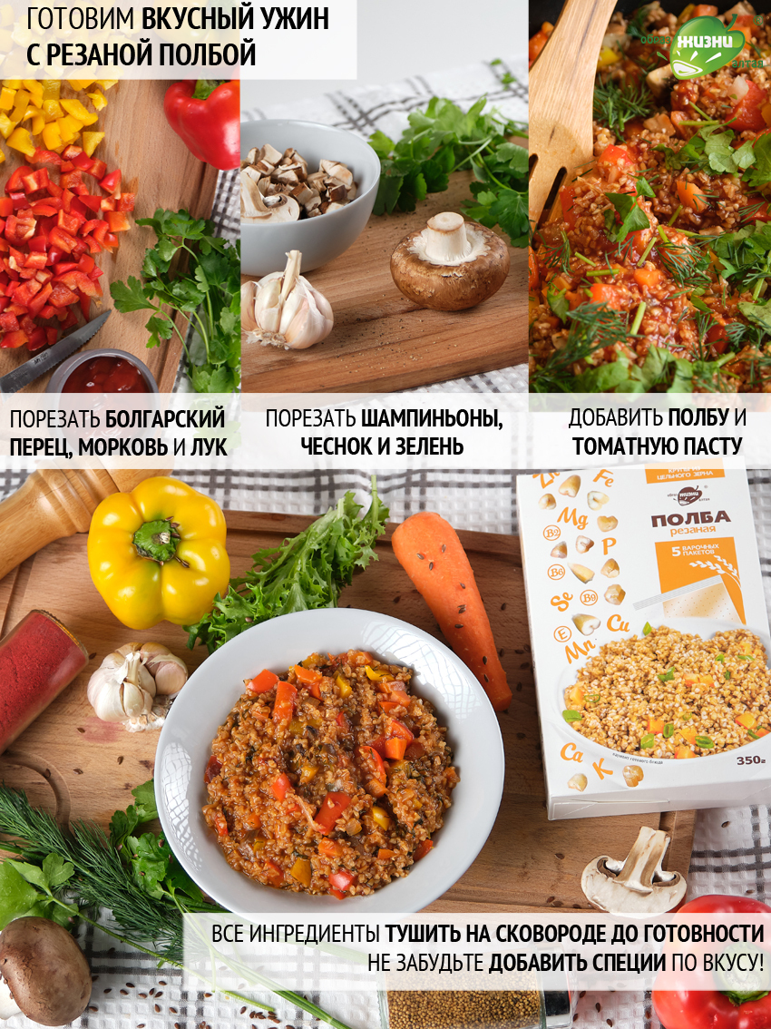 Описание: Полбяная цельнозерновая каша известного бренда "Образ жизни Алтая" - теперь напрямую от производителя! Крупа в варочных пакетах - это удобно, каша в пакетиках не прилипает к кастрюле, не нужно отмерять воду. ПолбаПолба - это прародительница современной пшеницы ( пшеница двузернянка ). Исконно почитаемый нашими предками злак, который содержит огромное количество микроэлементов и все необходимые аминокислоты. Польза цельного зернаПолба содержит магний, калий, цинк и витамины группы В, Е и РР. Мы изготавливаем крупы только из живого зерна, которое сохранило возможность прорастать. Все содержащиеся в зерне полезные элементы находятся в идеально сбалансированном для человека виде. Полезные каши и выпечкаВключив резаное зерно полбы в свой повседневный рацион, вы способствуете нормализации уровня сахара, укрепите иммунитет, улучшите работу пищеварительной, нервной и эндокринной систем. Также вы значительно снизите риск заболеваний сердца. Крупа в варочных пакетахТеперь любимая крупа в новом формате - крупа в пакетах для варки. Вкусно и полезноБлагодаря равномерной структуре, резаная полба просто и быстро готовится.Зародыш и оболочка зернаВажно отметить, что зерно было бережно порезано. Так оно варится быстро - за 20 минут, но содержит в себе всю пользу цельного зерна, которое варится в разы дольше. Полбяная каша приятной консистенцииКрупинки равномерно впитывают влагу и быстро развариваются без предварительного замачивания. Готовые блюда имеют приятную текстуру и насыщенный аромат. Продукция напрямую от производителяВсегда свежая крупа от производителя. С полбой готовят полезные каши и гарниры, добавляют её в супы, выпечку, хлеб. Постный продукт, подходит для постных рецептов.В одной упаковке - 5 пакетиков для варки. Пакеты для варки изготовлены из специального пищевого пластика и не несут никакого вреда. Полба содержит глютен, а также может содержать следы кунжута и сои. Крупы в варочных пакетиках - это просто. Не нужно предварительно промывать крупы, варится 15-20 минут - еда на каждый день! Множество вариантов использованияМножество рецептов, в которых можно использовать полбу вместо обычных круп, привычные гречка и рис можно заменить - полба с грибами, полба с овощами, полбяная каша с мясом. Вкусный ужин с полбой резанойЦельнозерновая каша полезнее, чем хлопья. Рецепт фаршированных перцев Продукт подойдет для похудения и диеты, так как благодаря медленному всасыванию углеводов, снижает ощущение голода.