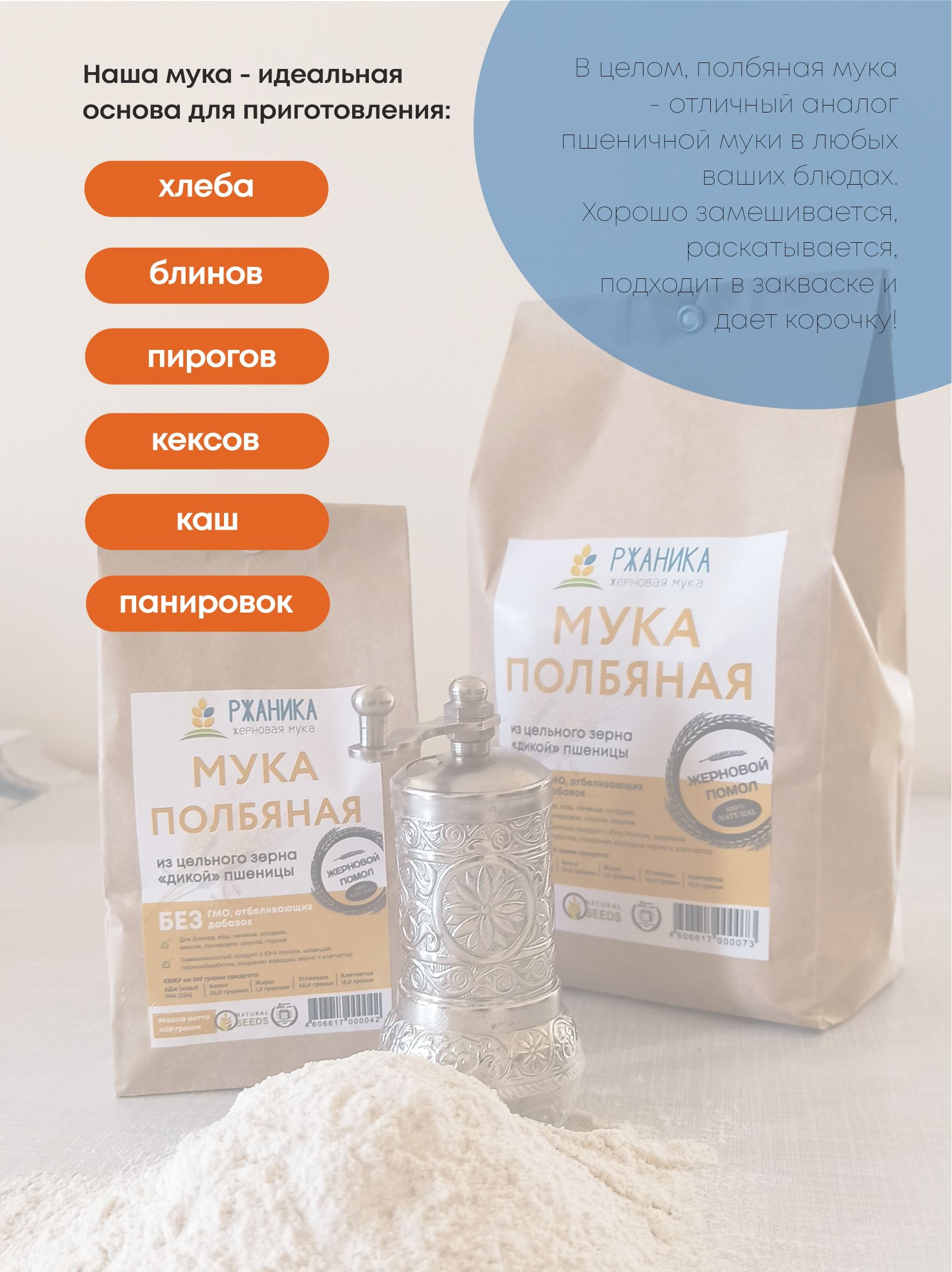 Мука РЖАНИКА полбяная цельнозерновая родом из аграрного Ставропольского края (Благодарненский район). Произведена из культивированного зерна полбы (дикой пшеницы).