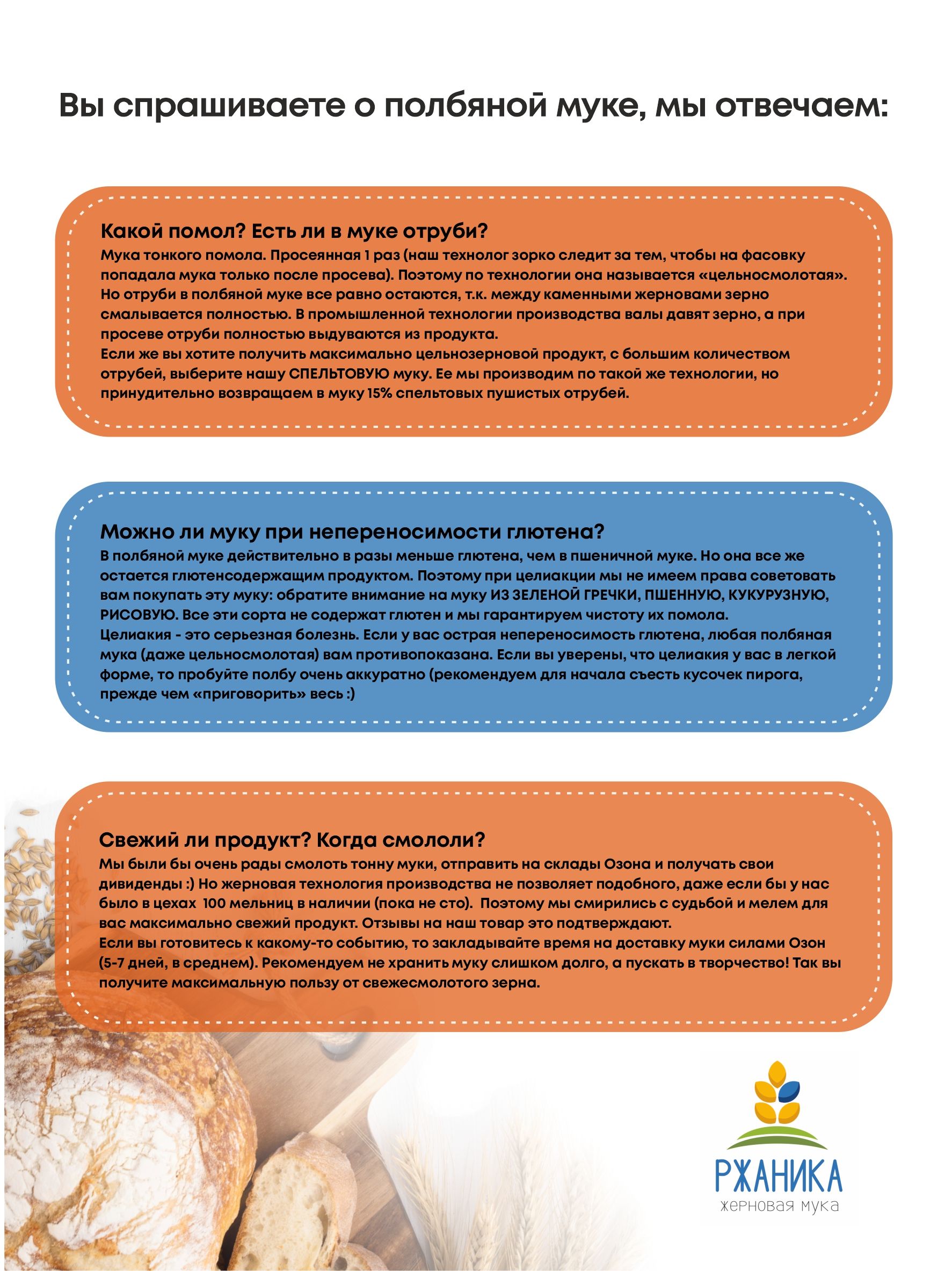 Также мы тщательно следим за раздельным помолом глютен-free и глютеновых зерновых сортов. Аккуратно выбираем поставщиков и сотрудничаем только с экологичными хозяйствами, которые регулярно отправляют пробы зерна в лабораторию. РЖАНИКА - это гарантия натурального помола любого продукта на жерновах! Будем рады увидеть Ваш отзыв о качестве нашего продукта в карточке продукта.