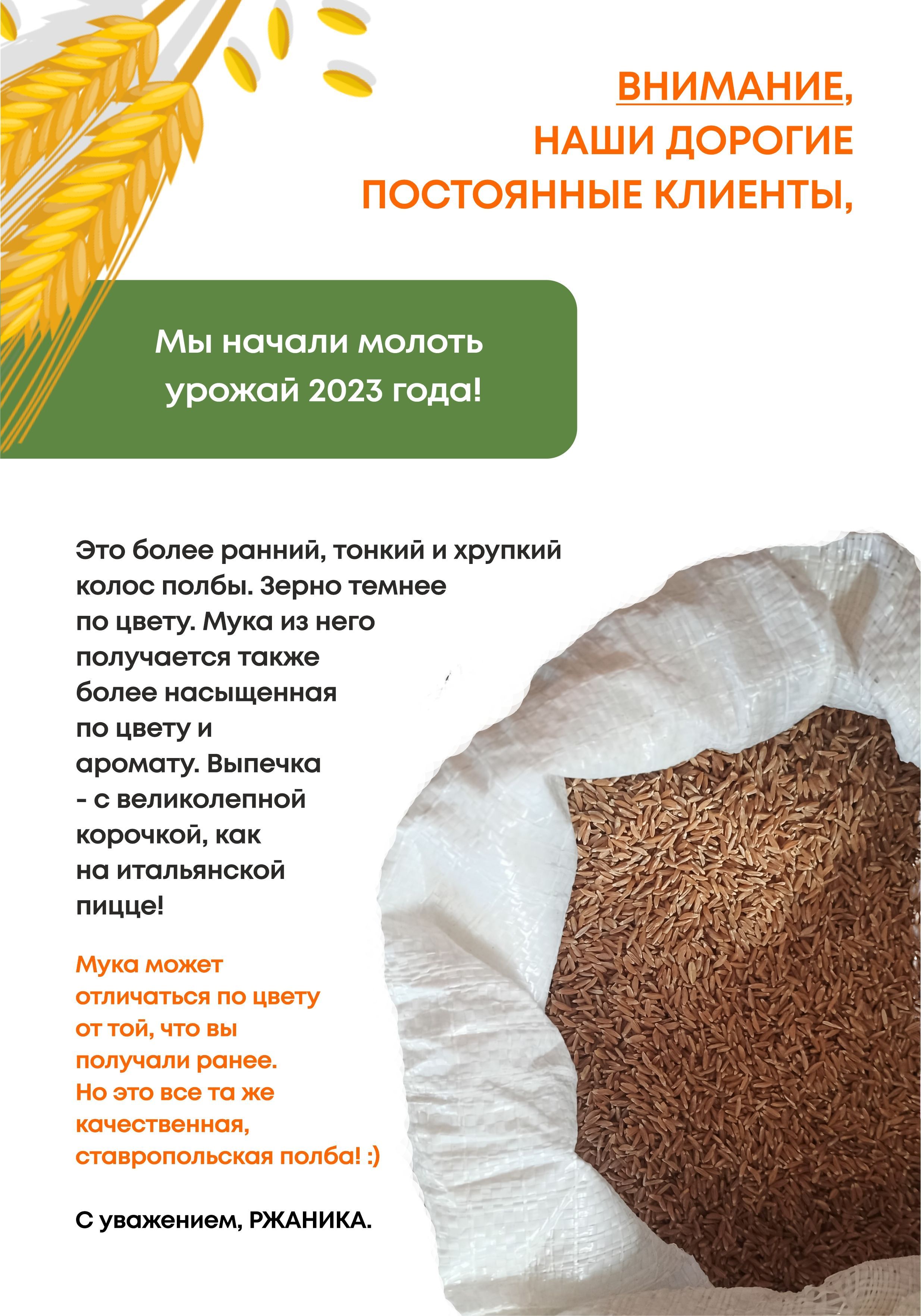 Описание: Обратите внимание: РЖАНИКА начала молоть урожай полбы 2023 года. Вы получите муку нового урожая - немного темнее и ароматнее, чем заказывали у нас ранее. Это не брак, а все та же свежайшая, ставропольская полба!