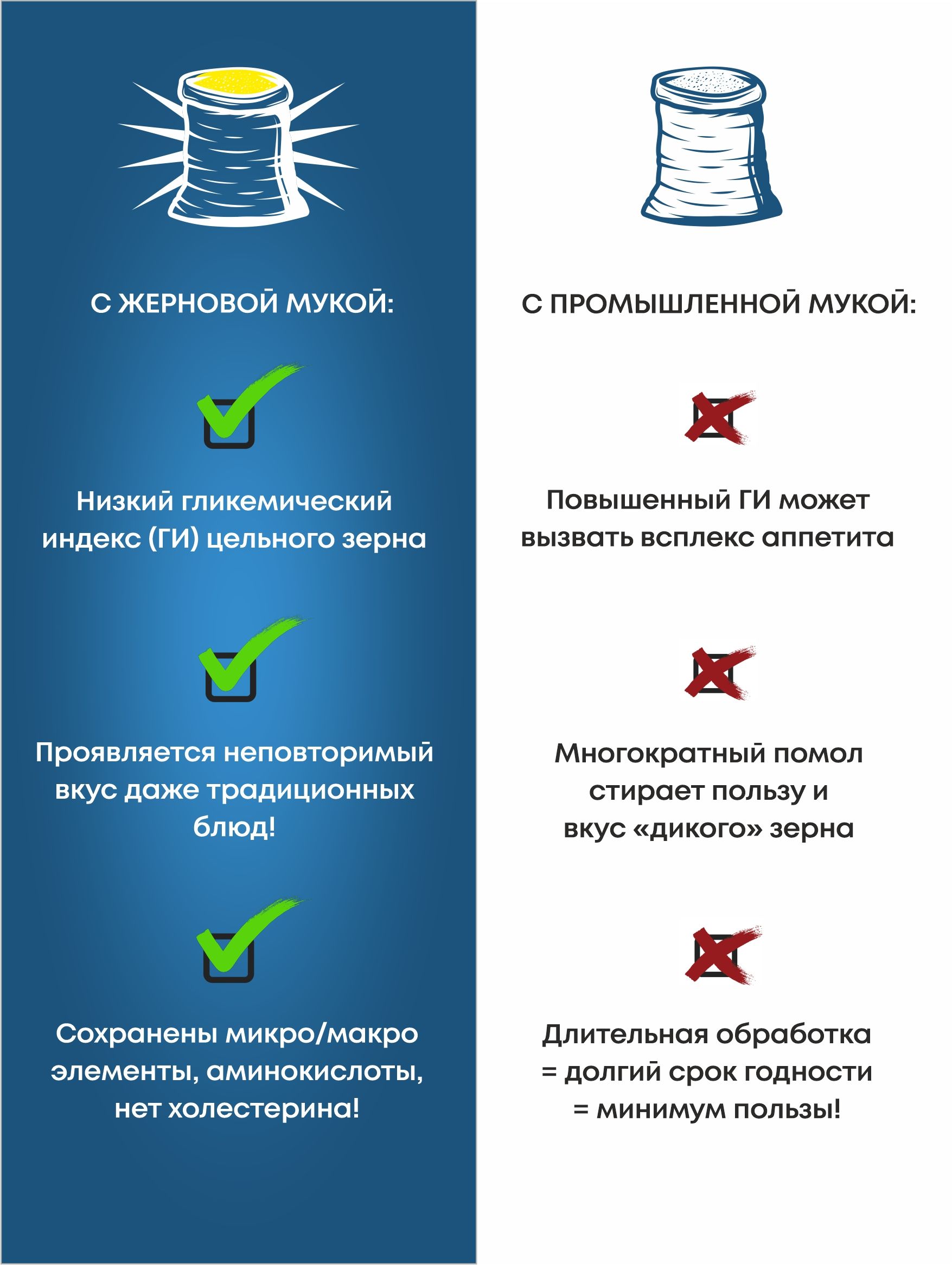 Мы изготавливаем муку на «заневоленных» каменных жерновах. Благодаря этому зерно попадает в мельницу всего 1 раз и смалывается на 93-96% в муку. При такой технологии производства исключен перегрев продукта, за счет чего в муке сохраняются все полезные свойства зерна урожая этого года. С жерновой мукой вы почувствуете, насколько необычным станет вкус ваших привычных блюд! Даже простая "Шарлотка" или оладьи превратятся в настоящий кастомный продукт за счет бережного обращения с зерном, которое доставляется Вам свежесмолотым. Сравните: благодаря замене пшеничной муки на полбяную вы получаете гораздо пользы от привычной еды - в разы больше белка и меньше углеводов.