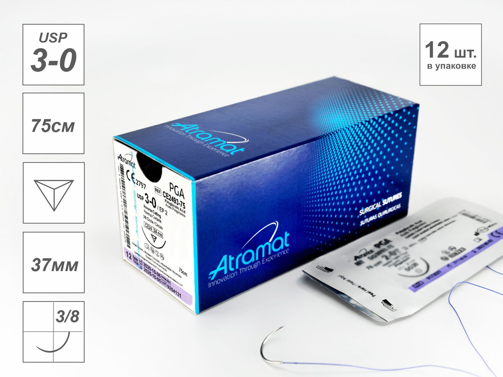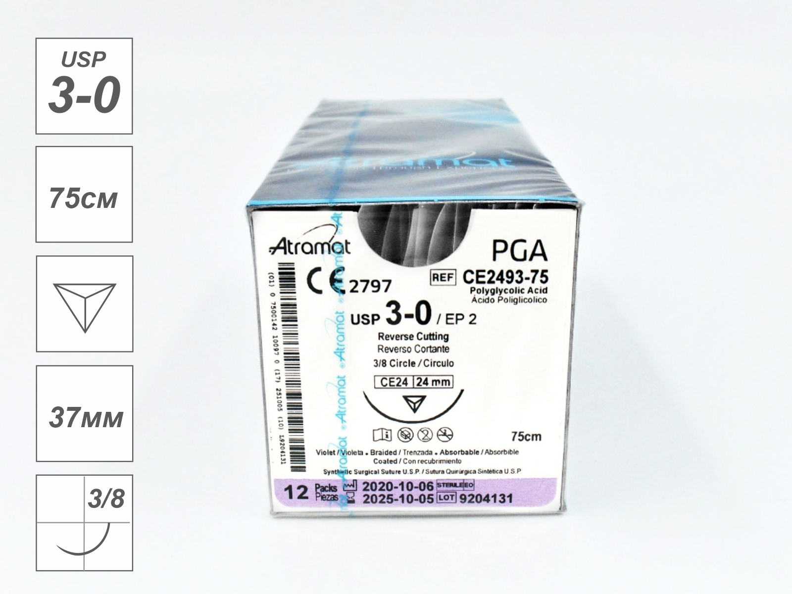 Полигликолид (ПГА, PGA), шовный материал АТРАМАТ, USP 3-0 фиолетовый 75см, игла обратно-реж. 24мм 3/8, CE2493-75 ATRAMAT, пр-во Мексика, 12 шт/уп