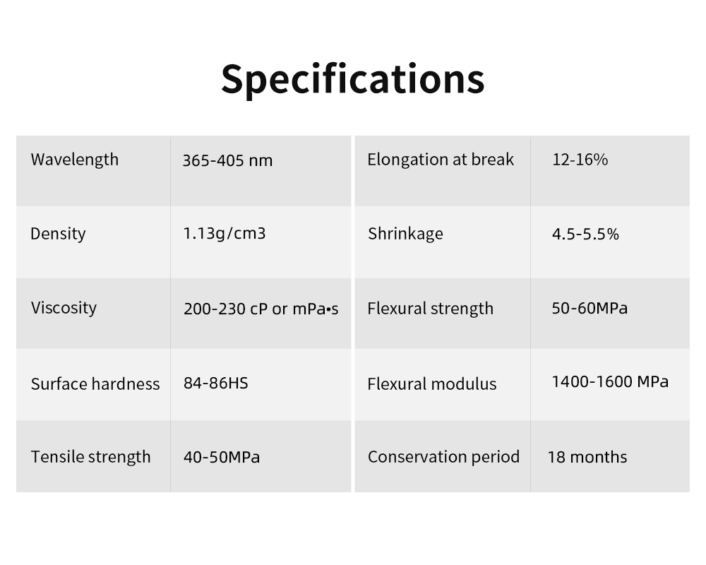 Wavelength 365-405nm             Elongation at break 12-16%