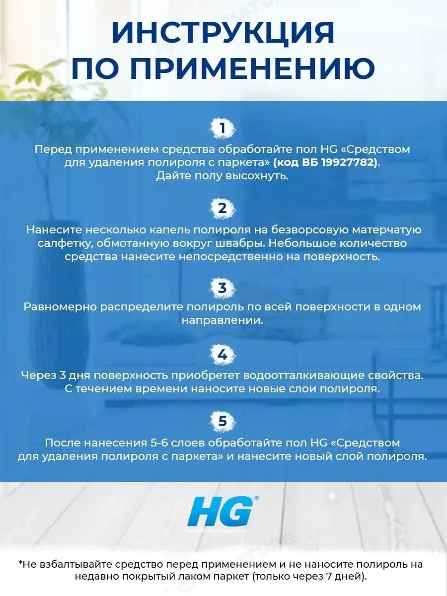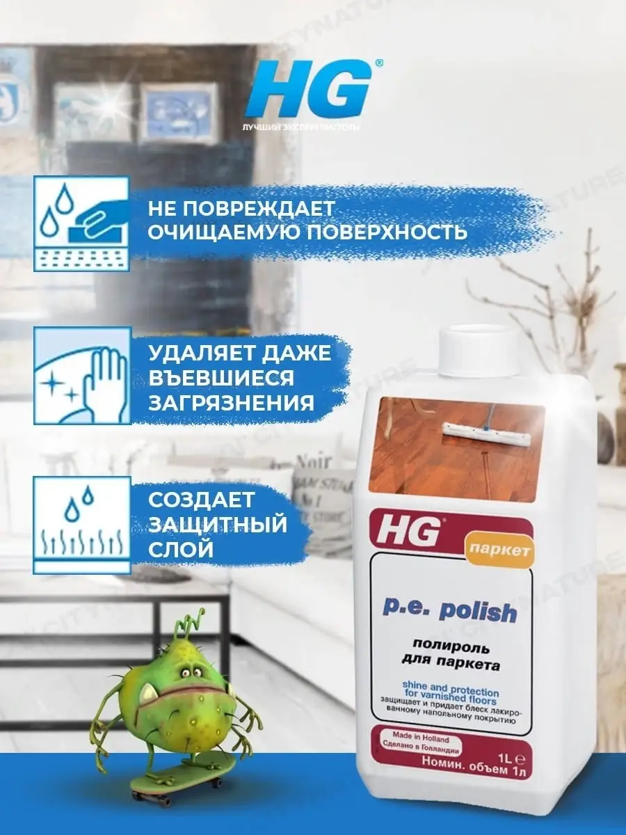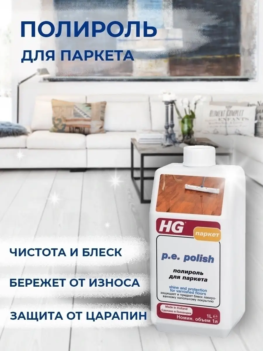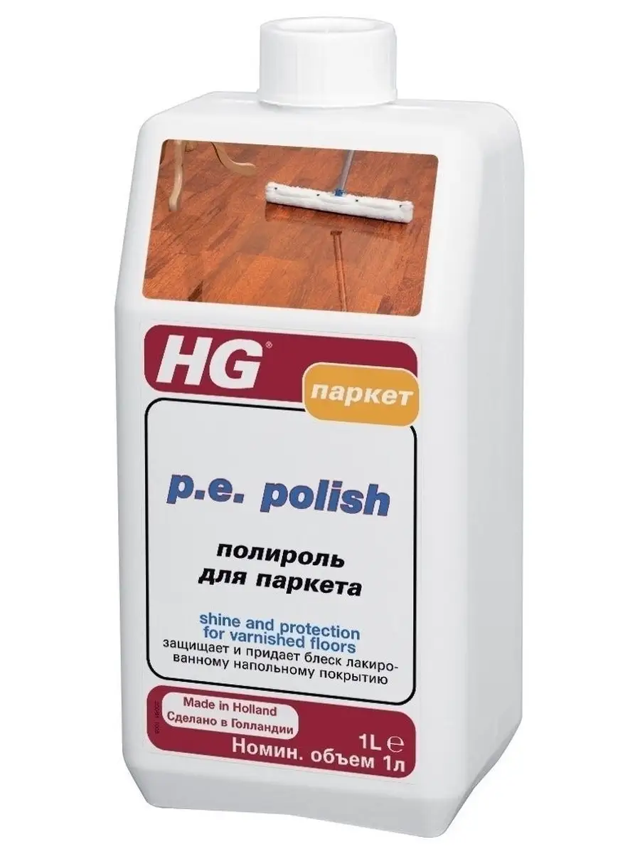 Описание: Средство для ухода за паркетом и другими деревянными поверхностями защищает лаковое покрытие от износа, царапин и сильных загрязнений, создавая при этом прекрасный блеск. Средство для мытья полов это европейское качества для чистоты в доме. Призведено в Нидерландах. Бытовая химия для дома HG. Универсальное средство для уборки поможет справиться с загрязнениями дома. Моющая жидкость легко удаляет загрязнения с ламината, деревянного паркета, кафельной плитки и других твердых поверхностей. Жидкость для мытья плов даже в холодной воде справляется с въевшимися пятнами на напольных покрытиях, стенах и корпусной мебели, а также с неприятными запахами и не оставляет разводов. Бытовая химия для пола обладает антибактериальным эффектом. Хозяйственное средство для дома подходит для ежедневной и генеральной уборки пола, плитки в ванной комнате и туалете, может применяться как полироль для мебели. Благодаря уникальным компонентам, входящим в состав, средство для мытья пола эффективнее убирает грязь и пыль в труднодоступных местах. Чистящее средство обладает эффектом антистатика. Очищающий мягкий гель для уборки делает поверхность чистой в два раза дольше. Уникальный комплекс жидкости для пола эффективно удаляет загрязнения и неприятные запахи даже в холодной воде.