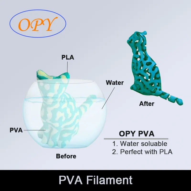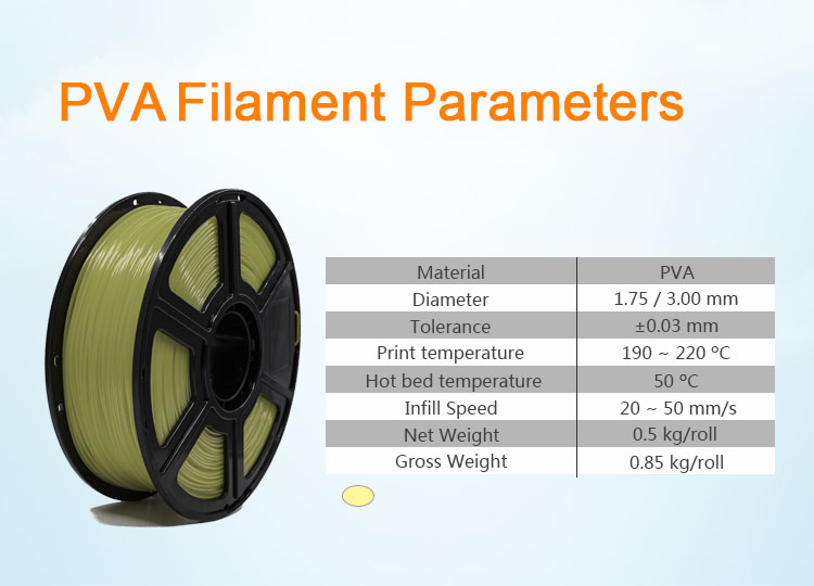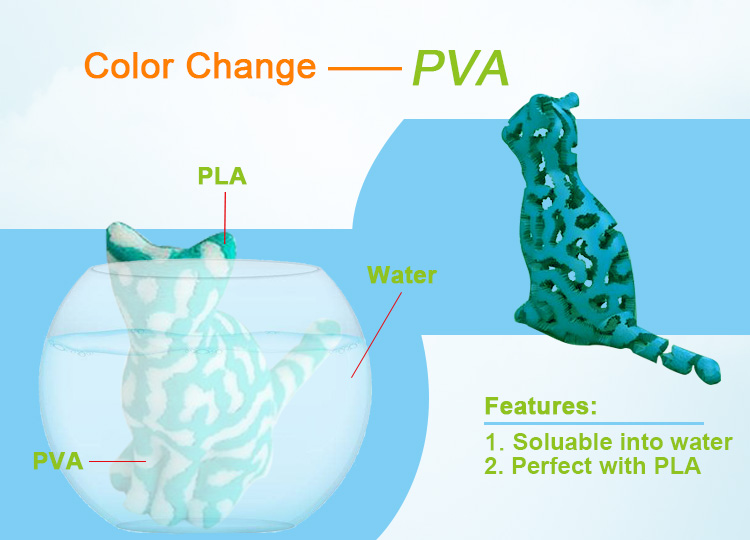 Нить ПВА известна как Водорастворимая нить, которая является опорным материалом и хорошо сочетается с ПЛА.