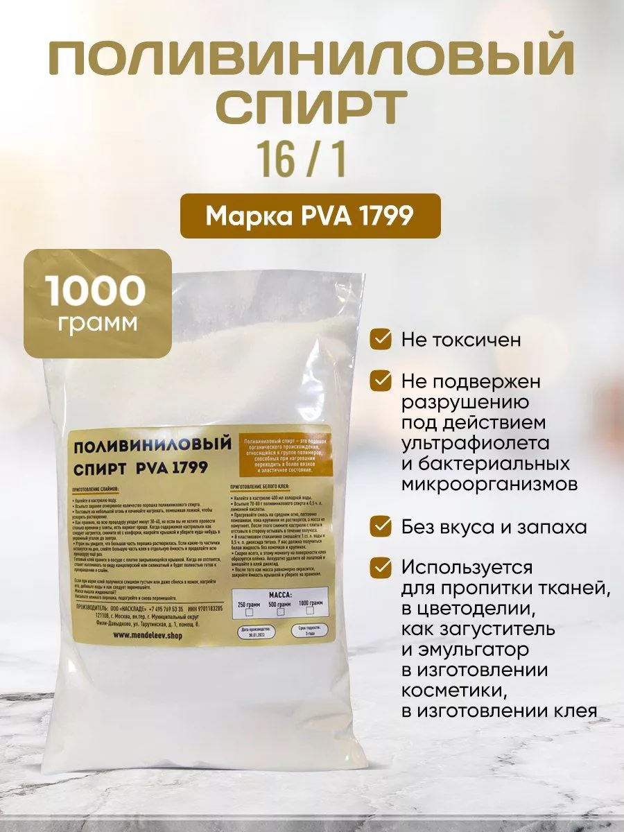 Описание: Поливиниловый спирт - органическое вещество, термопласт, водорастворимое полимерное соединение. ПВС 1799 - аналог 27/1. Загуститель и клеящий агент в клеях ПВА. Применяется для склеивания бумаги, кожи, тканей и других материалов. Отлично подходит для создания слайма, потому что его клеящие свойства на много лучше чем у других аналогов.