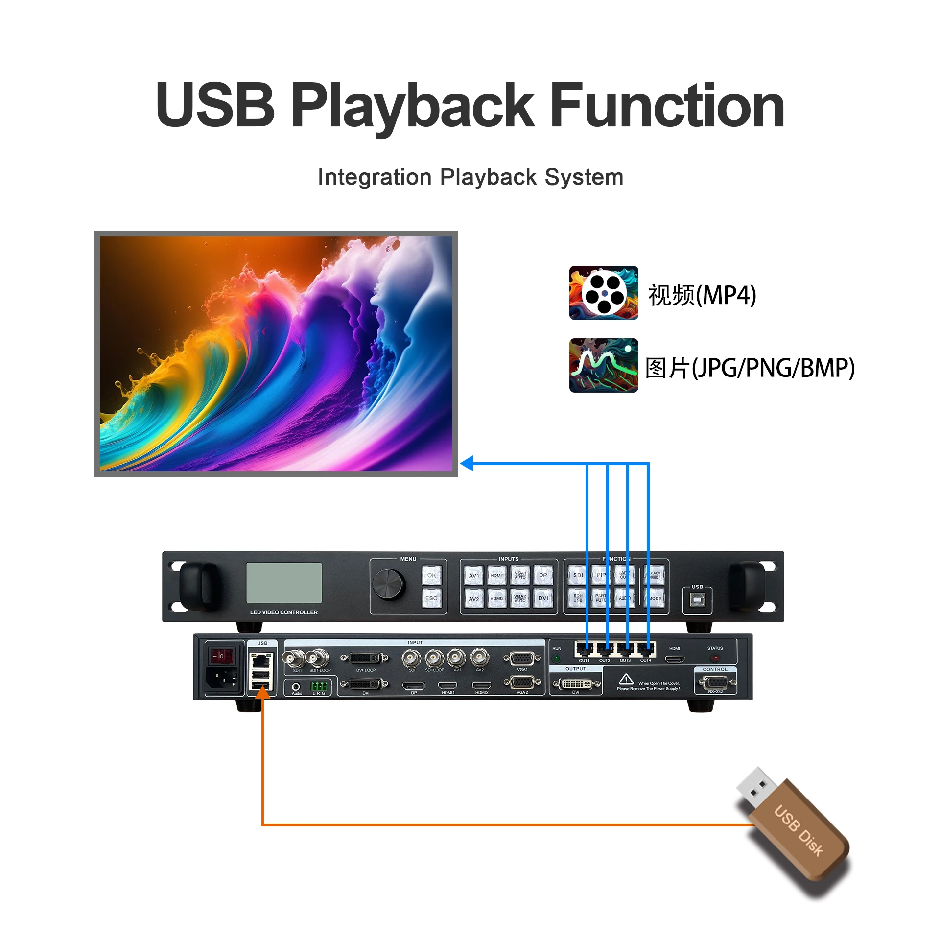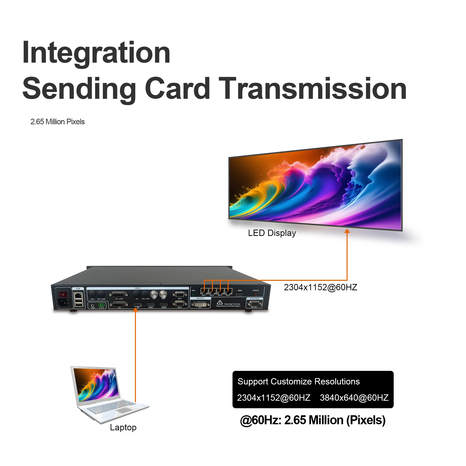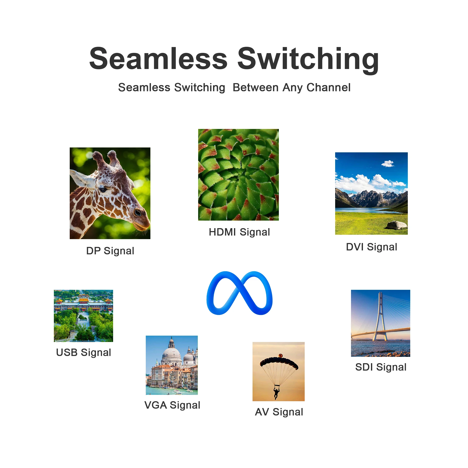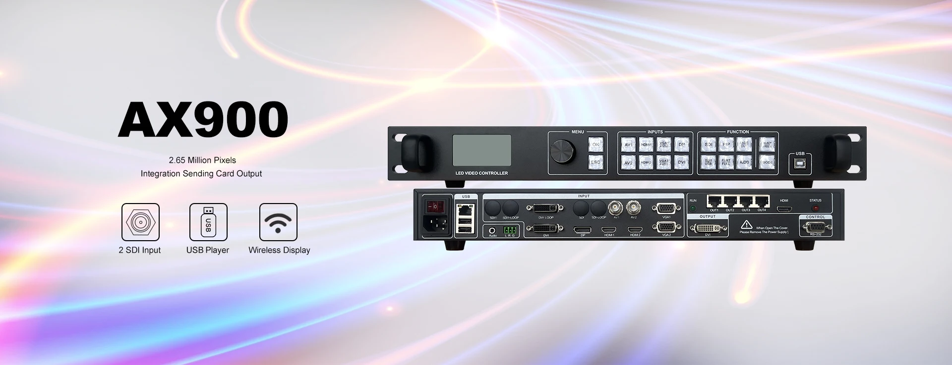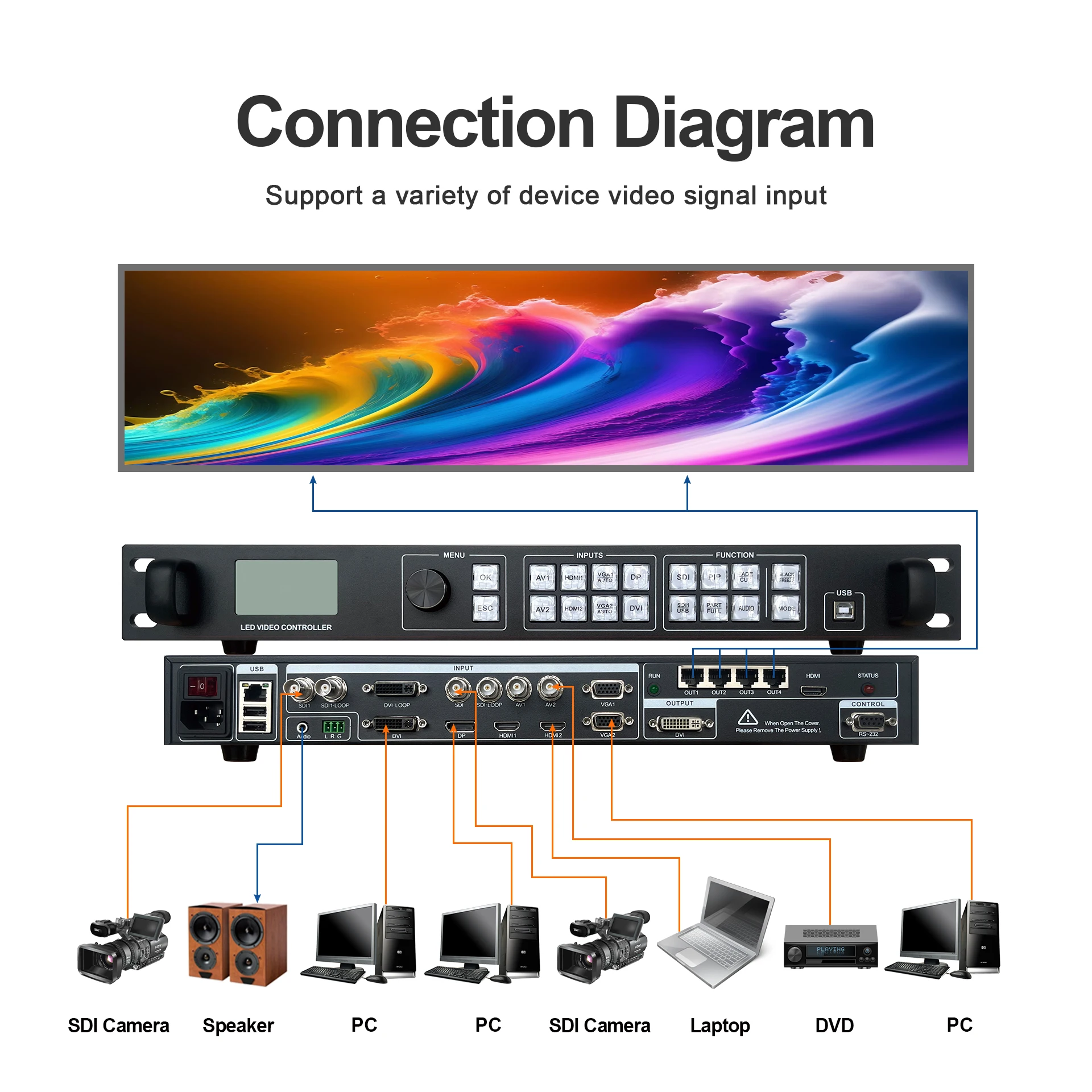 MoreChannel видео вход -LED Video Controller8/9-канальный видеовход, 1 DP,1 DVI, 2 HDMI,2AV(CVBS),2 VGA, 1/2 3G-SDI или 1 USB/ WiFi (расширение); В основном охватывает гражданское и промышленное использование. Все видеовходы переключаются и обеспечивают быстрое отключение и затухание переходов.