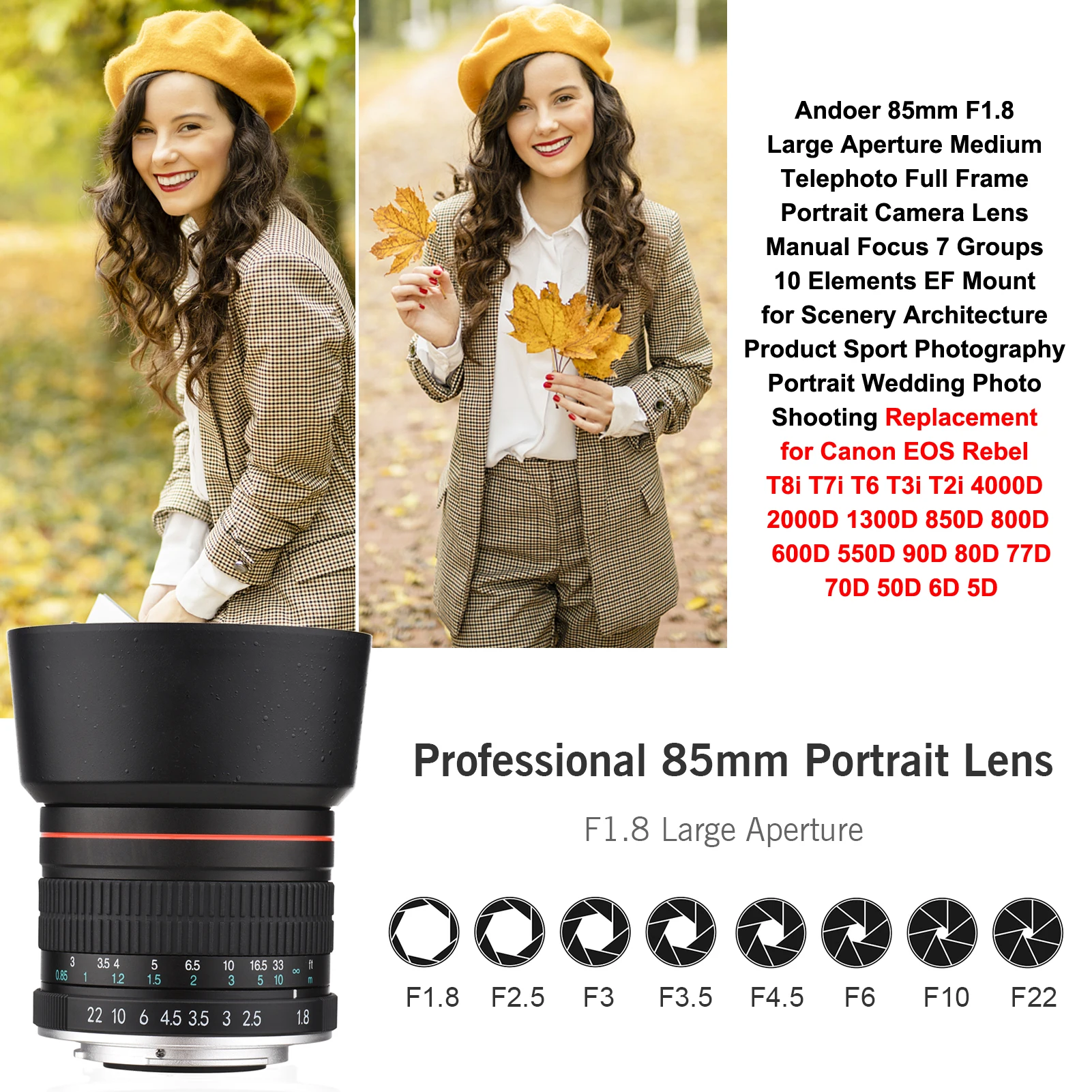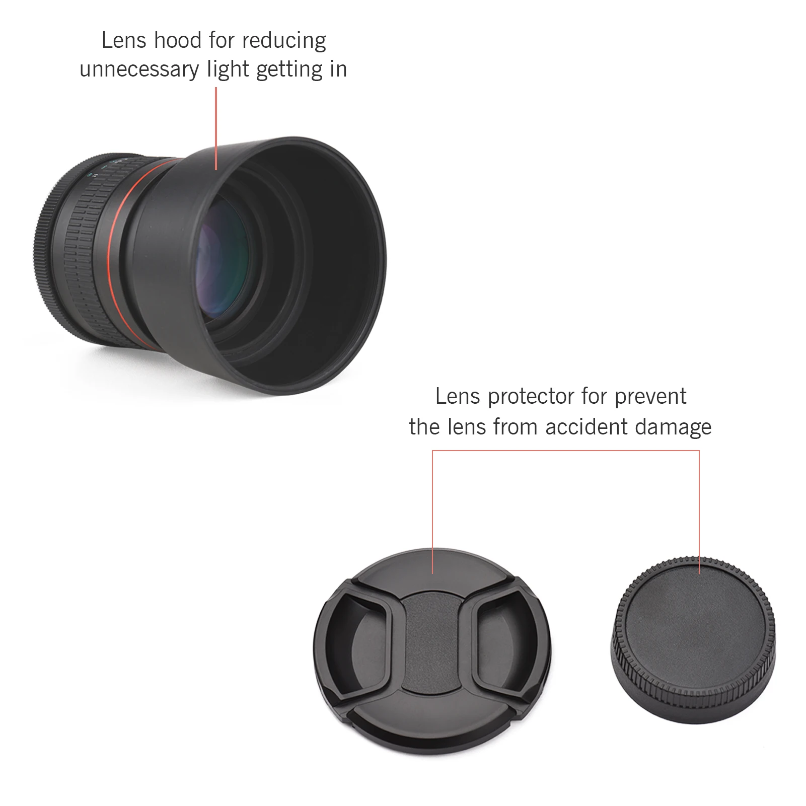 【Ручной фокус и Большая диафрагма 】Объектив ручной фокусировки камеры с фокусным расстоянием 85 мм и большой апертурой F1.8, что обеспечивает лучший эффект размытия фона и делает съемные объекты более заметными.