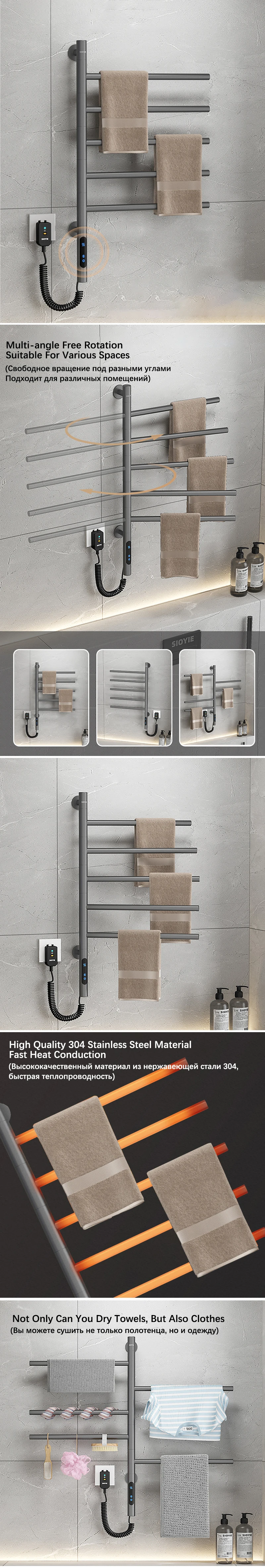 Полотенцесушитель с электрическим подогревом для ванной комнаты. 304 из нержавеющей стали, электрическая вешалка для полотенец. Тепловое полотенце с углом поворота 180 °, обогреватель полотенец