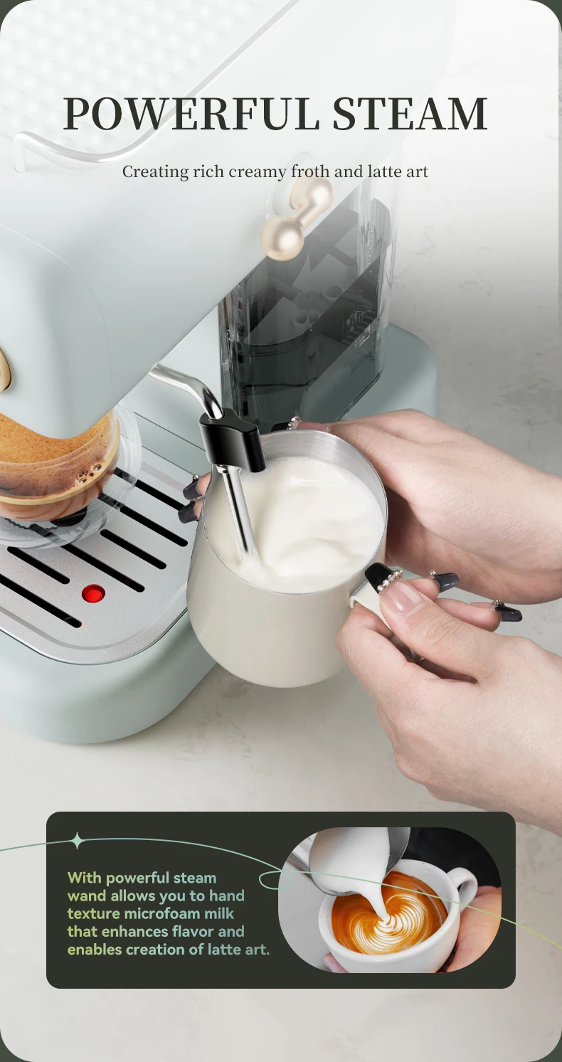 ☕️ 【СТАБИЛЬНЫЙ ПАРОВЫЙ УПРАВЛЕНИЕ】: Ручная Паровая палочка при правильном давлении пара может создавать тысячи крошечных пузырьков, смешанных с воздухом и паром, превращая молоко в шелковистую гладкую микропену.