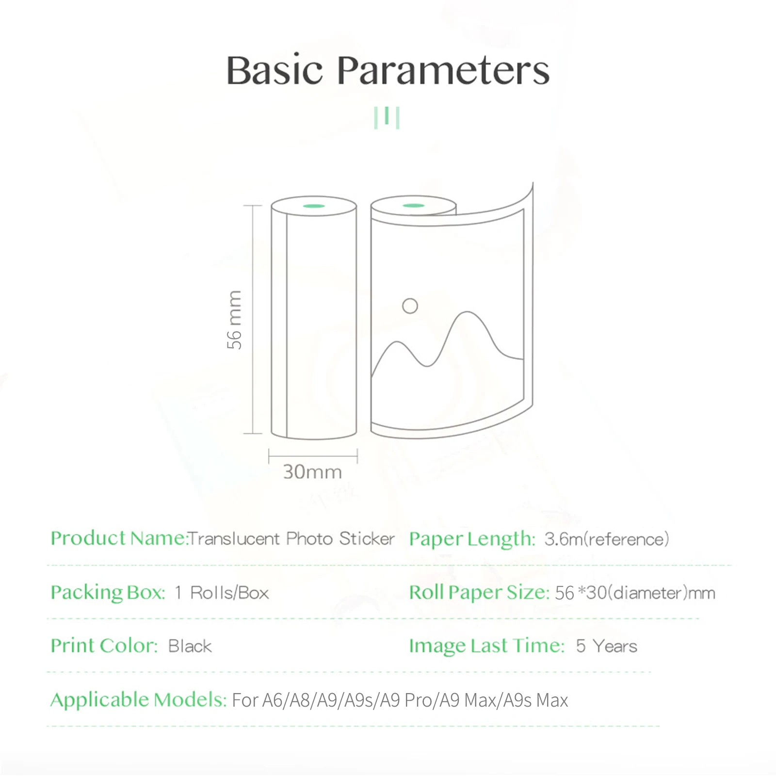 1 рулон полупрозрачной фото наклейки, размер рулона бумаги 56*30 мм, печатное содержимое может храниться в течение 5 лет.