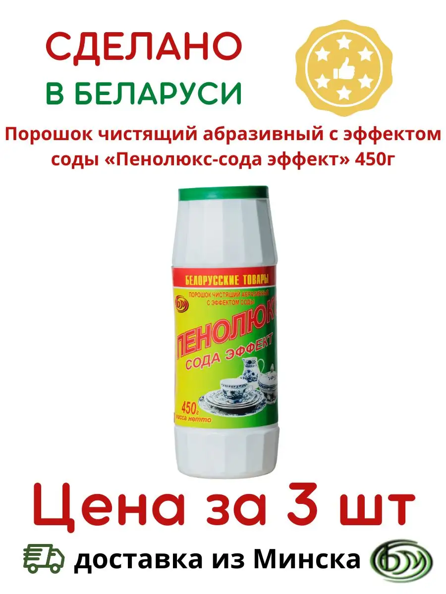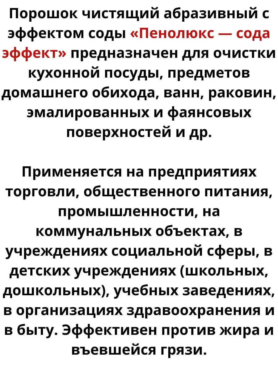 Описание: Порошок чистящий абразивный с эффектом соды «Пенолюкс- сода эффект» предназначен для очистки кухонной посуды, предметов домашнего обихода, ванн, раковин, эмалированных и фаянсовых поверхностей и др. Удаление всех видов загрязнений,жира,накипи.Подходит для чистки керамических и других твердых поверхностей.Это чистящее средство-без агрессивных химикатов и хлора.С осторожностью использовать на лакированных,алюминиевых и пластиковых поверхностей. Пенолюкс- сода эффект быстро поможет удалить даже трудновыводимые пятна. В комплекте идет 2 банки по 450гр. Отлично подойдет вместо чистящей пасты типо Суржи