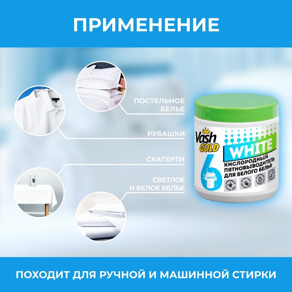 Пятновыводитель, отбеливатель Vash Gold c активным кислородом. Пятновыводитель Ваш голд предназначен для стирки белого белья. Отбеливатель для стирки Вашголд ЭКО специально разработан для эффективного удаления пятен и отбеливания всех видов тканей. Усилитель порошка с отбеливающим эффектом Вашголд удаляет трудновыводимые пятна кофе, чая, сока, чернил. Может использоваться для усиления действия стирального порошка при автоматической и ручной стирке.