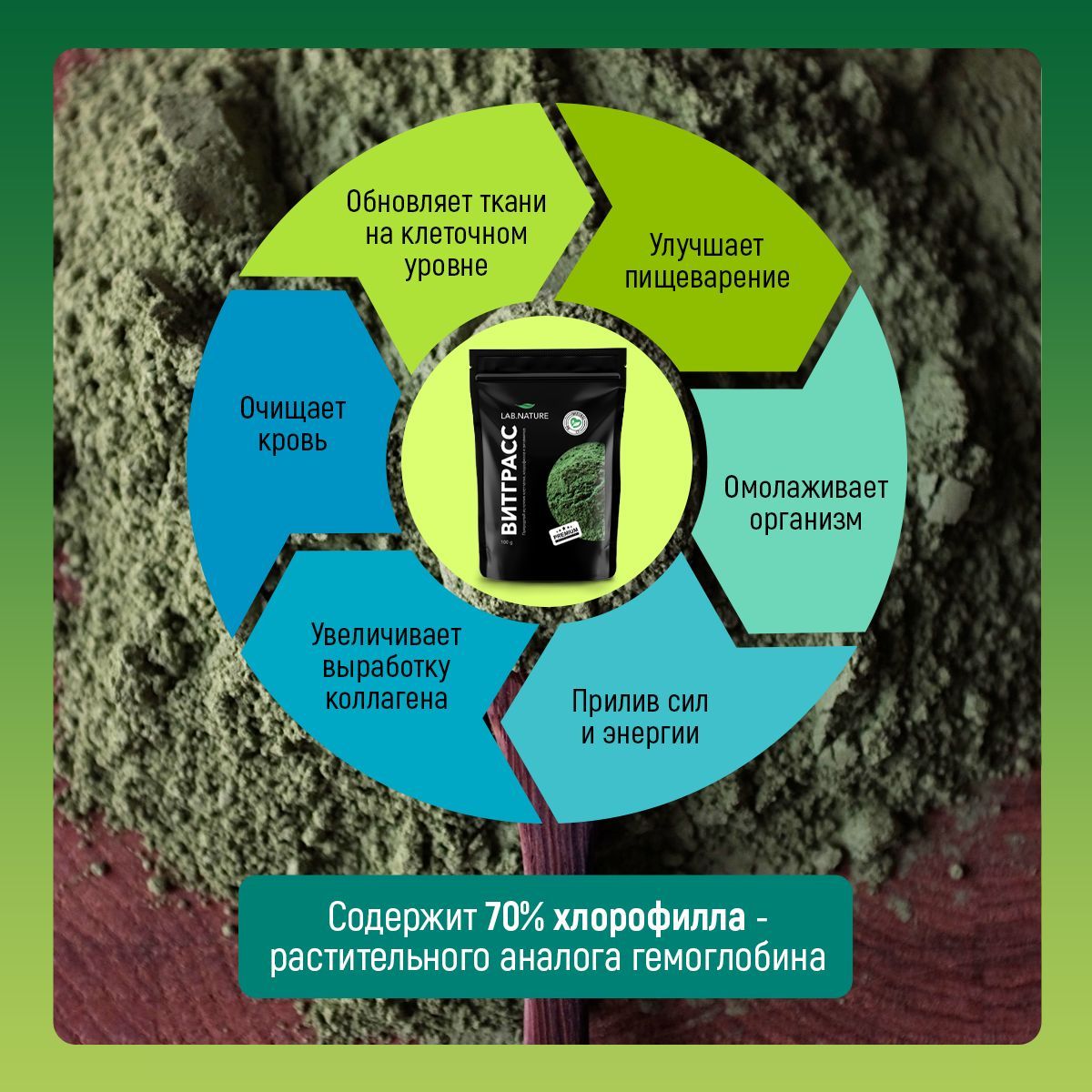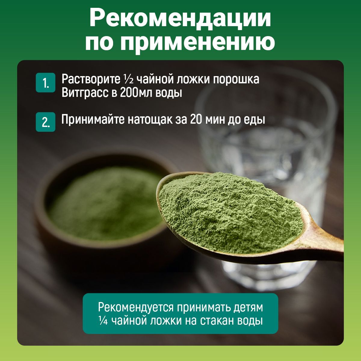 Описание: Витграсс – это микрозелень пшеницы, которая насыщена большим количеством полезных свойств. Органический продукт несёт в себе невероятную пользу. Сила витграсса в высоком уровень хлорофилла (70%). Он помогает очищать кровь, устранять неприятный запах изо рта, вырабатывать коллаген и способствует омоложению.Ростки пшеницы с помощью большого количества клетчатки улучшают работу кишечника и очищают организм от токсинов и шлаков. Витграсс содержит в себе множество витаминов и минералов: А, В1, В2, В3, В4, В5, В6, В7 В8, В12, С, Е, K, PP, бета-каротин, бетаин триметилглицин, железо, холин, фосфор, кальций, калий, цинк, фолиевая кислота, магний, натрий, селен, йод, сера. А также питает организм Омега 3,6,9, чем поддерживает здоровье сердечно-сосудистой системы,и улучшает состояние волос, кожи, ногтей и ресниц. Кажется, что это просто трава. Но доказано, что ростки и зерно пшеницы способны влиять на снижение веса. Начните процесс похудения с био добавки для здоровья. Это не лекарство, а superfood. С ним не надо садиться на кето диету. Суперфуд стимулирует улучшение мозговой деятельности, улучшает настроение, предотвращает депрессию и нервные срывы. Самая удобная и эффективная форма применения витграса - порошок из ростков пшеницы. Свежий сок Витграсса нужно хранить специальным образом. А порошок компактен, удобен в хранении и транспортировке. Эту форму суперфуда можно готовить разными способами: размешивать 1 чайную ложку порошка в соке или воде, или обогащать им пищу. В качестве добавки для еды: добавляйте 1 ложку порошка в овощные супы, салаты, вторые блюда. Если добавите диетический порошок из молодых ростков пшеницы в свой ежедневный рацион, то существенно улучшите состояние всех сфер здоровья. Витграсс в каком то плане энергетик. С ним у вас появиться энергия на фитнес. Используйте семяна для готовки правильного питания и в легко войдете в ряды зож. Витрасс подходит даже для веганского образа жизни.
