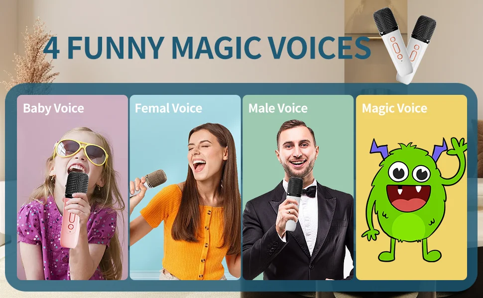 • 【Волшебные голосы】 Модернизированная микрофонная система позволяет отдельно регулировать голос микрофона, эффект эха и громкость музыки, шумоподавление чипа DSP, удаление исходного звука, 4 вида изменения голоса. Лучше звук, больше веселья.