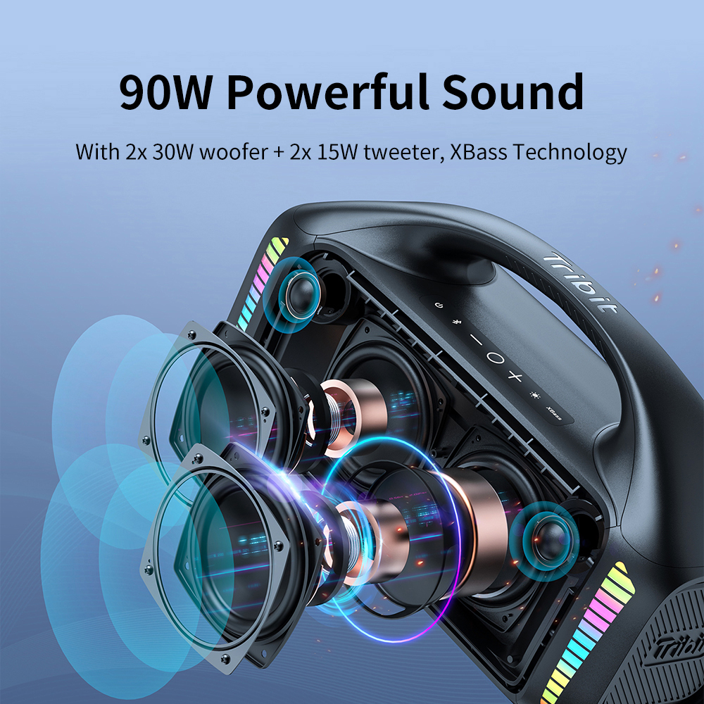 Tribit StormBox Blast, обеспечивающий богатый и сбалансированный звук без искажений,-это мощный портативный динамик мощностью 90 Вт, который вам нужен на вечеринках. Нажмите XBass, чтобы накачать басы и почувствовать дрожание тела.