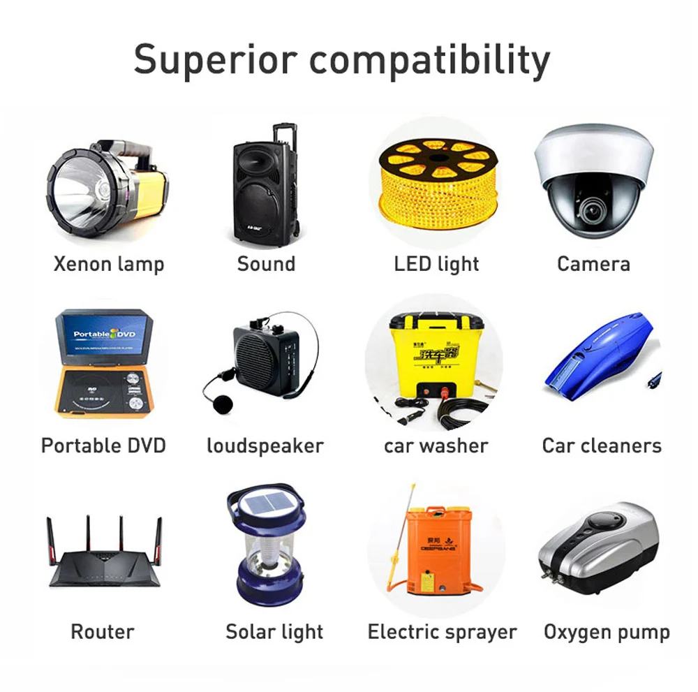 Электрические двигатели, мобильный телефон поручая, на открытом воздухе располагаться лагерем, света ксенона/фары, хандхэльд приборы, беспроводные коммуникационные устройства, контрольное оборудование, электротехническое оборудование, спасательное оборудование, света запасного освещения/ЛЭД, дорожные знаки, портативная Мелкая бытовая техника, электроинструменты, резервные источники питания автомобильного и промышленного оборудования и т. д.